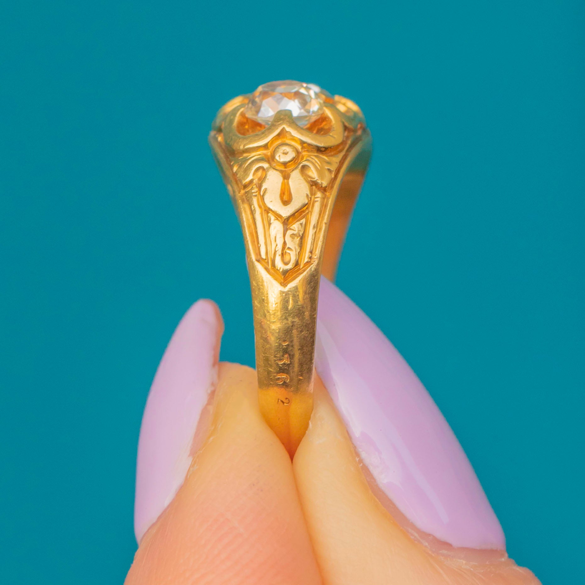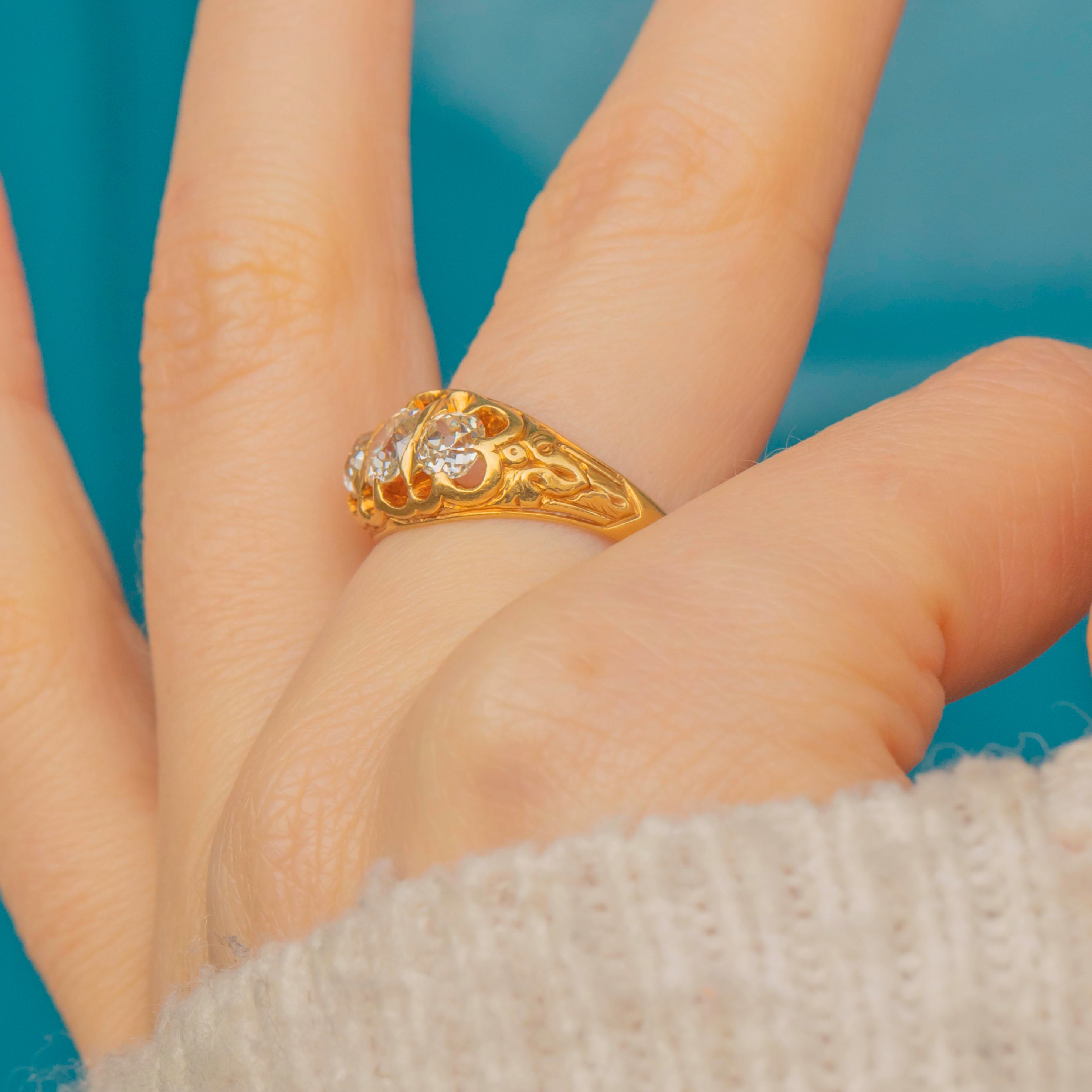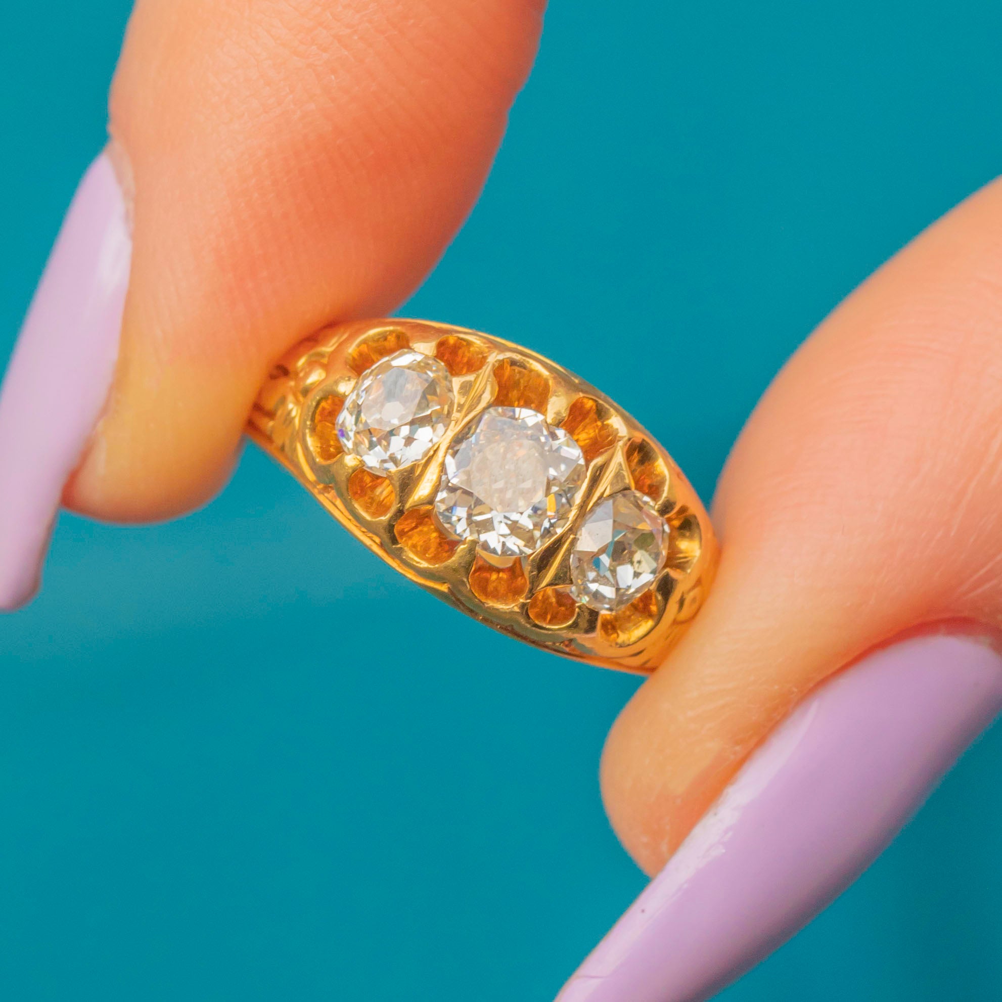 Antique French 18ct Gold Old Mine Cut Diamond Trilogy Ring 1.00ct, Carved shoulders