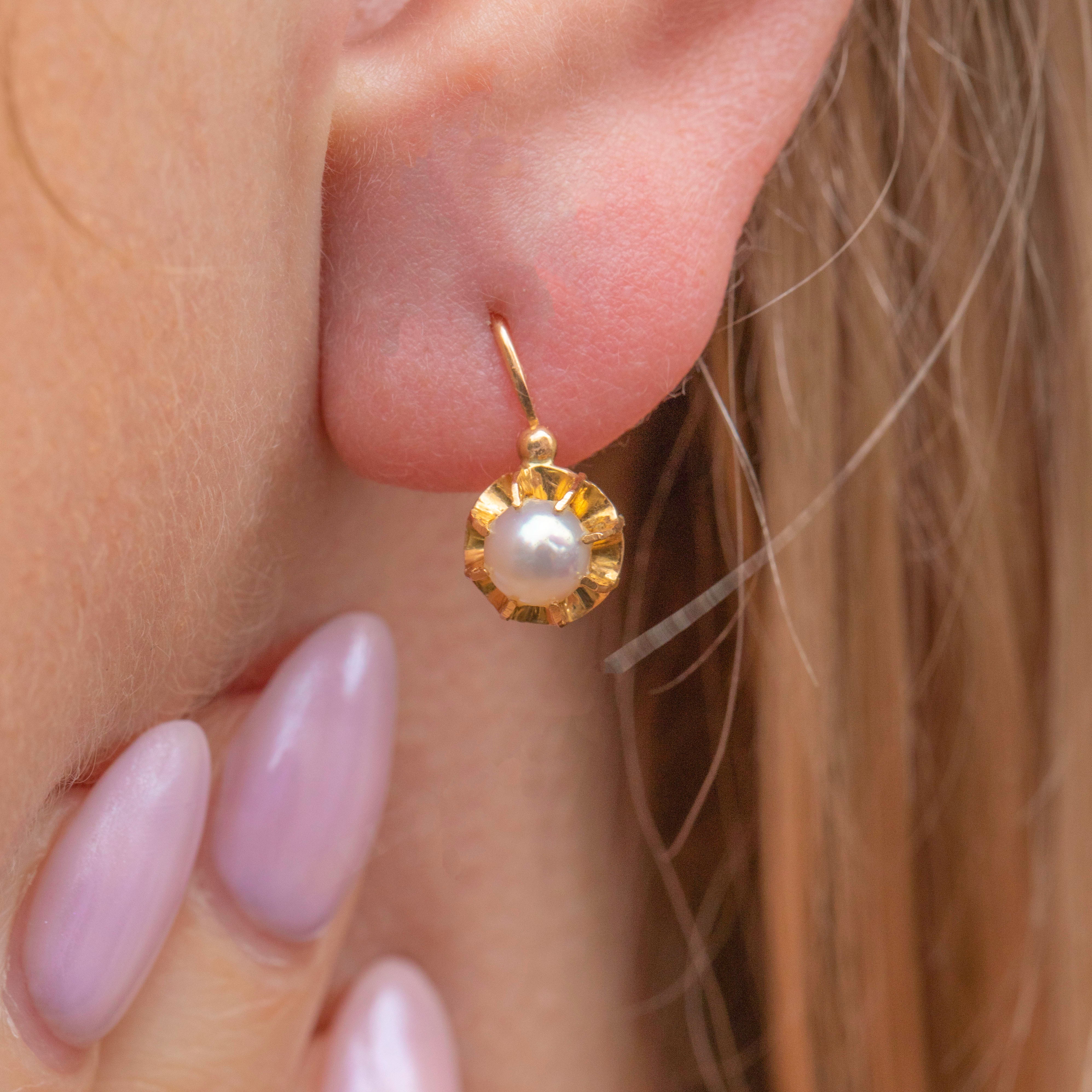 EXCELLENT. These antique French 18ct Gold Pearl dormeuse earrings are in excellent condition! The Pearls are plump, sit securely and offer a lovely soft shimmer. Their buttercup settings are perfectly intact and hold the Pearls securely. The 18ct Gold is rich and buttery throughout, with the structural integrity of them still intact. Please note these earrings are put in from the back of the lobe and once clipped into place, they are secure. We know you'll fall weak at the knees for them just like we have!