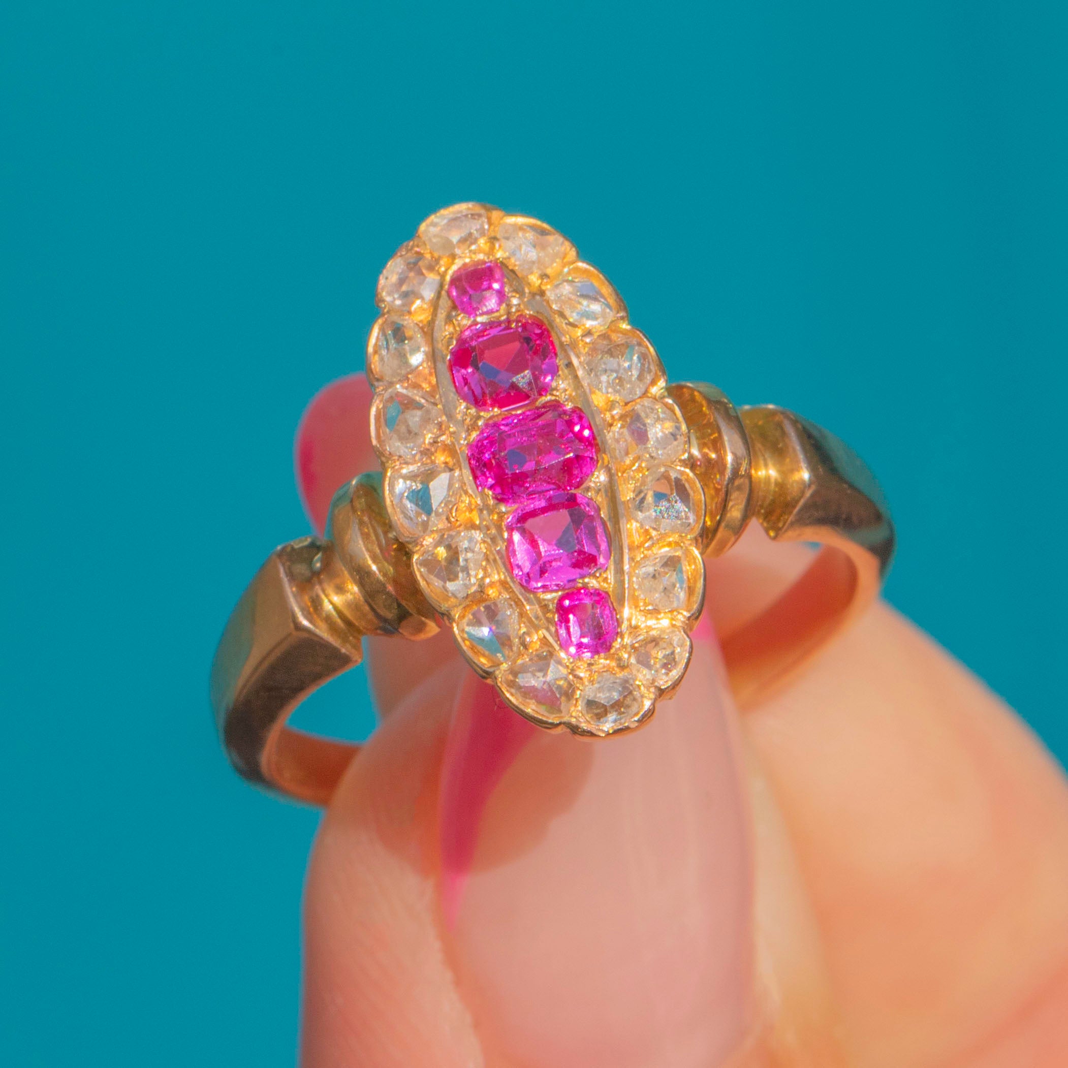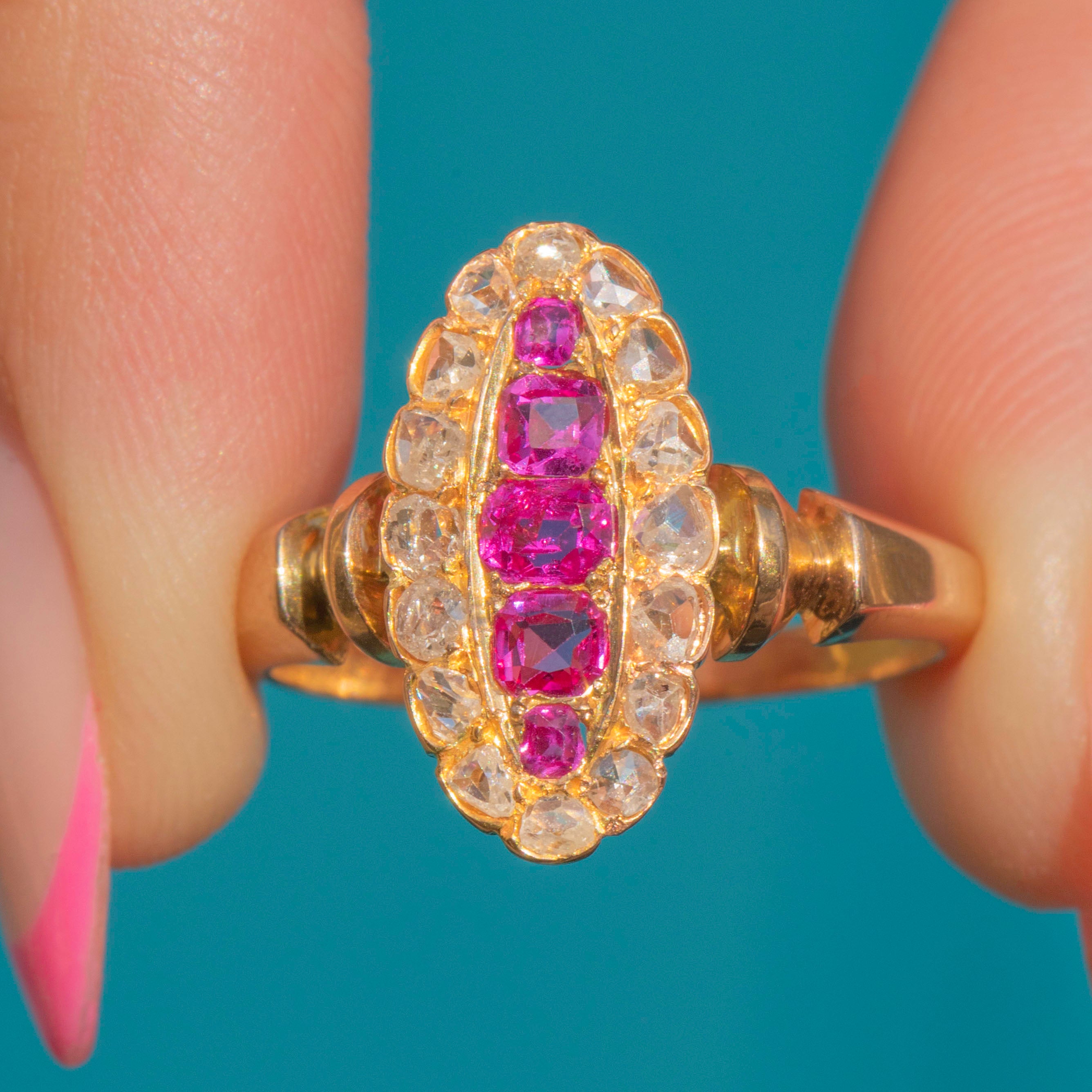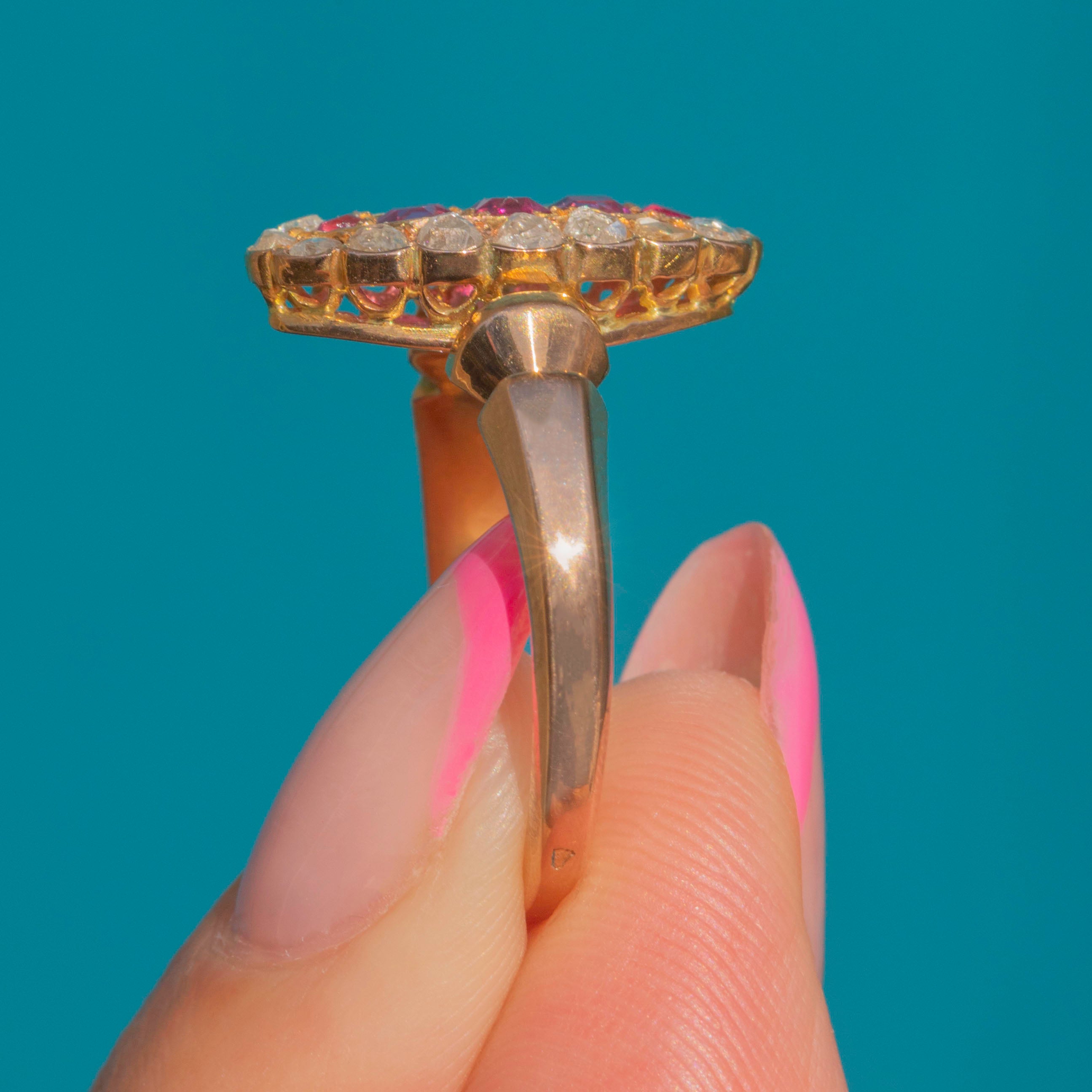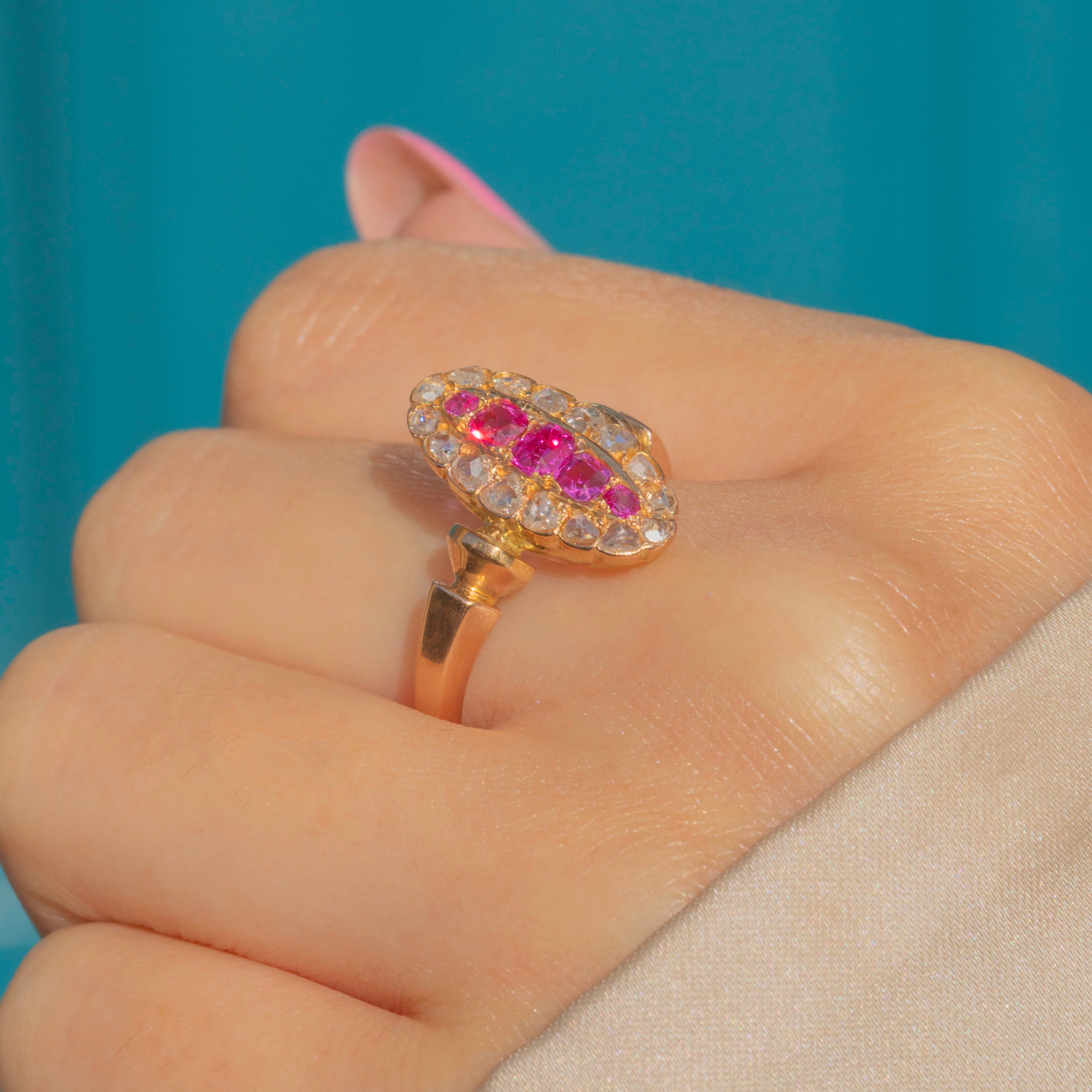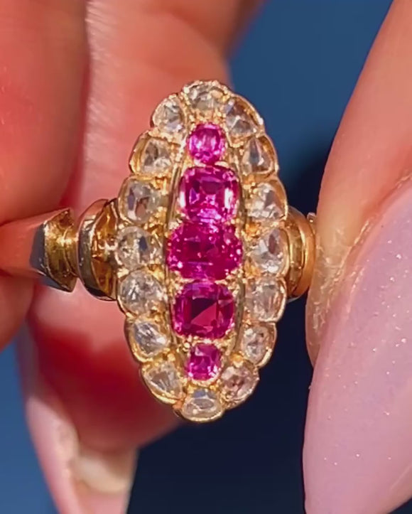 Antique French 18ct Gold Ruby Diamond Navette Cluster Ring