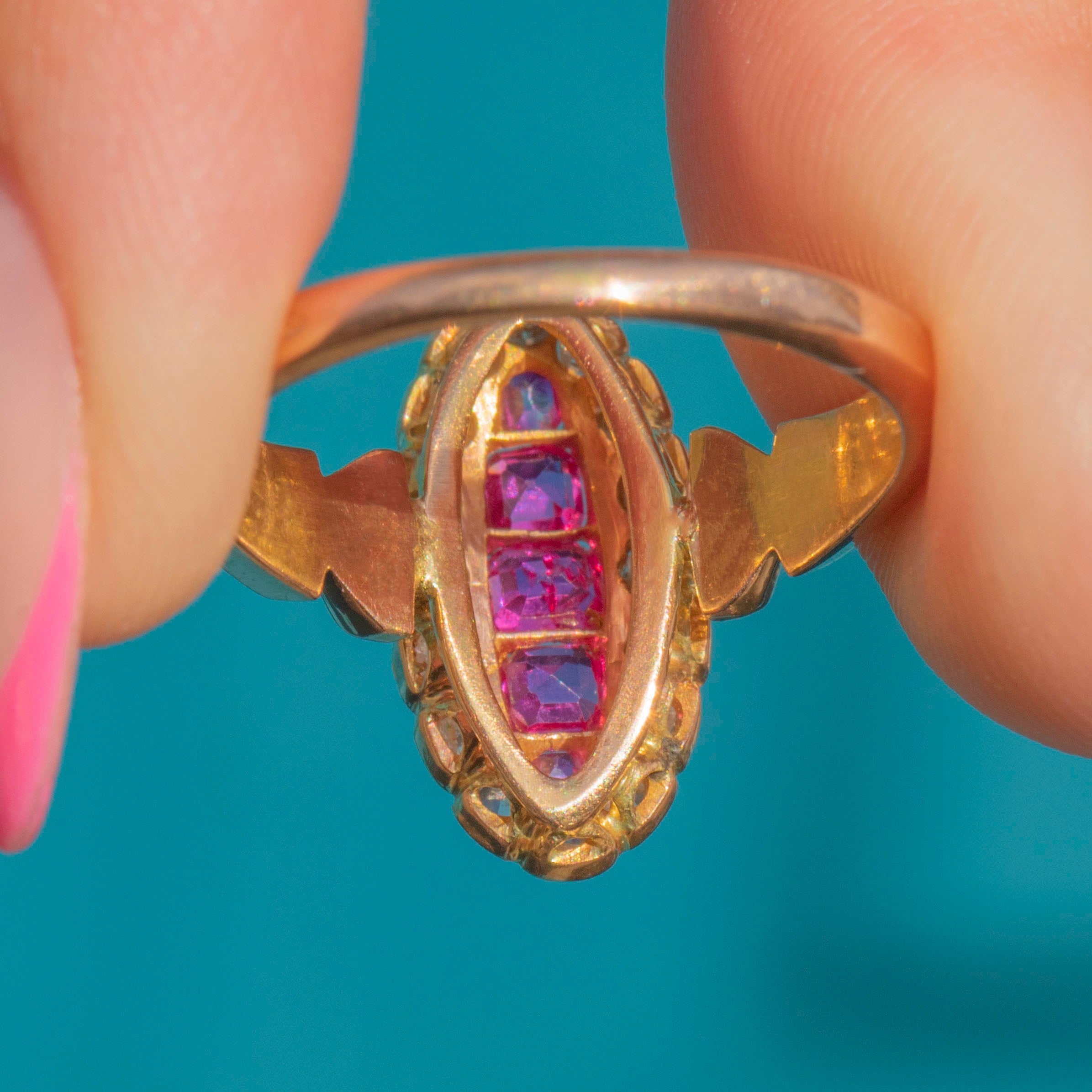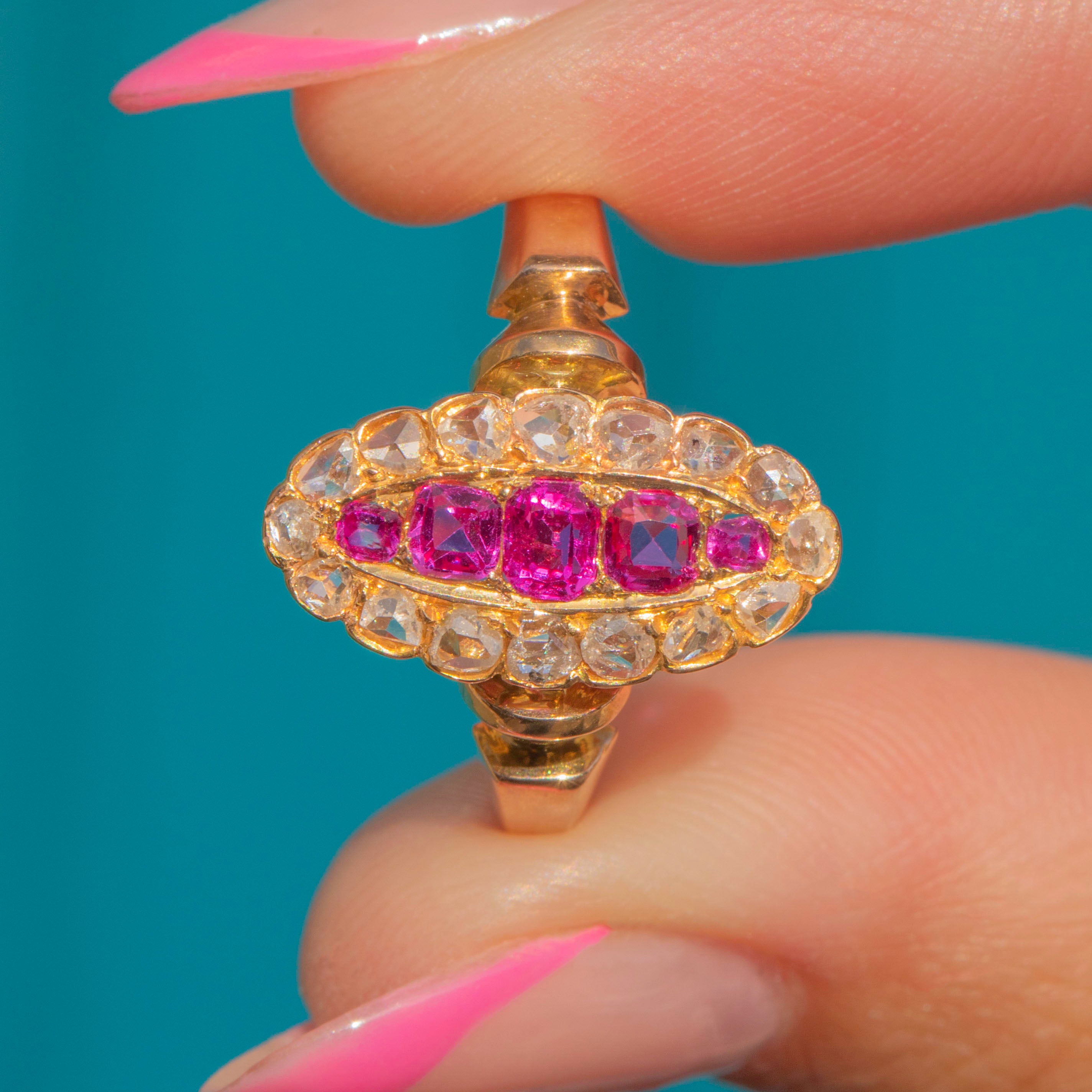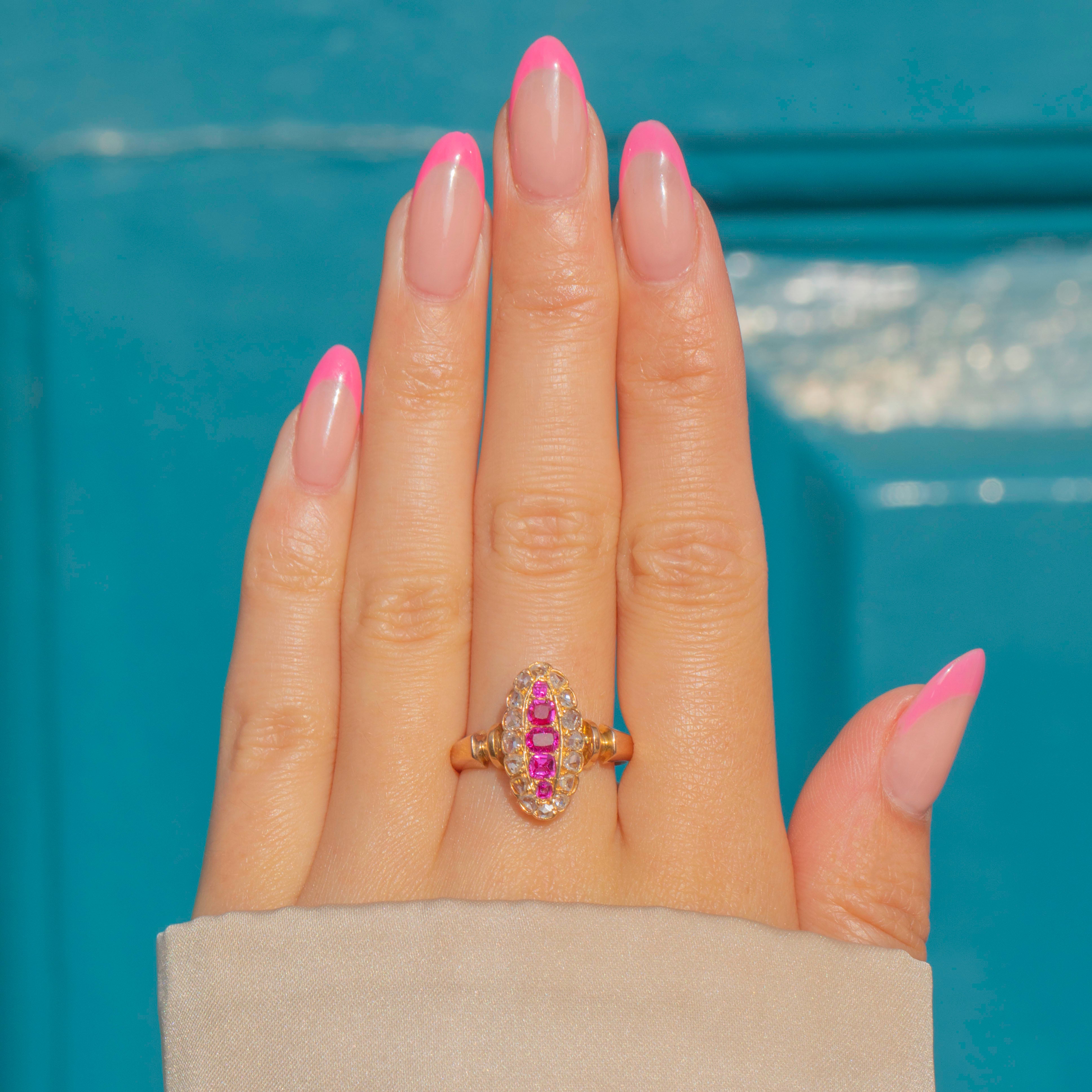 This antique French 18ct Gold Diamond Ruby navette cluster ring is simply exquisite! Crafted from lustrous 9ct Gold, she radiates timeless elegance and charm.