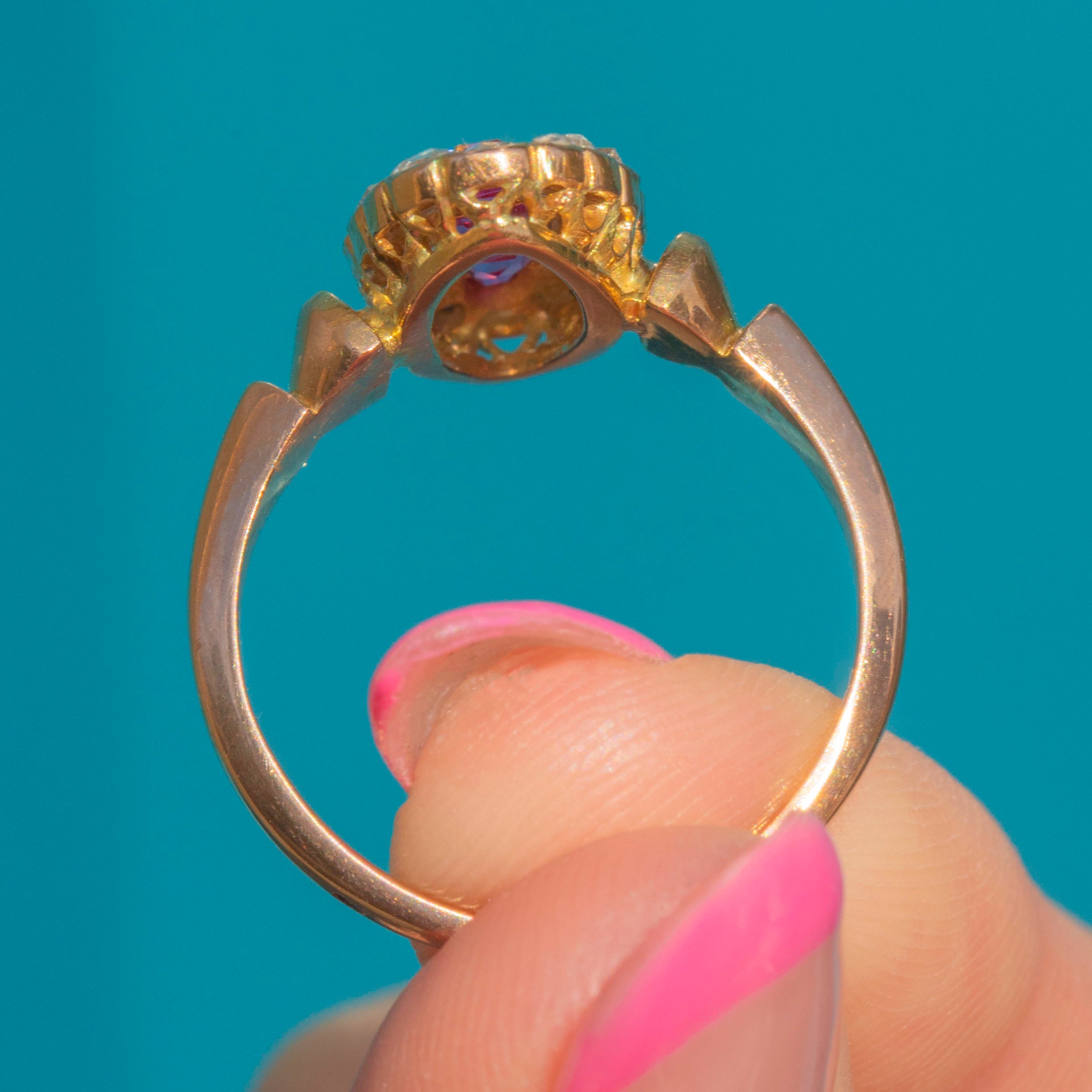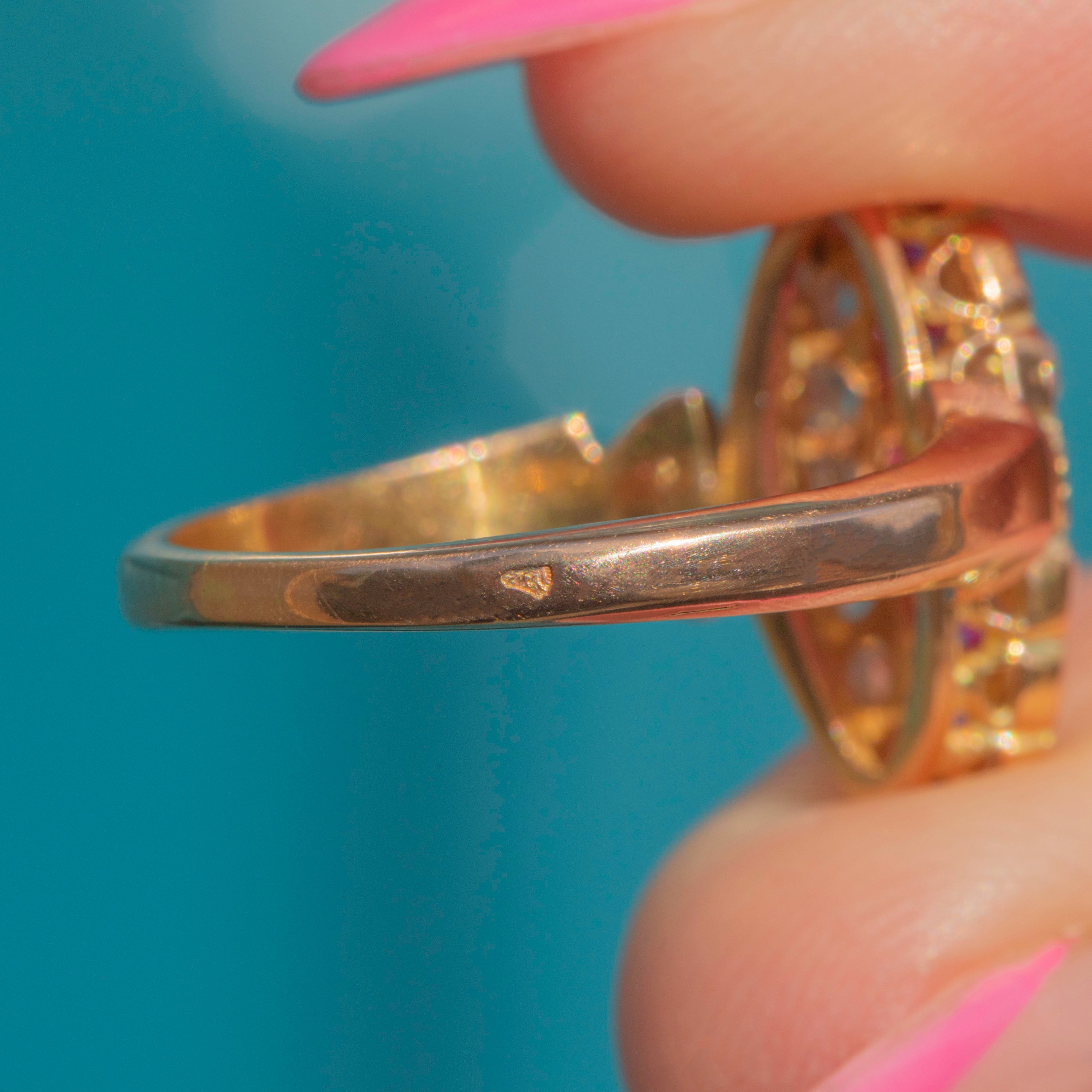Each gemstone is securely set in intricate 18ct Gold settings, creating a beautifully sophisticated ring face. Balancing striking brilliance with refined class, this Victorian Diamond Ruby ring is a truly irresistible heirloom piece!