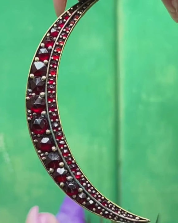 EXCELLENT. This antique Garnet crescent moon pendant is gorgeous! In excellent condition, every Garnet is present and secure, with beautifully hand-cut facets. The back of the pendant is smooth and has only a small sign of conversion from a brooch. This is a gorgeous pendant that will give you much wearing pleasure for years to come!