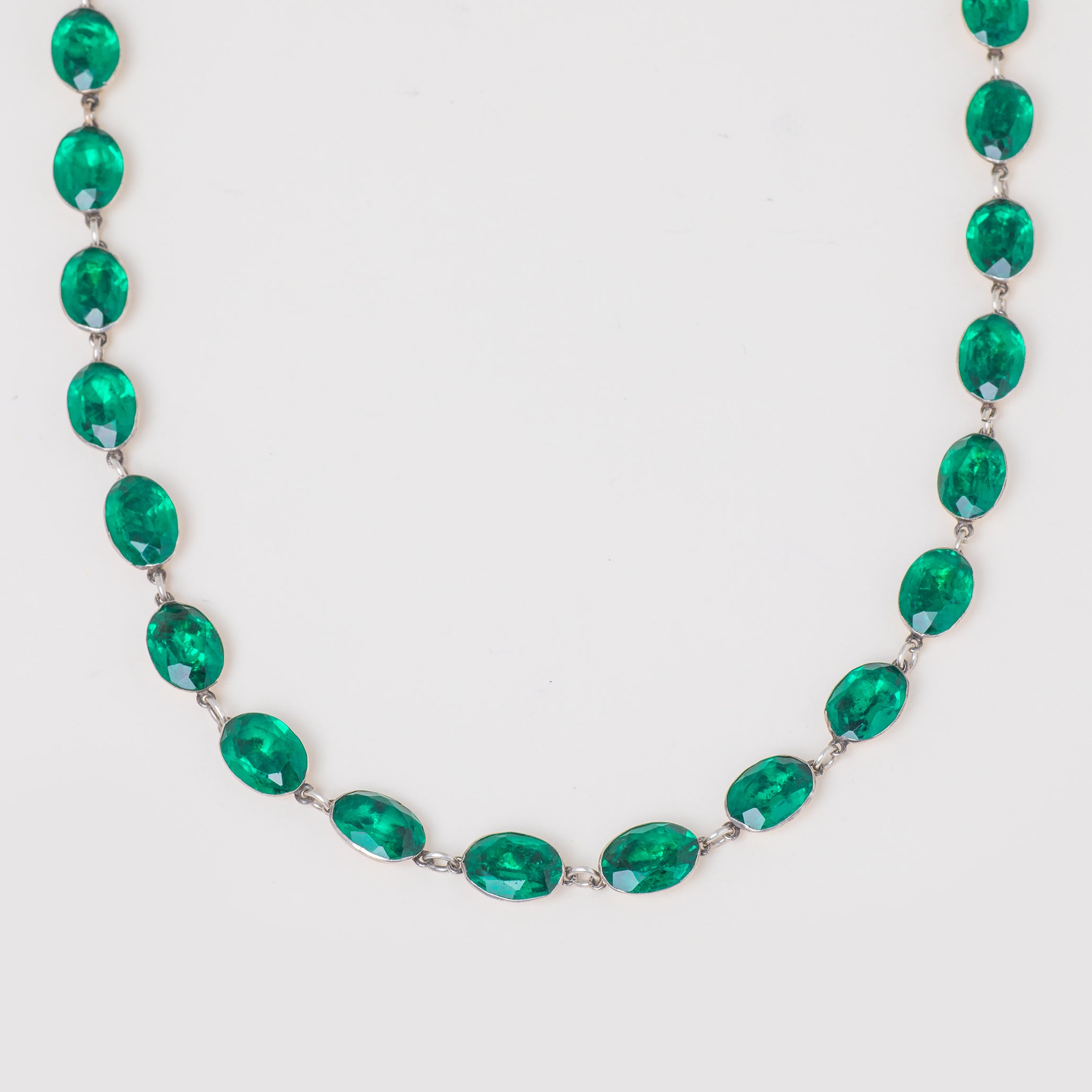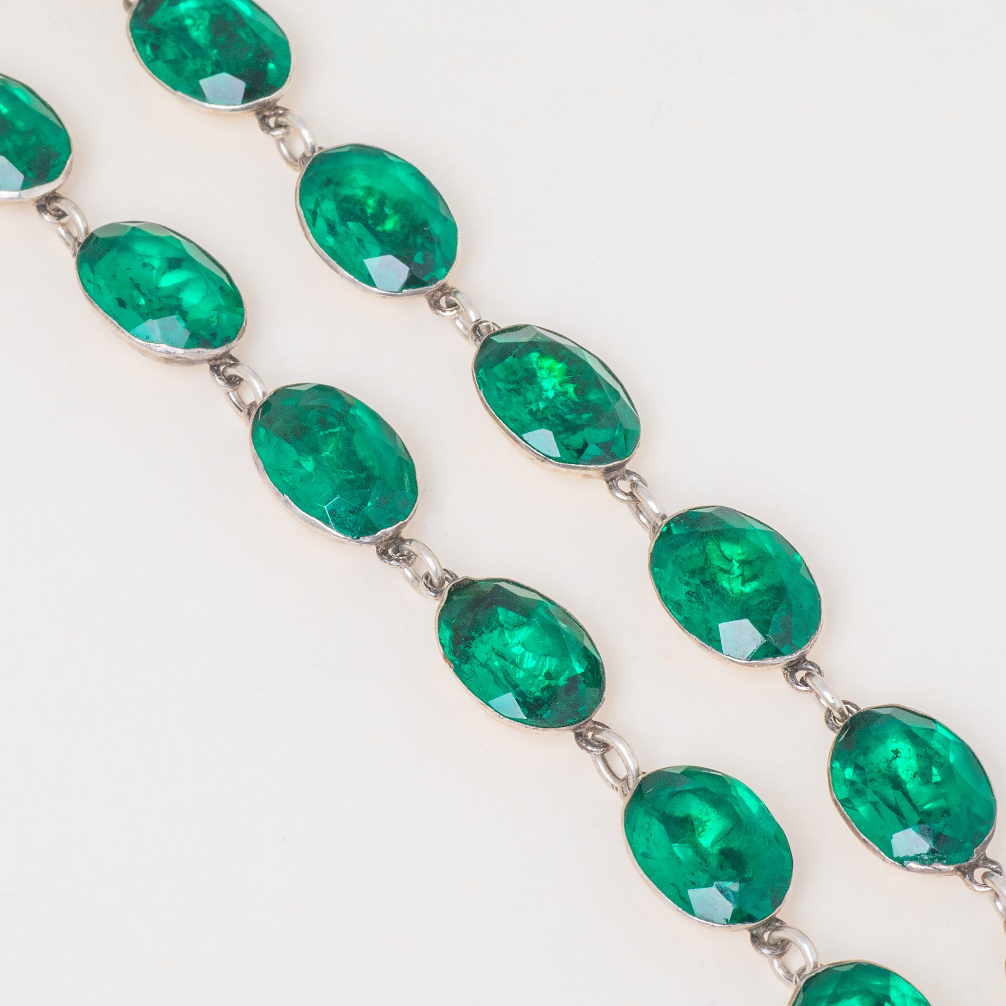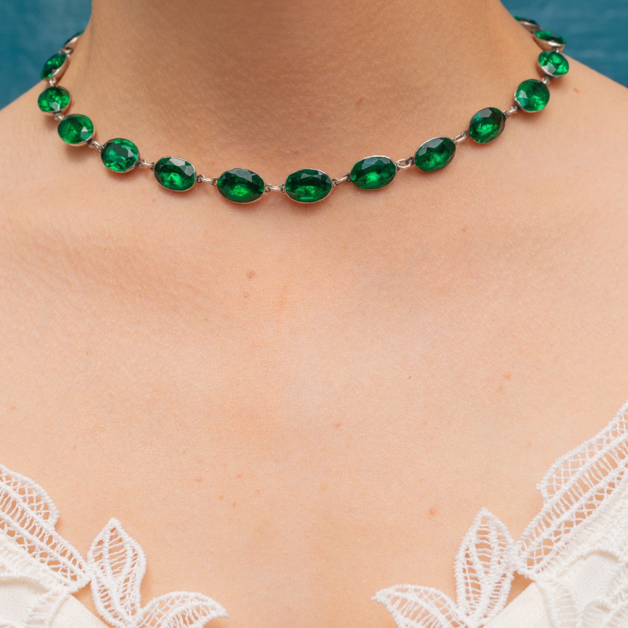 With domed backs crafted from lustrous Sterling Silver, this riviere necklace provides the utmost comfort as she is worn. With even her clasp showcasing a radiant green Paste, the attention to detail is second to none!