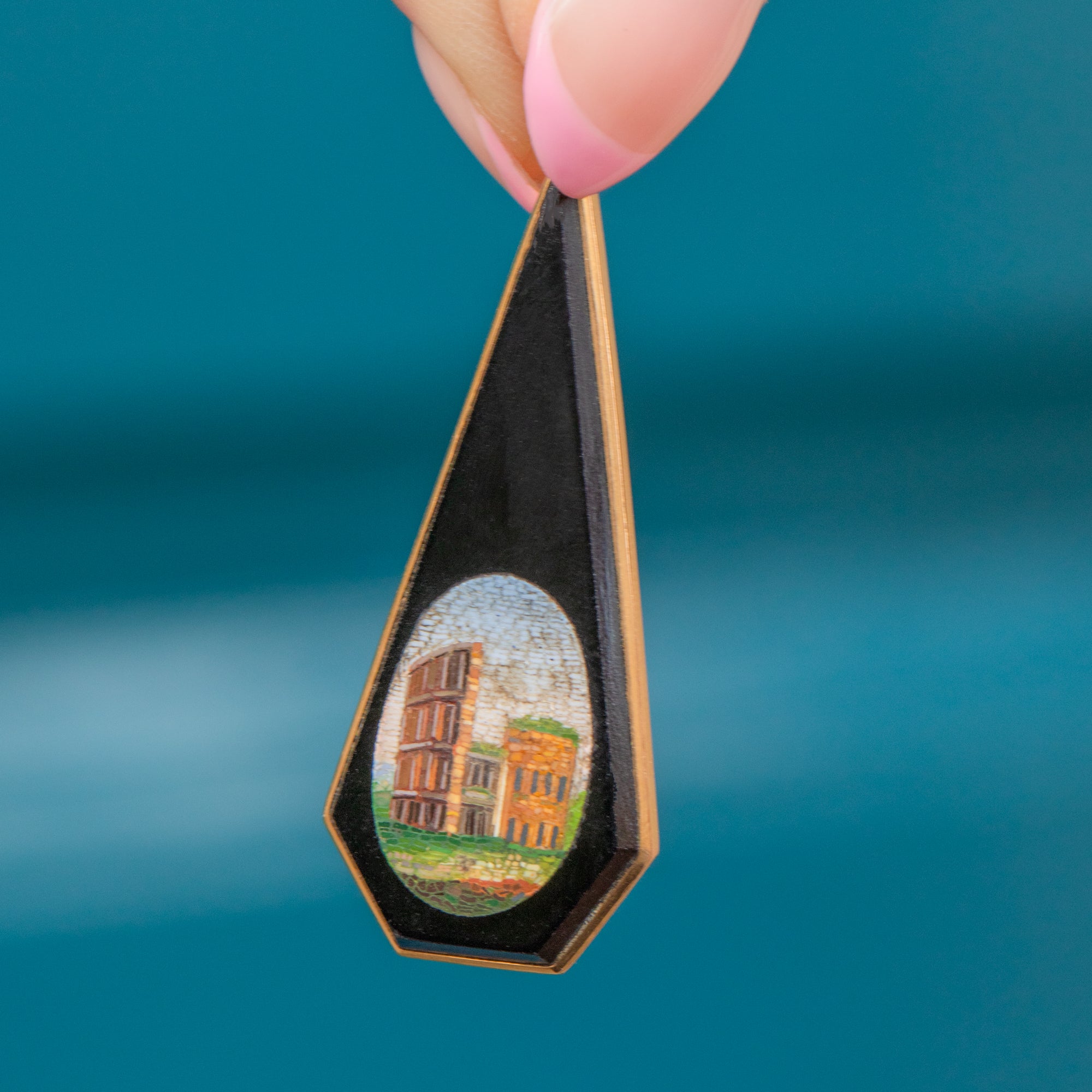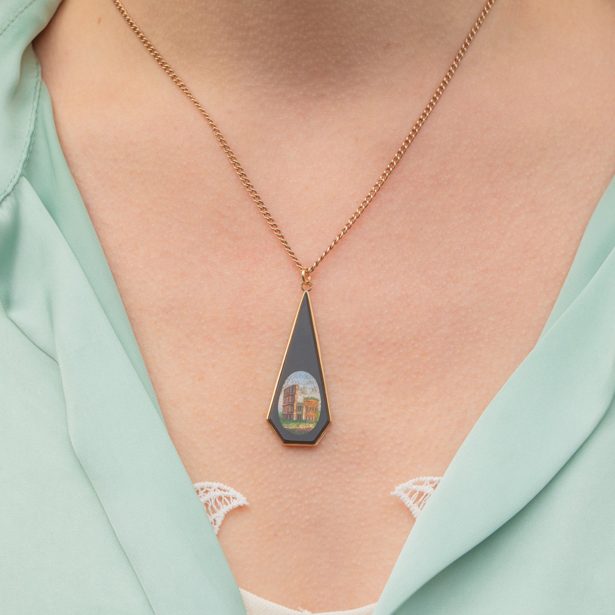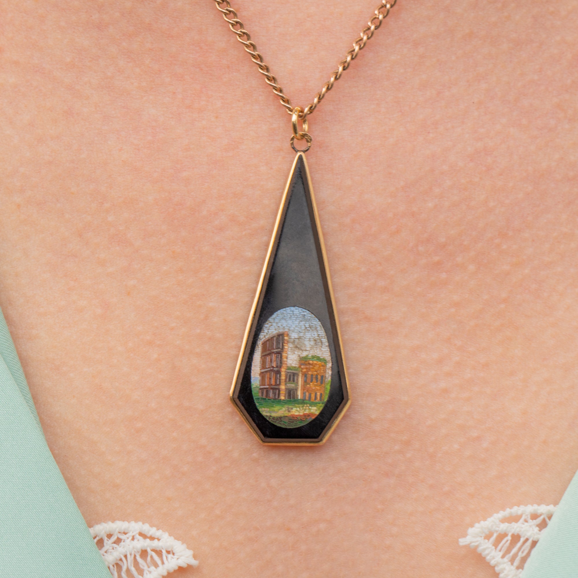 Antique Italian 18ct Gold Onyx Micro Mosaic Pendant, Rome Colosseum