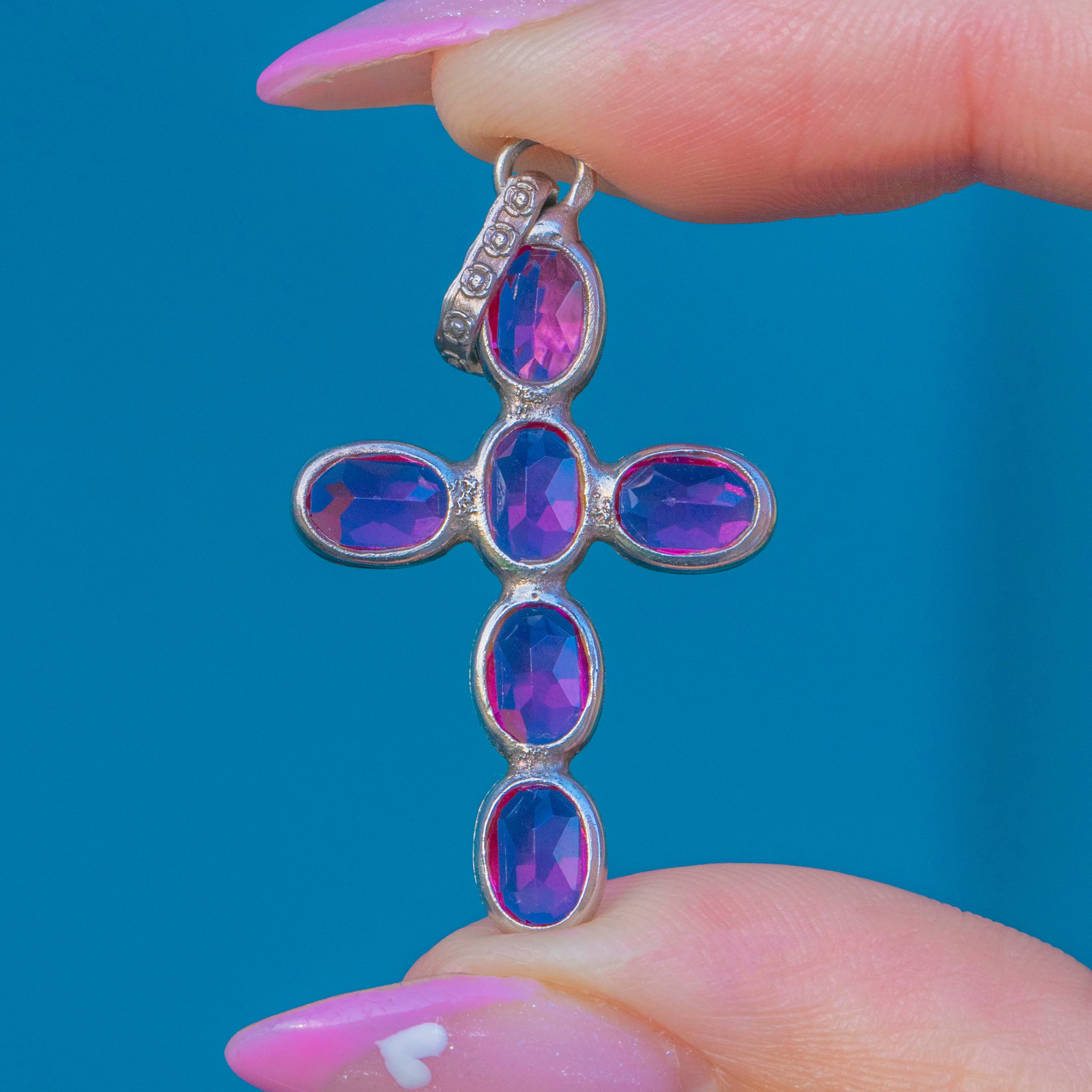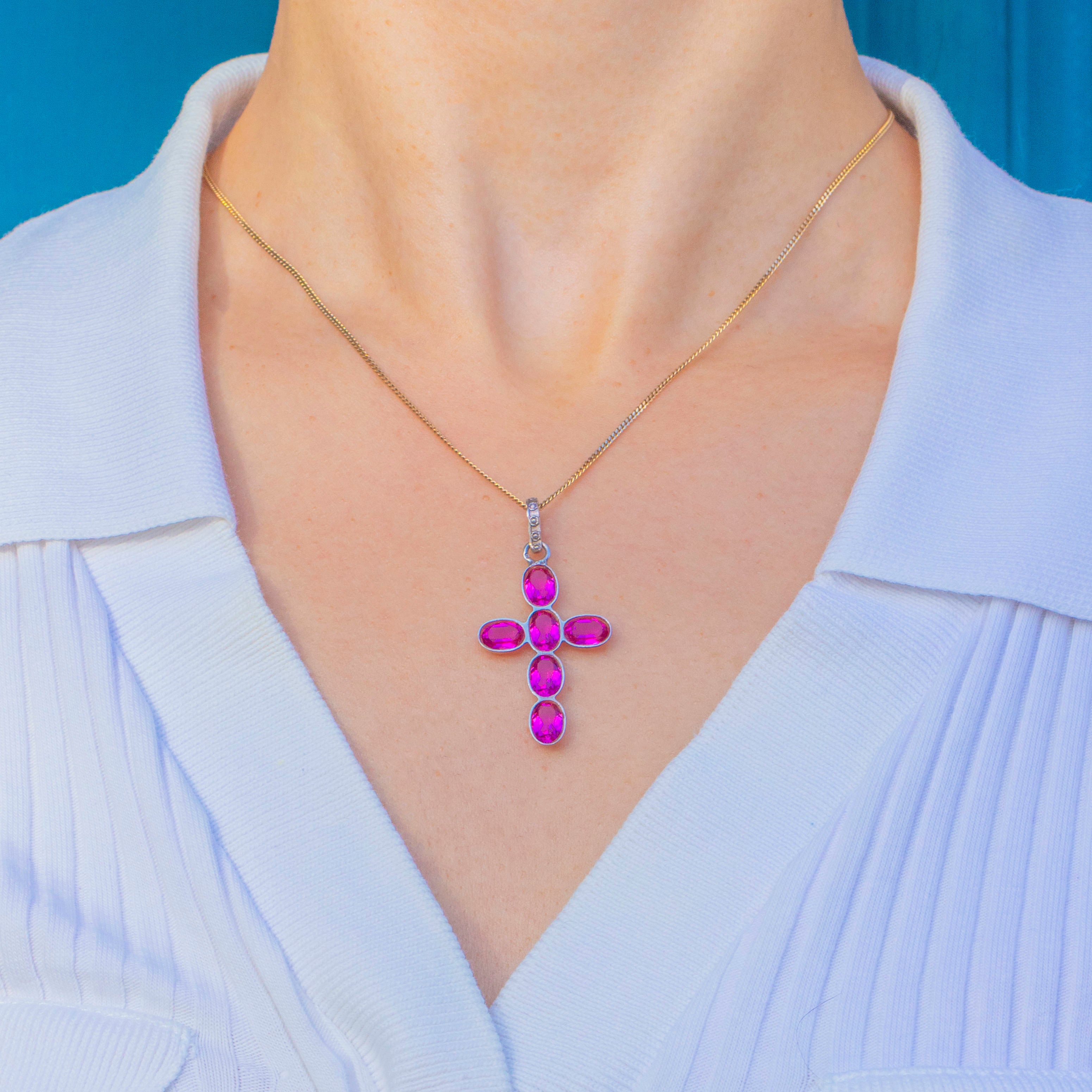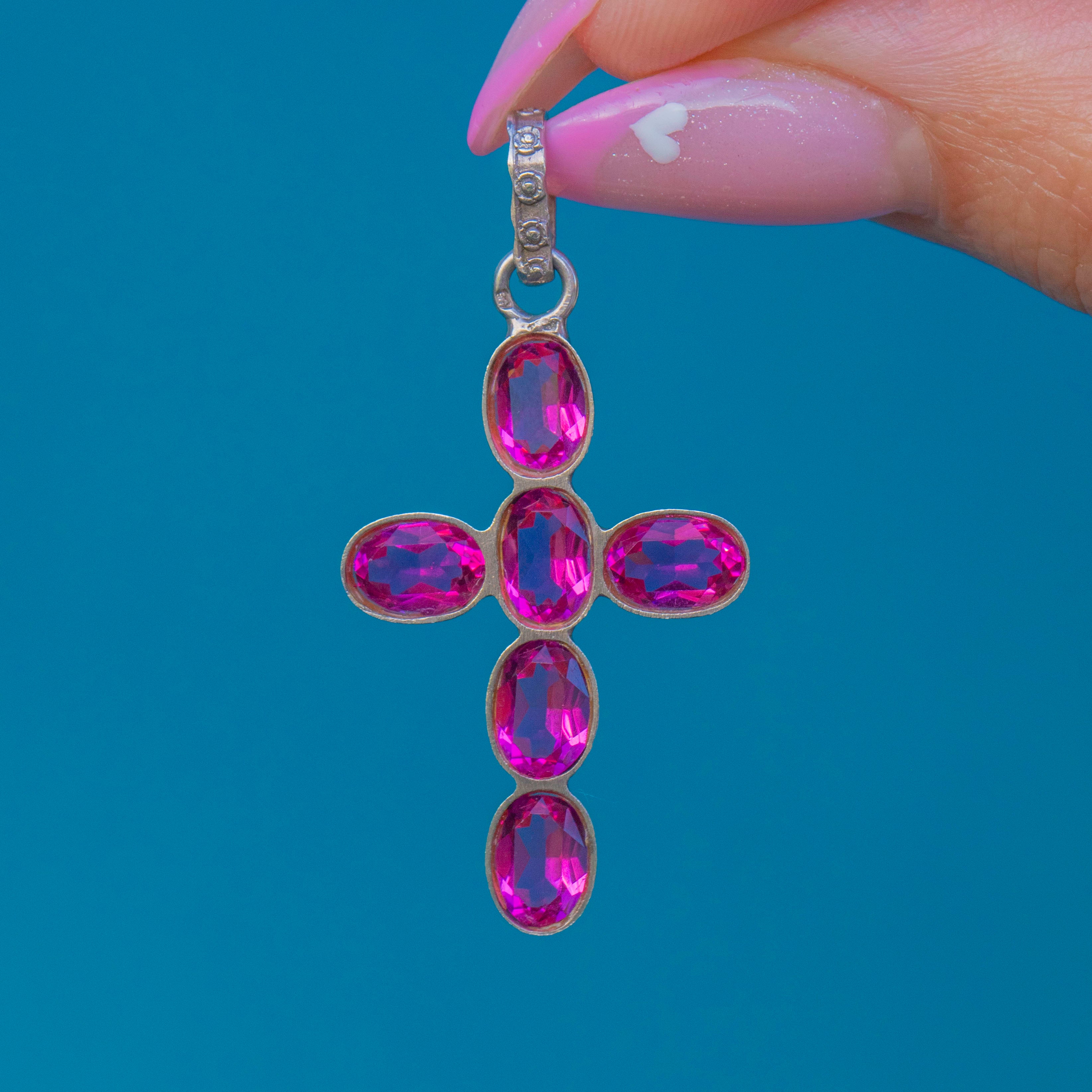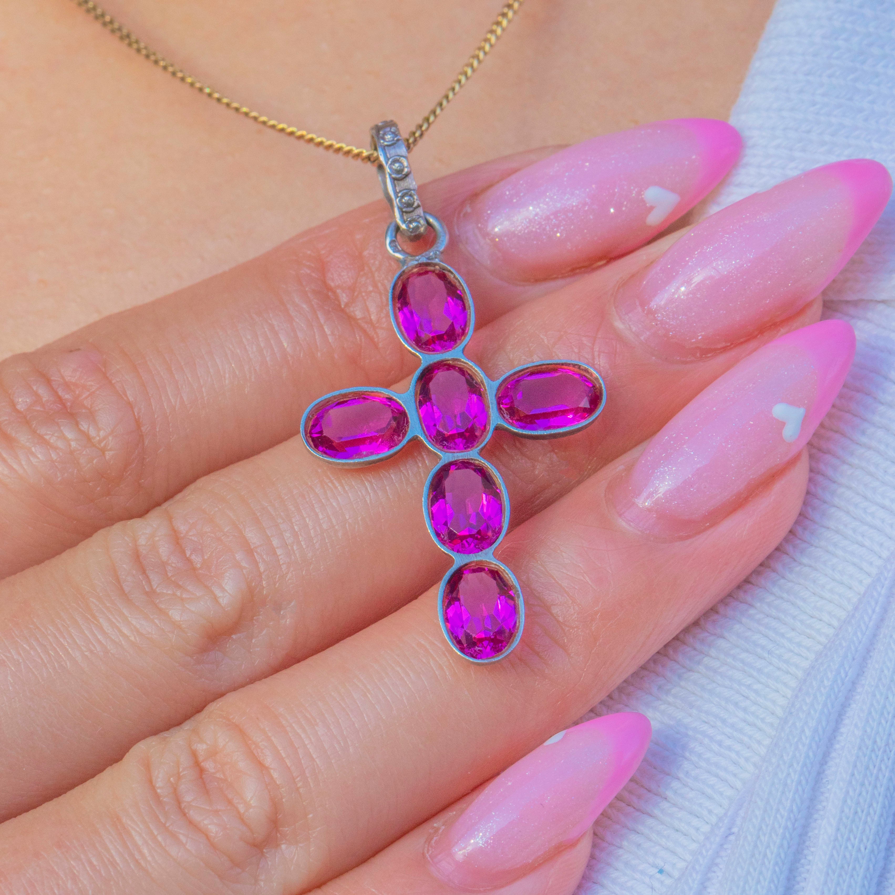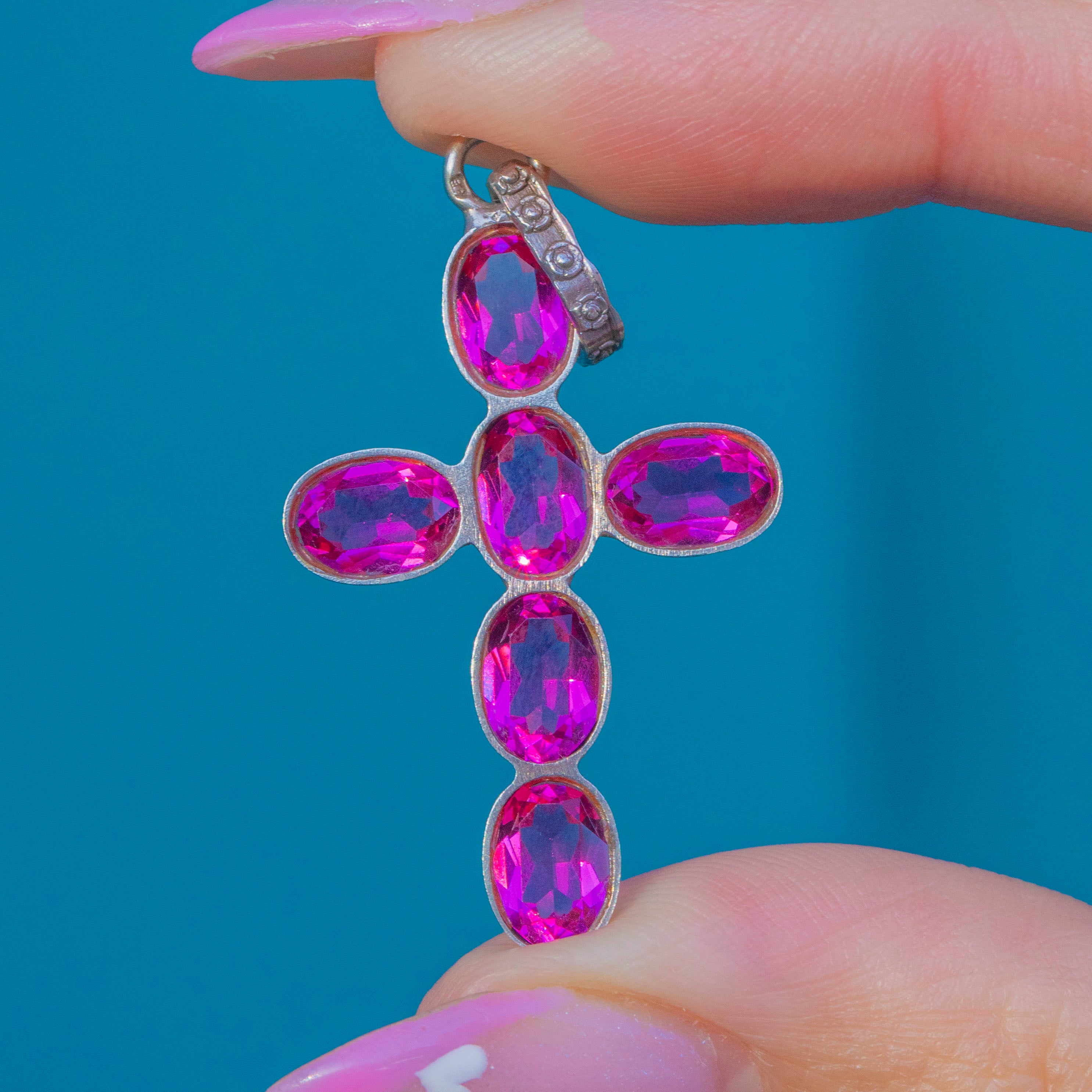 This charming Antique Pink Paste Cross dates to around 1900, crafted in Silver and set with glittering oval pink Paste stones. The hot pink tones of the stones contrast beautifully with the cool Silver setting, creating a romantic and feminine piece typical of late Victorian or Edwardian design.