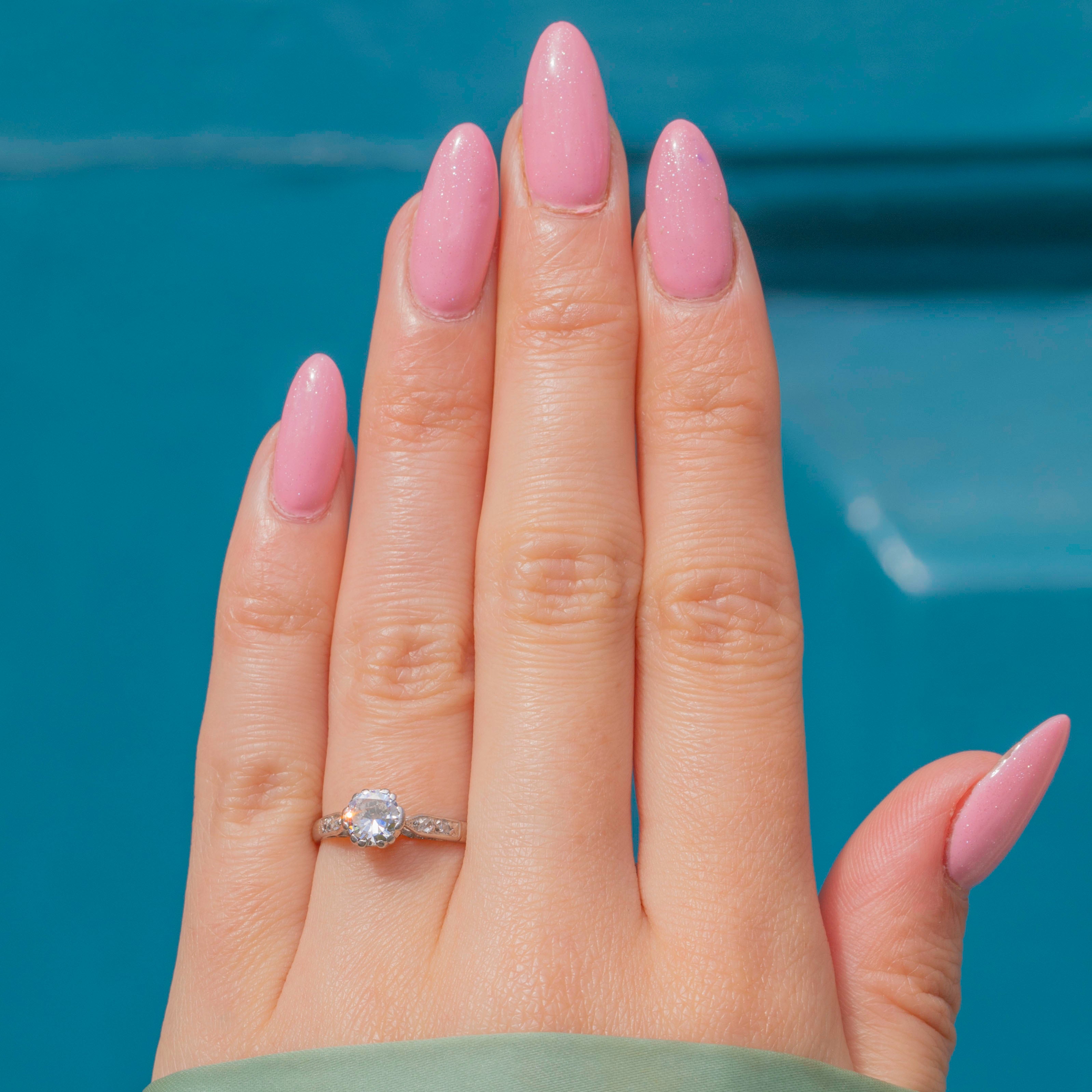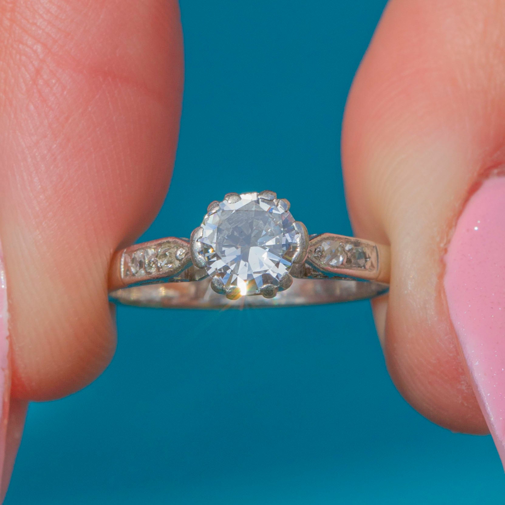 The central old European-cut Diamond is F/G colour and VS-si clarity, so is a rare bright white and so charming! Displayed in stylistic double claws and held proudly from the finger in a decorative basket setting, allowing the light to stream through from every angle.