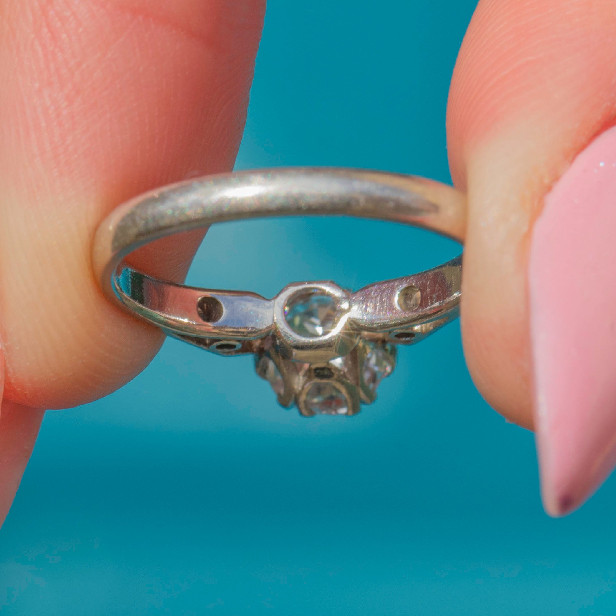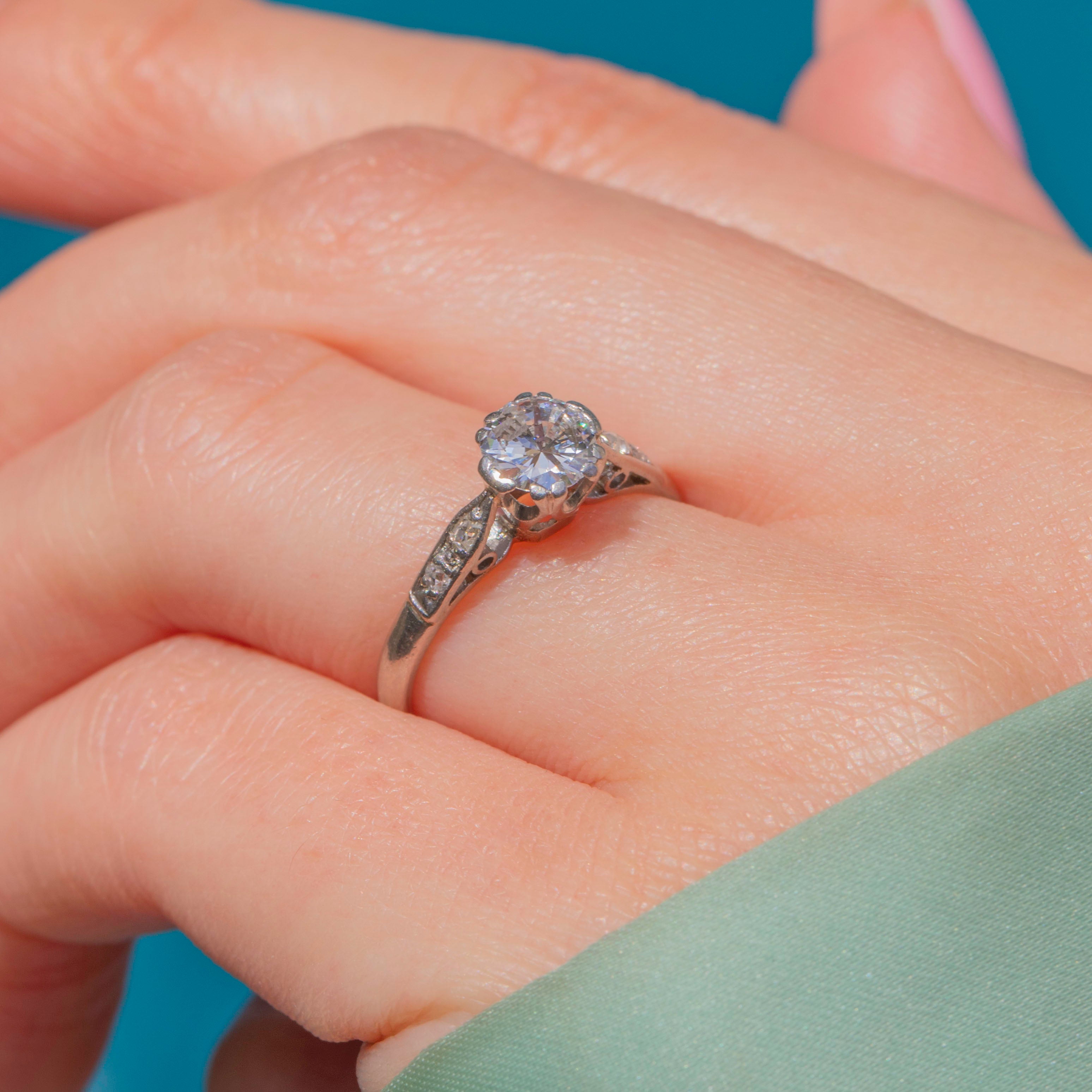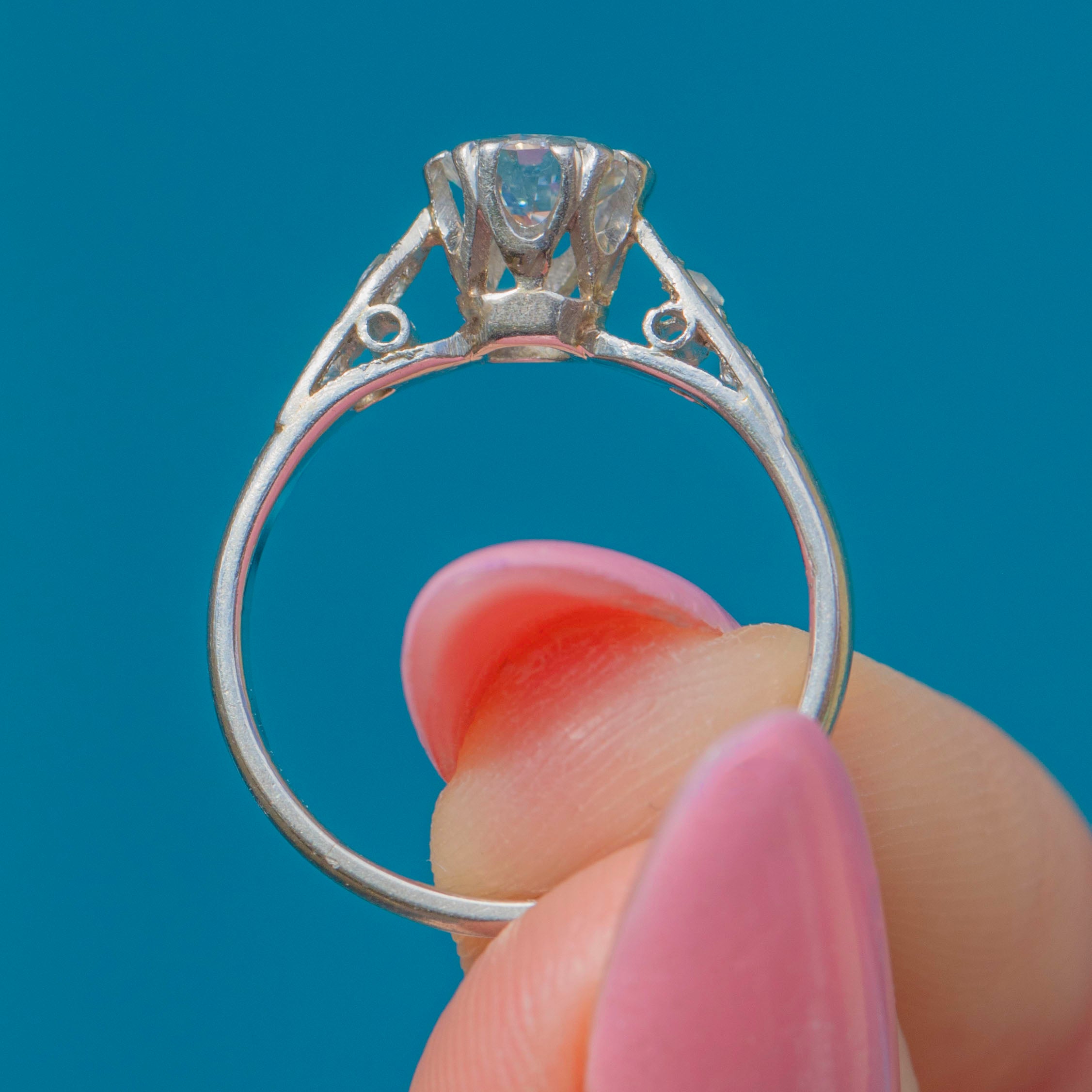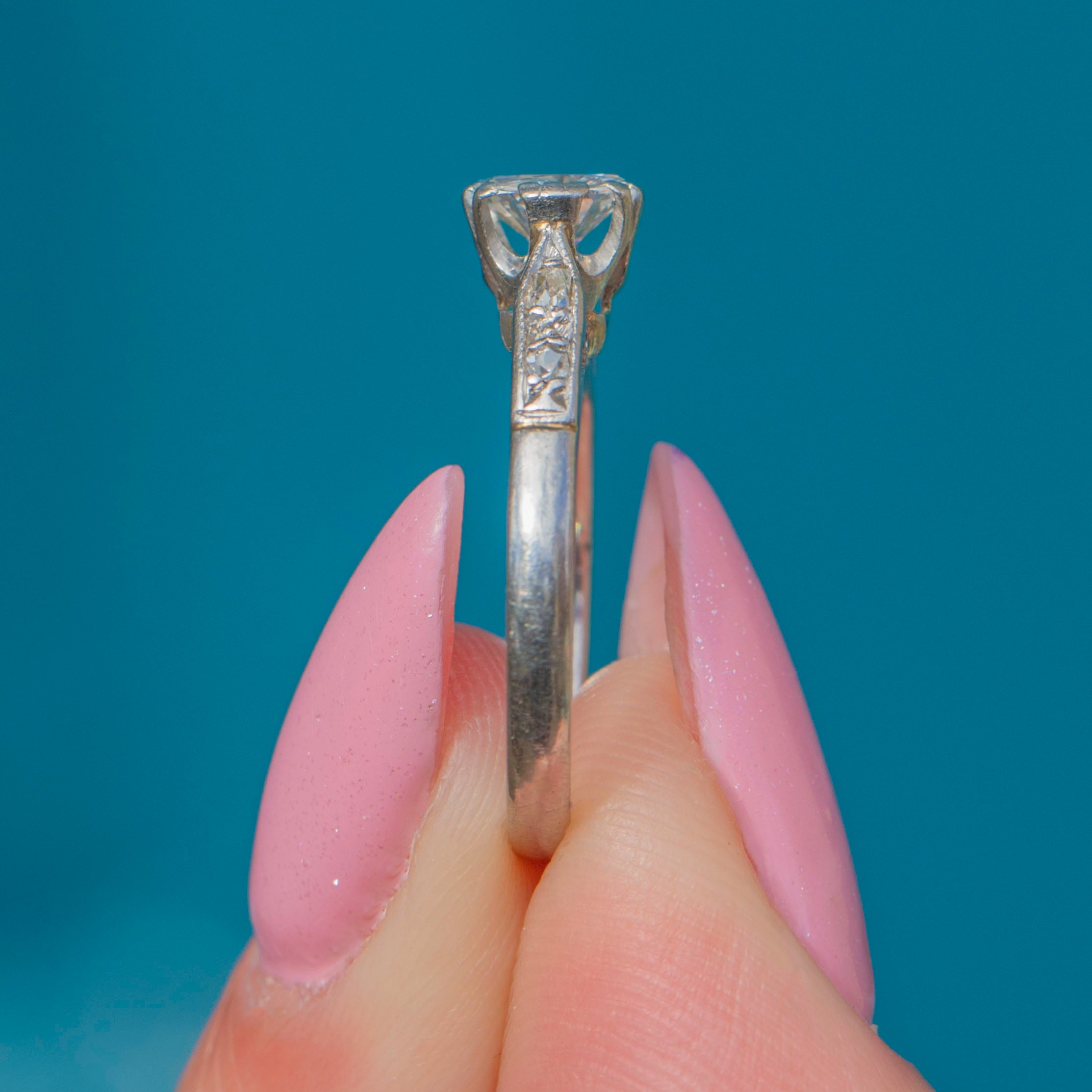If you are looking for the ultimate engagement ring choice, look no further than this antique Platinum old European-cut Diamond ring! Crafted from solid Platinum, this outstanding Art Deco ring boasts a crisp 0.50ct Diamond that scintillates from every angle.