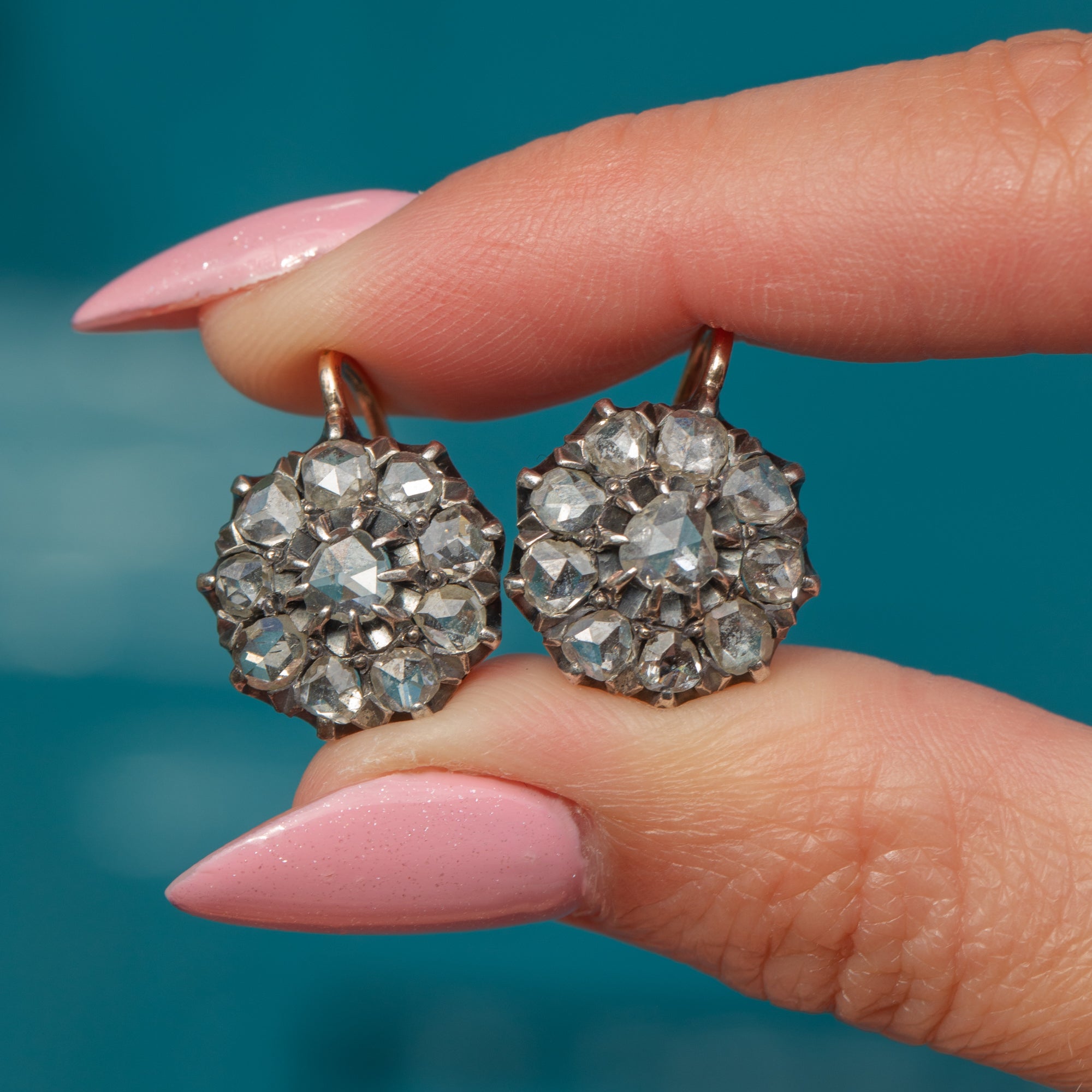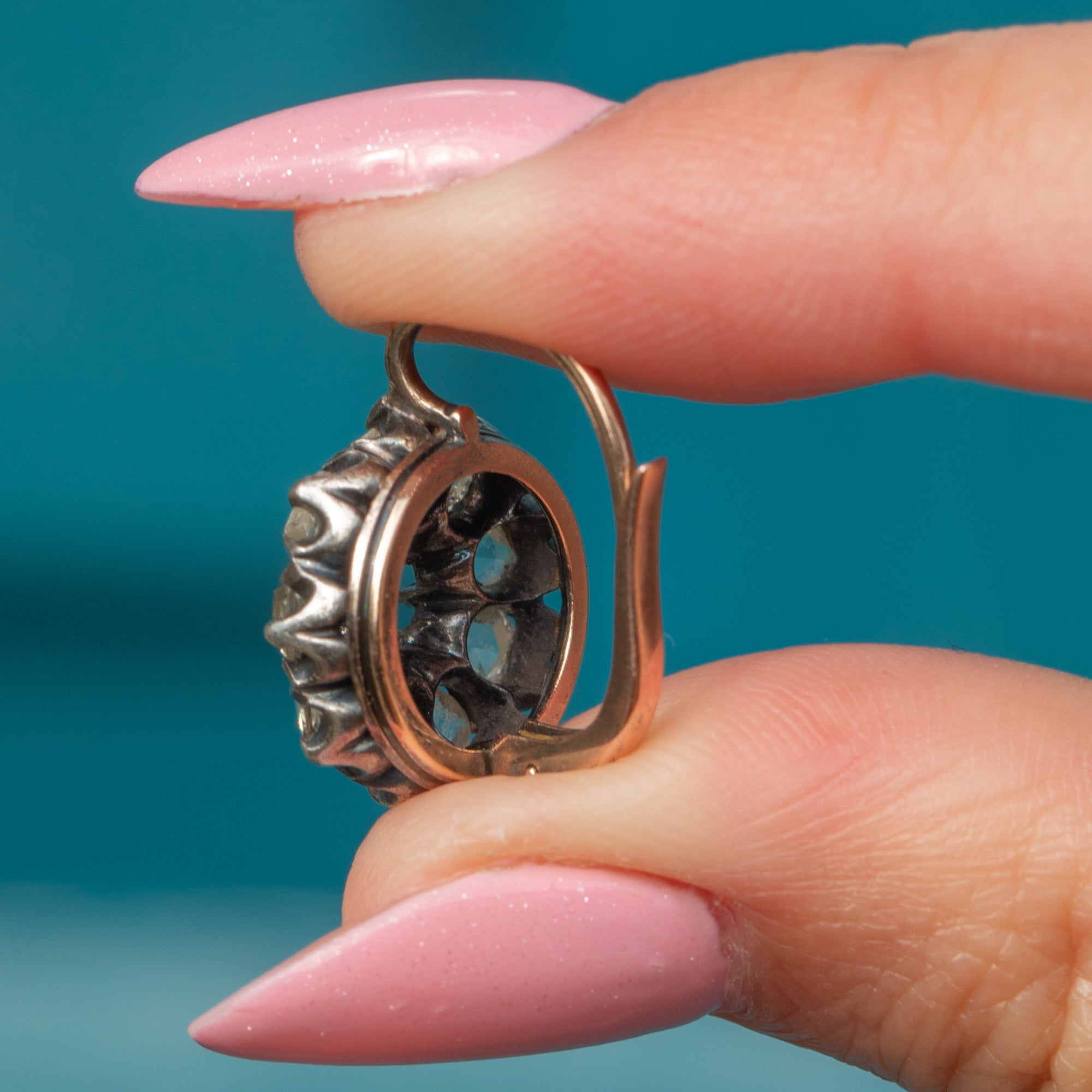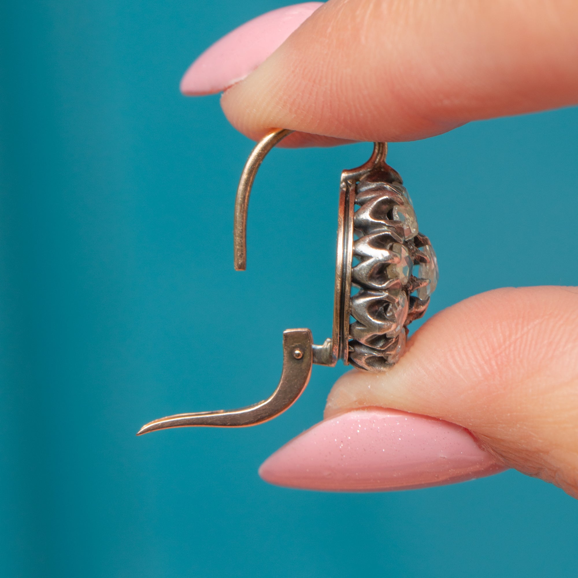 Antique Rose-Cut Diamond Cluster Lever-Back Earrings 1.40ct, 14ct Gold & Silver