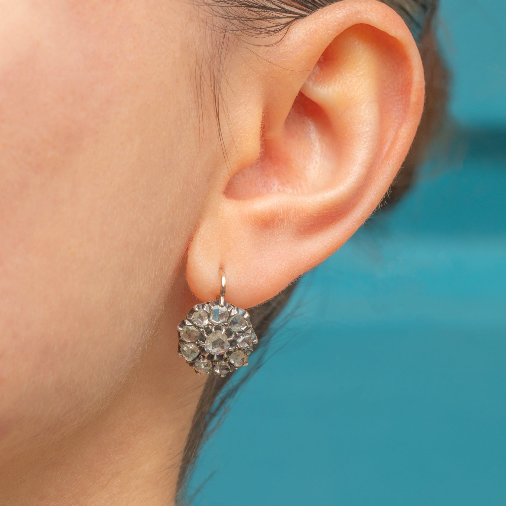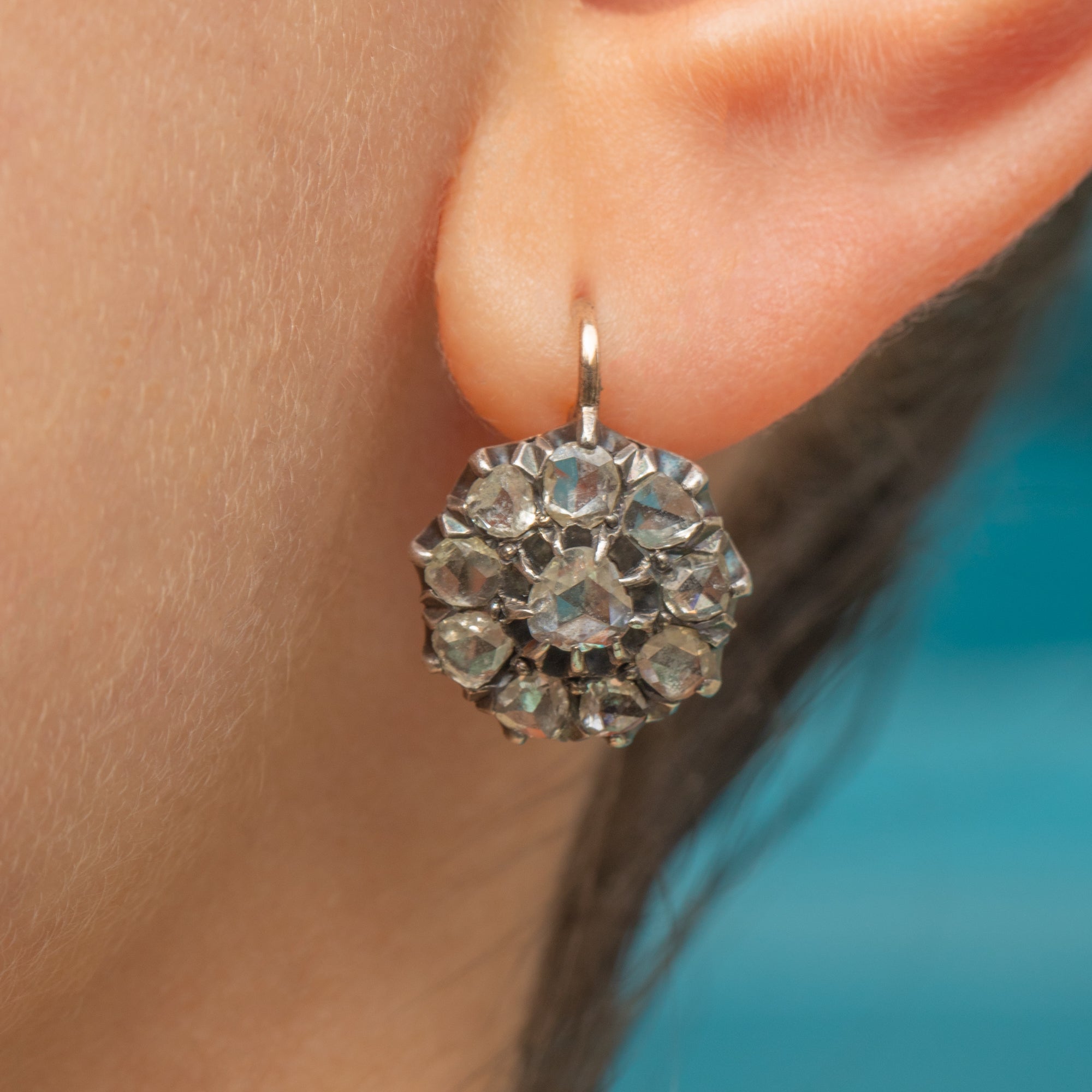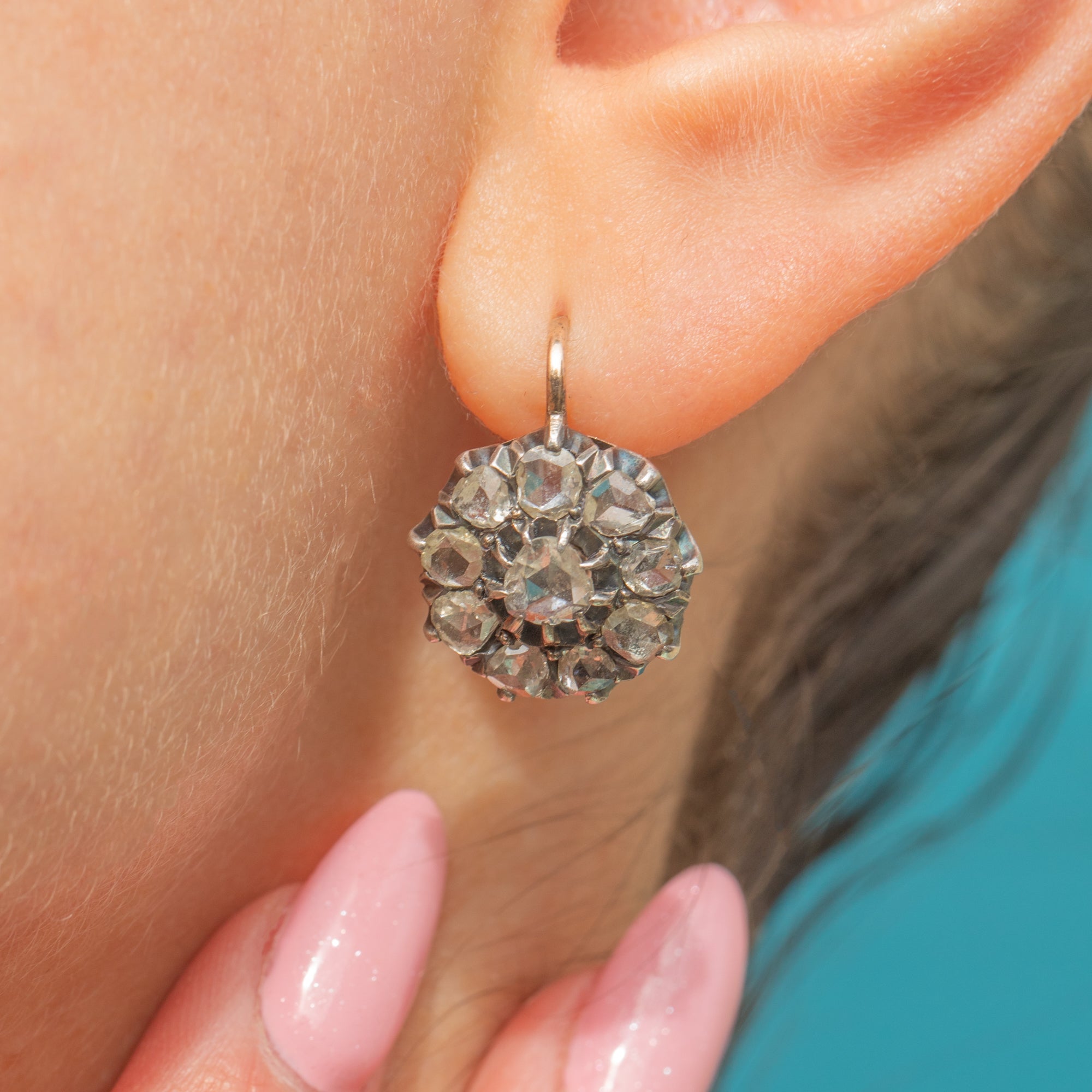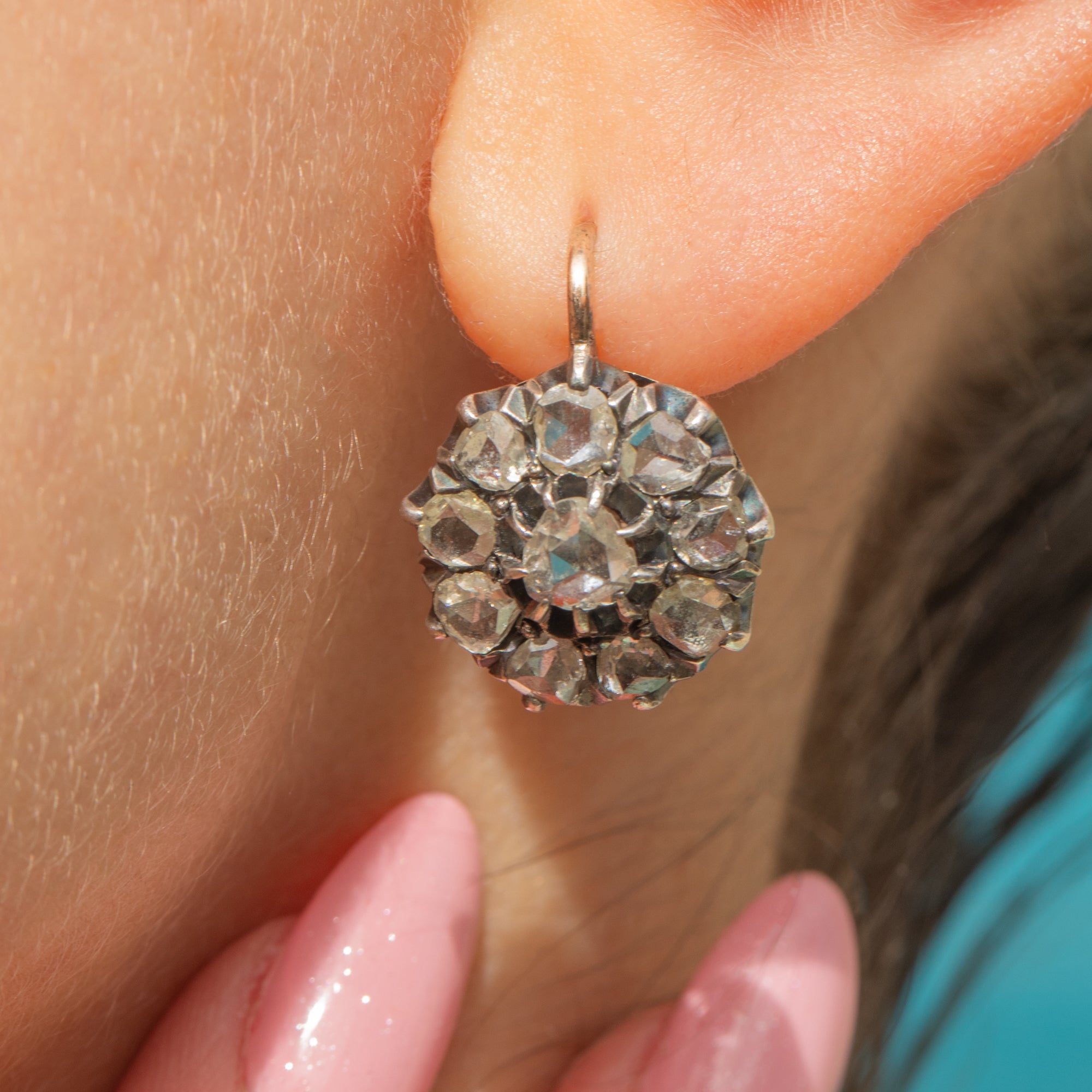 Antique Rose-Cut Diamond Cluster Lever-Back Earrings 1.40ct, 14ct Gold & Silver