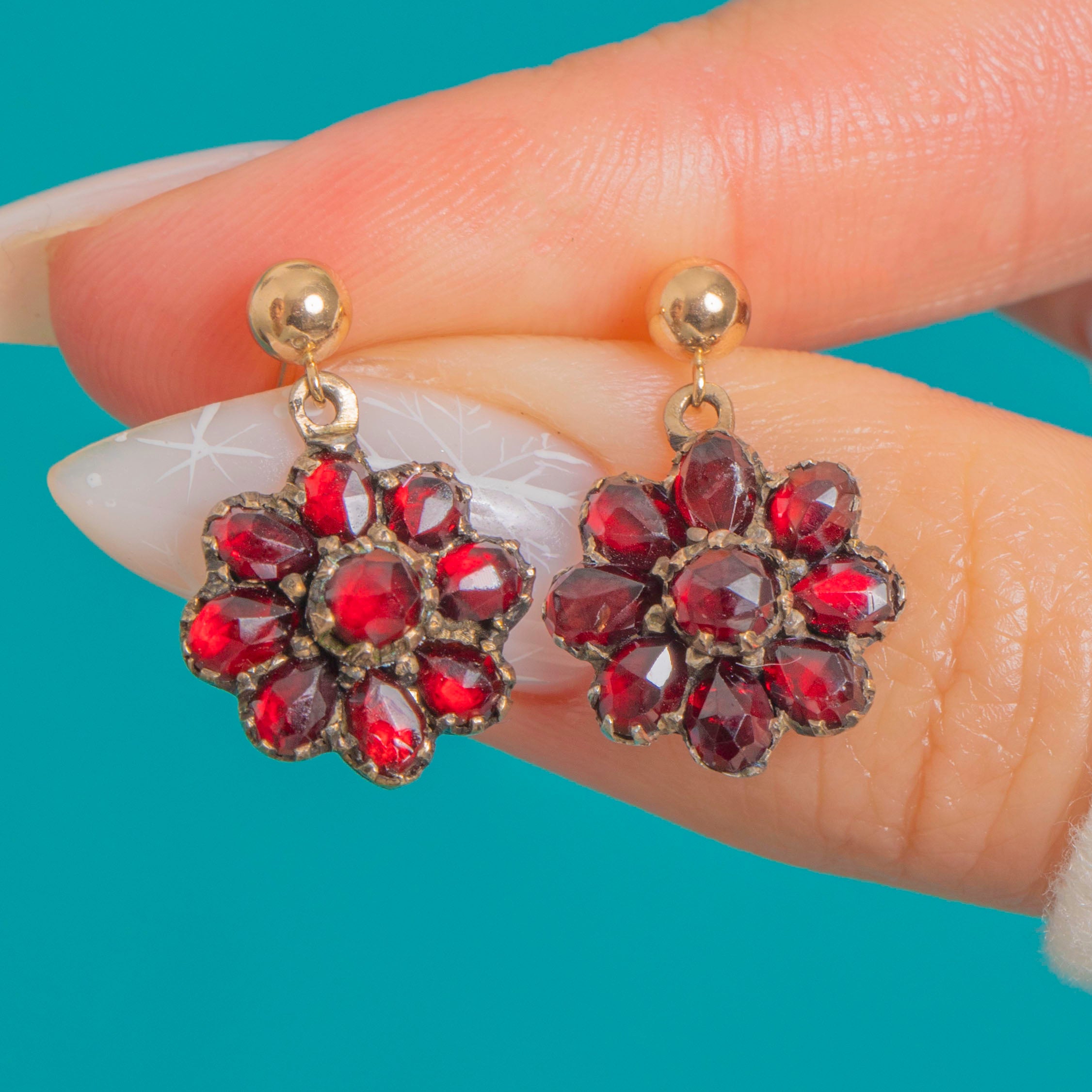 Petite and romantic, these Victorian Garnet cluster drops glow with deep crimson allure. Each domed rosette is formed from tightly set, rose-style faceted Garnets in dark, crimped collet settings, creating a charming floral silhouette with antique character.