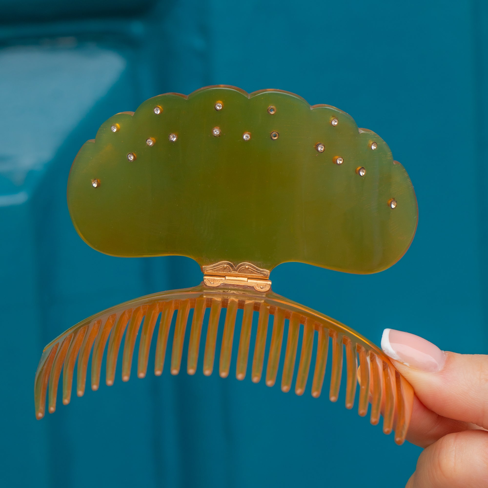 The rich caramel hue of the comb is both velvety and captivating, making it a standout piece in any collection. Like the stars themselves, dotted across a warm airglow, this hair comb is delicately adorned with shimmering Paste gemstones, adding a touch of sparkle to your hairdo. Fused together with an ornate 15ct Gold hinge with dainty engravings, if you want to dress to impress, this Victorian hair comb is a must!