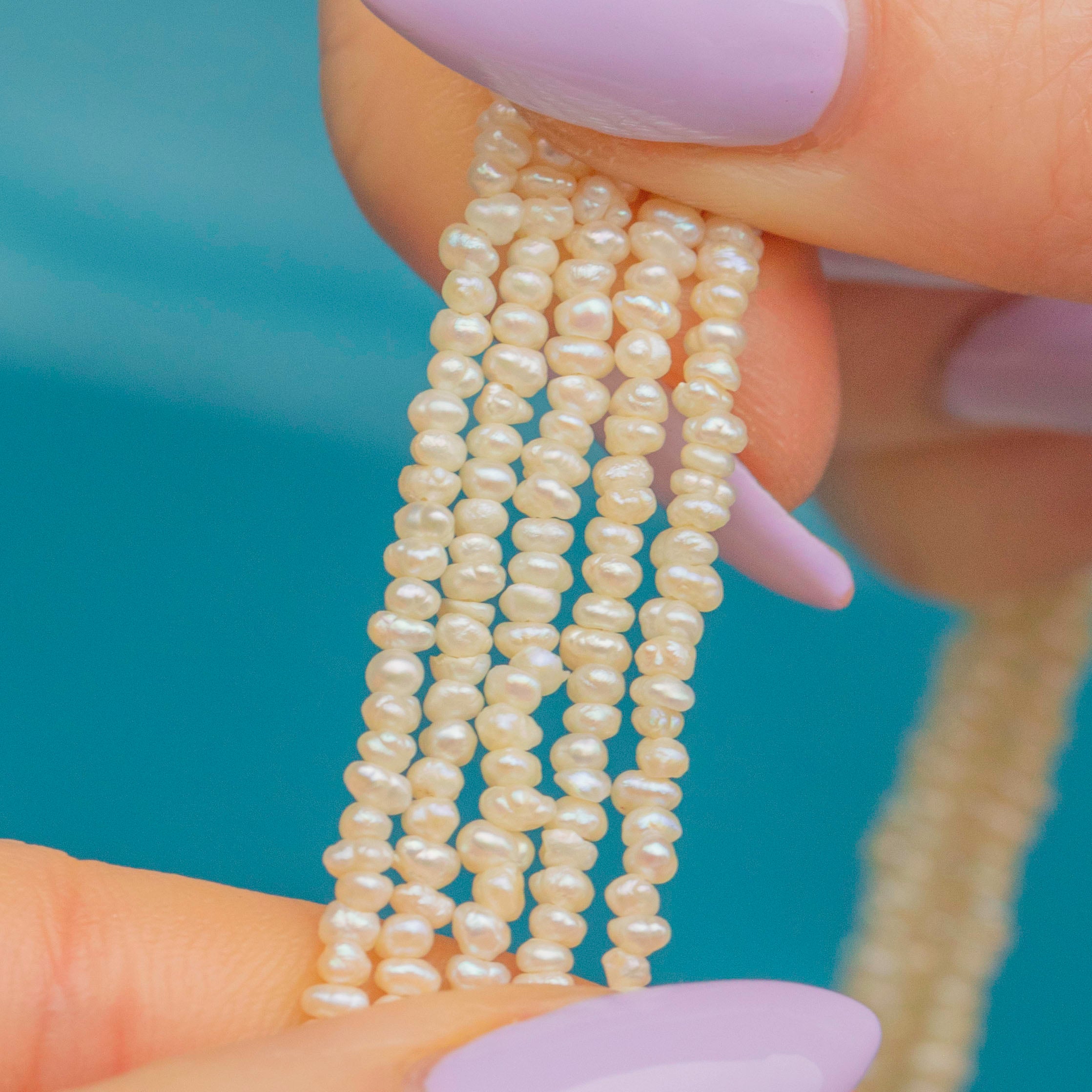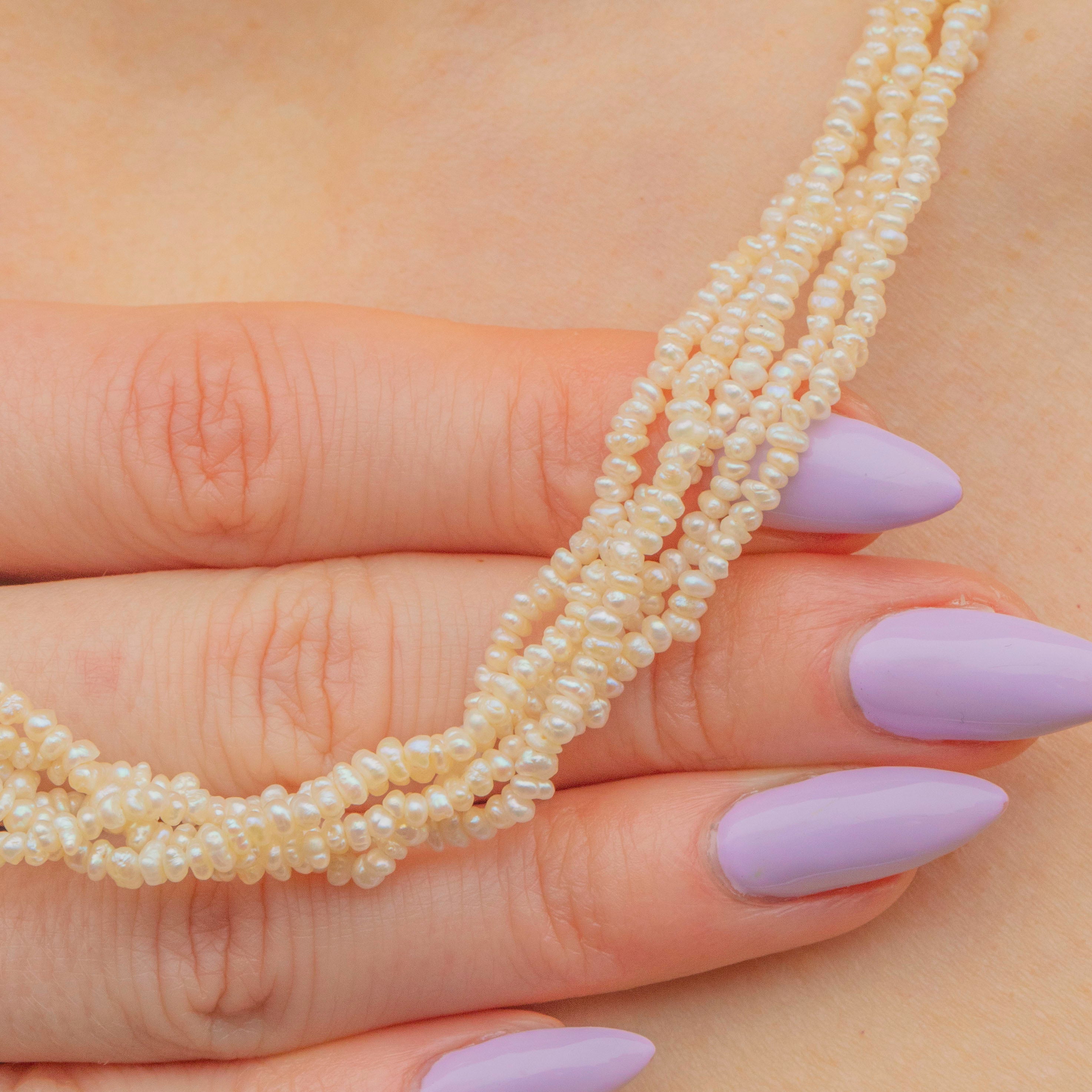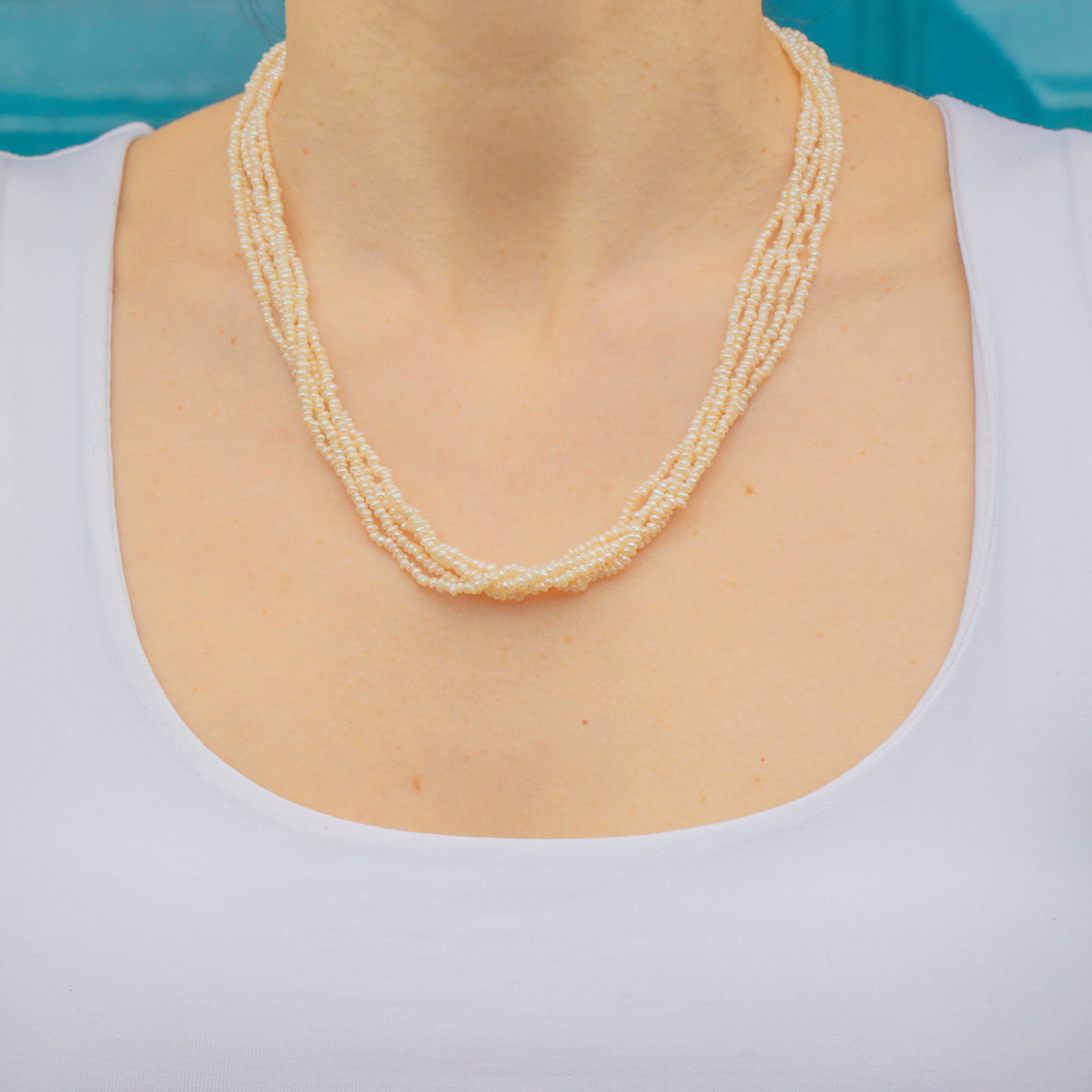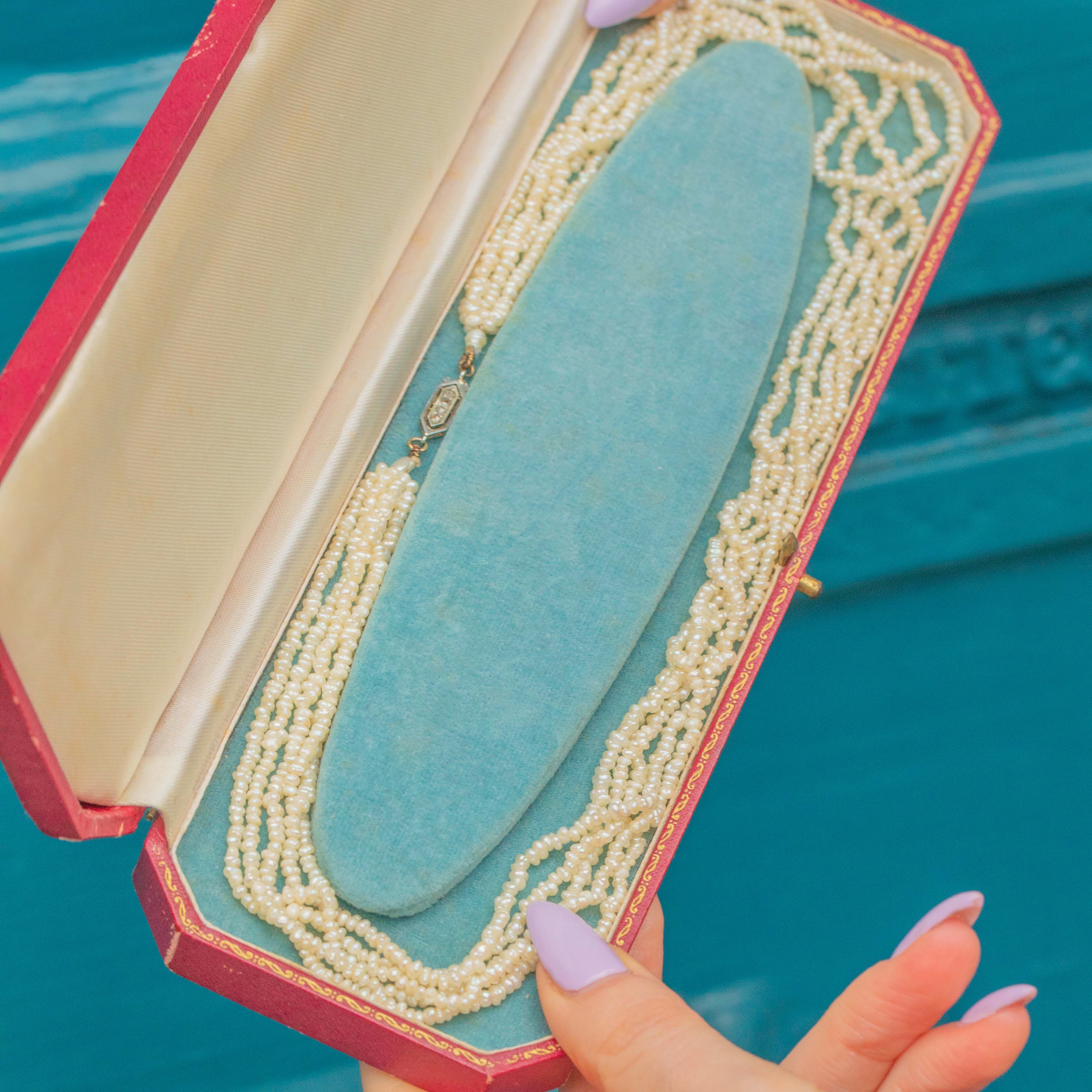 Radiating a timeless sophistication, this Edwardian necklace consists of five strands of delicate natural seed Pearls, each displaying a magnificent iridescence as they catch the light.