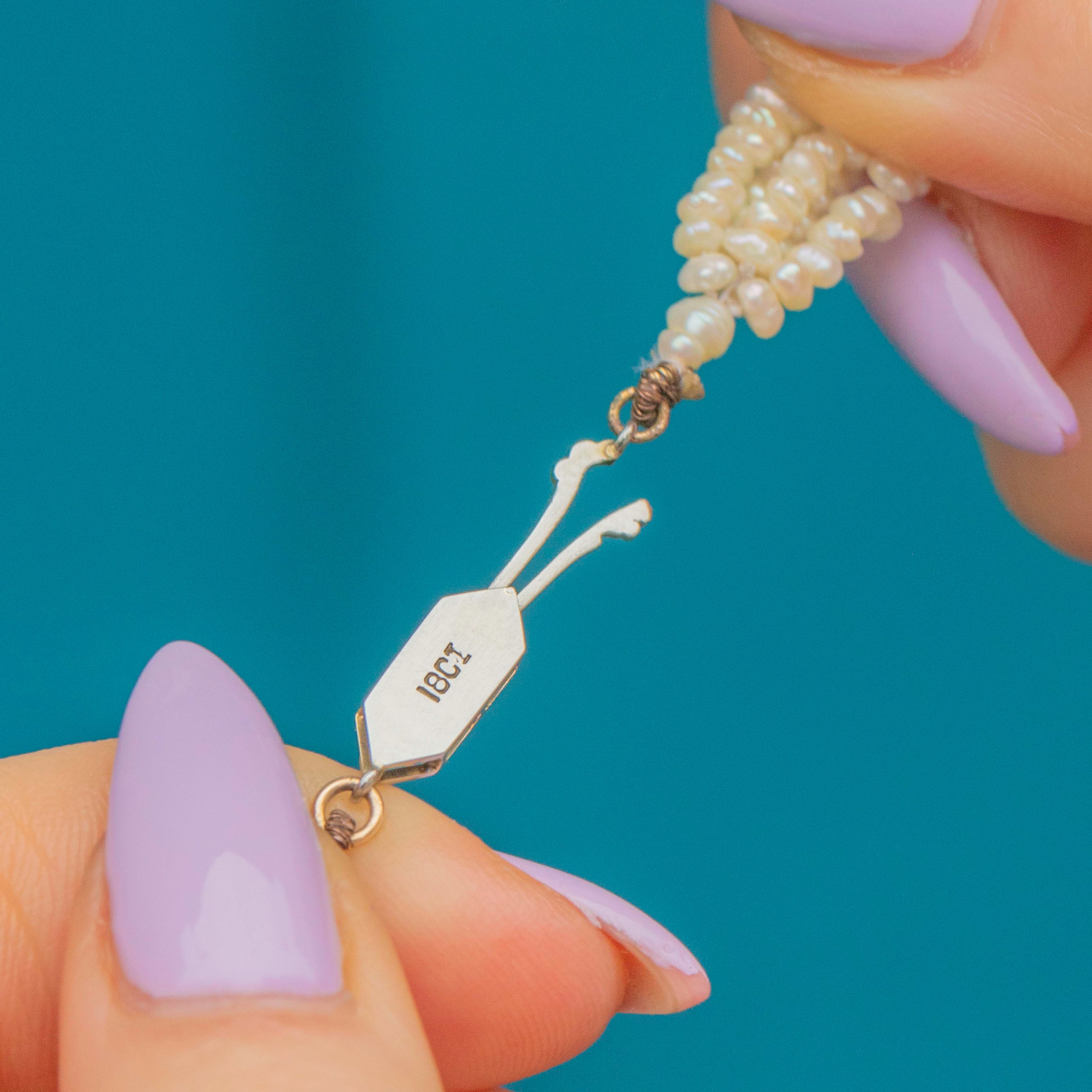 The delicate arrangement of lustrous seed Pearls is complemented beautifully by their 18ct White Gold clasp, studded with four scintillating rose-cut Diamonds.
