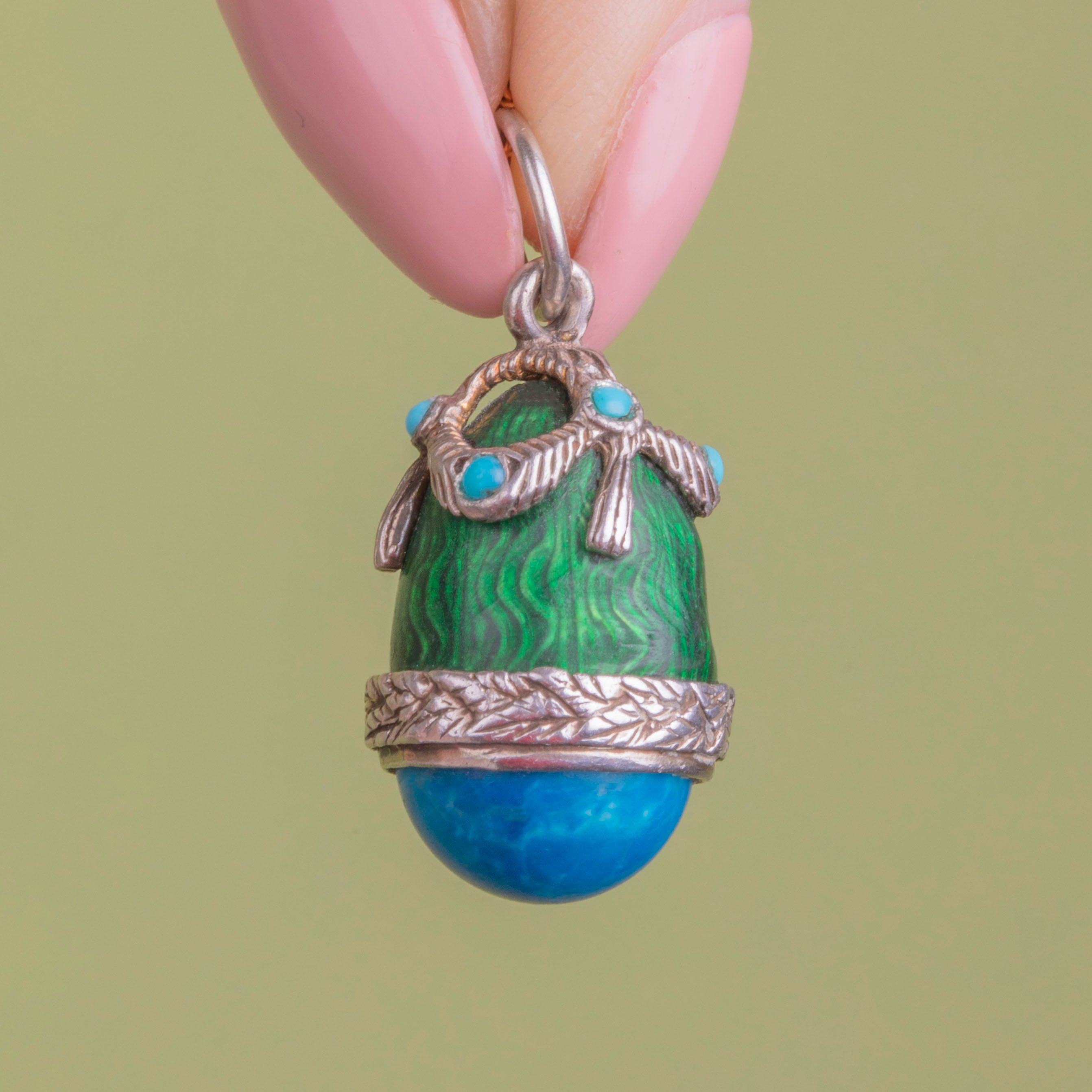 EXCELLENT. This antique Silver Blue & Green Enamel egg pendant is in excellent condition. The vibrant Green and Blue Enamel is free from chips or cracks, while the Silver band features well-defined engravings. The bale and setting exhibit a lovely light patina. Overall, this pendant is a beautifully preserved piece ready to be enjoyed.