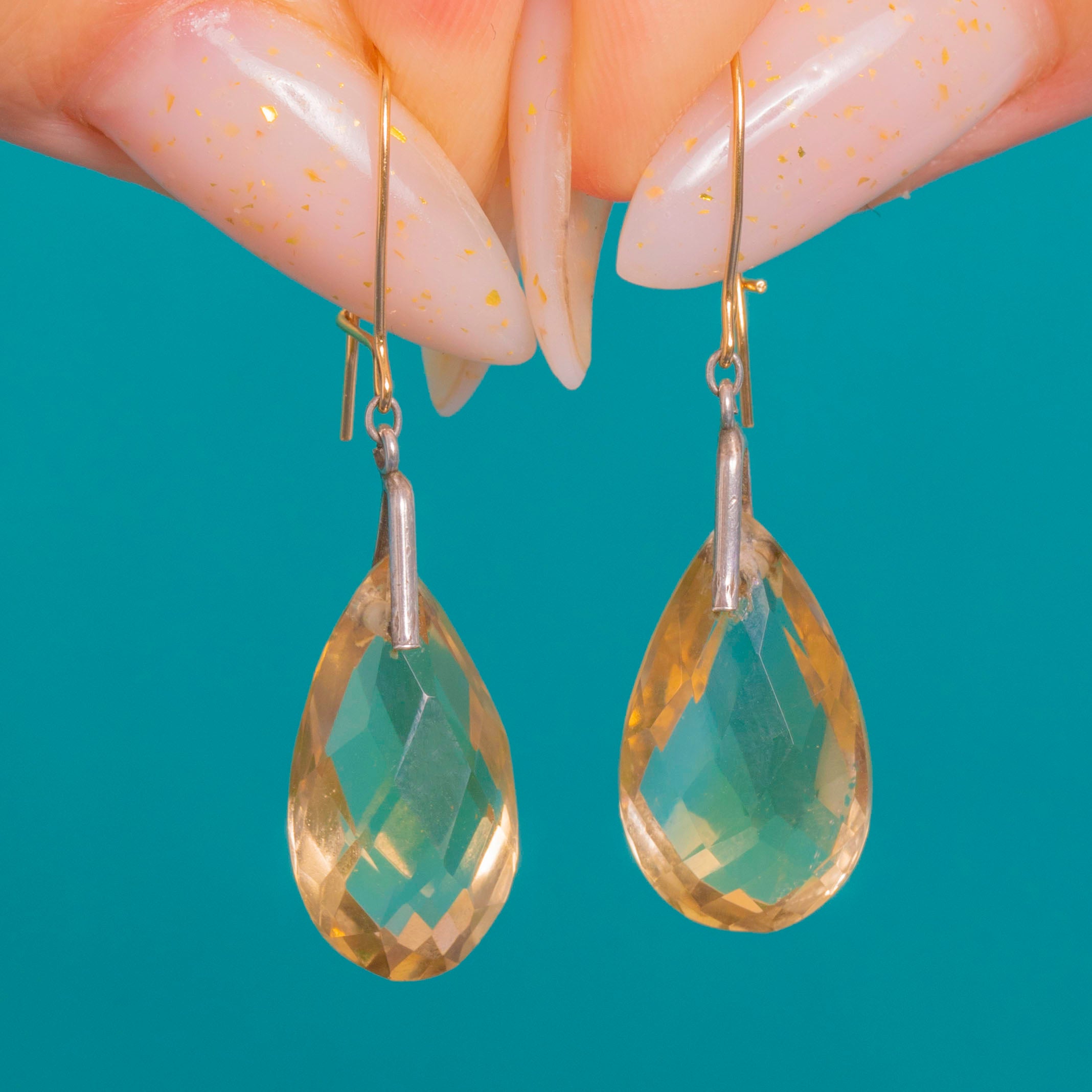 Bathed in soft honeyed light, these Victorian Citrine drop earrings capture the effortless elegance of a single, perfectly poised teardrop. Each transparent pear-shaped briolette shimmers with lively, checkerboard facets, the luminous hue beautifully complemented by the refined two-tone setting—Silver caps over the Citrines and graceful 18ct Gold hooks. The articulated drops sway delicately, catching the light with every movement for a look that is both timeless and luxuriously understated.