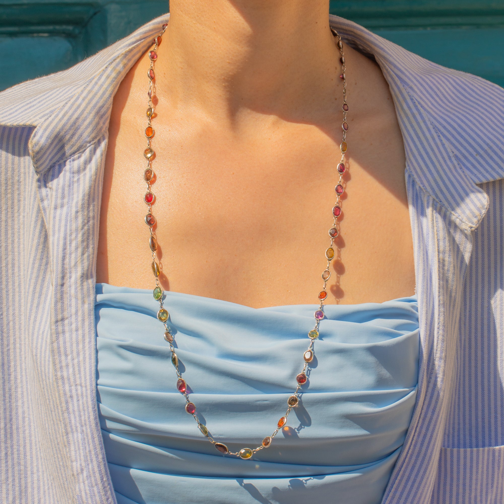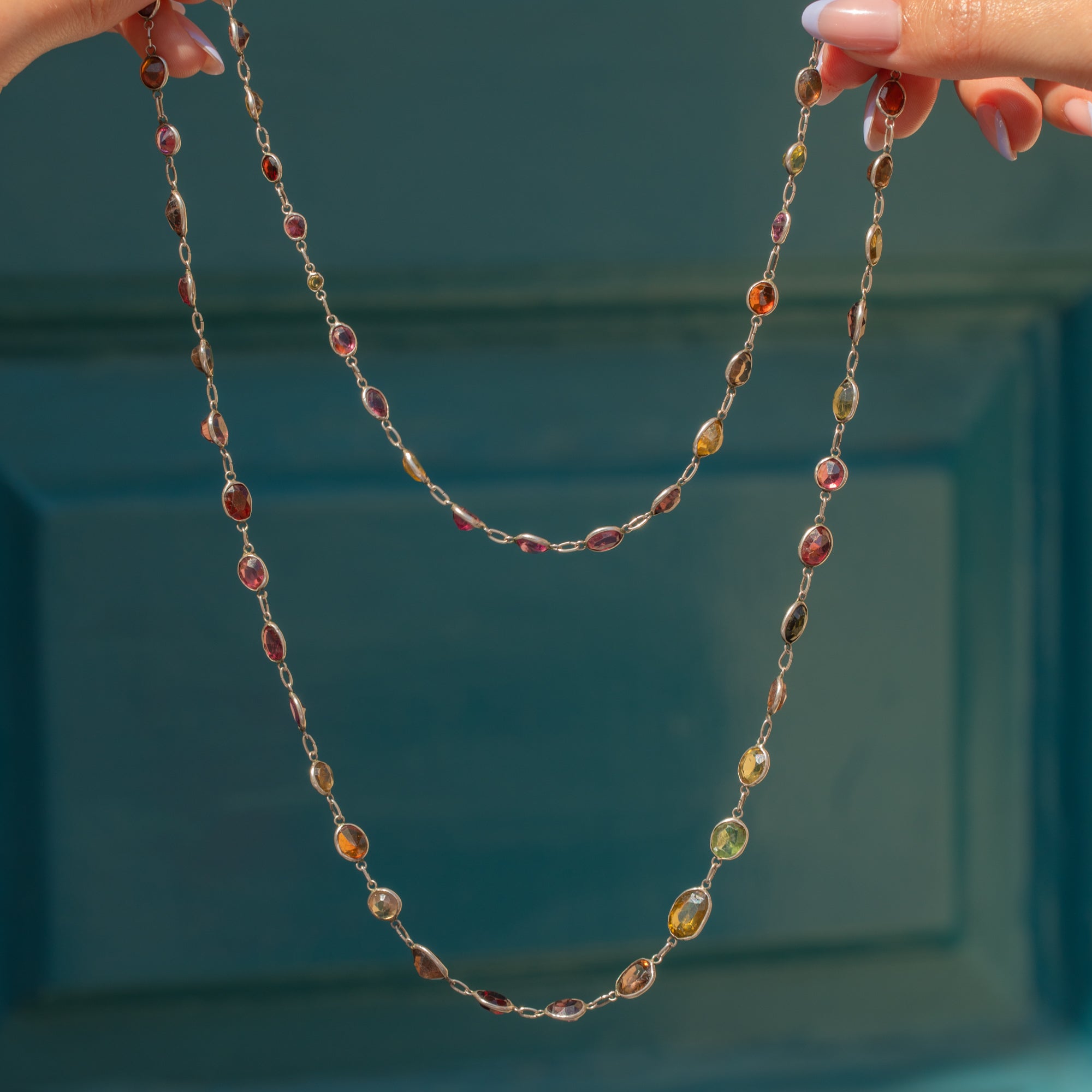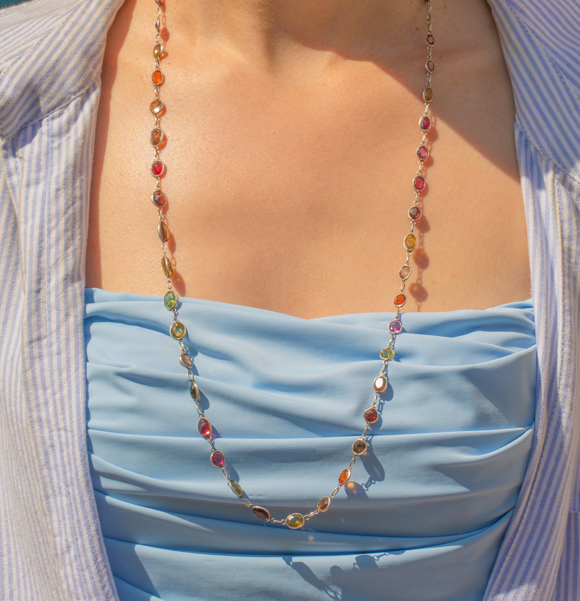 This 62" necklace is sure to cause a stir. The piece is a harlequin delight, with gorgeous colours from each of the gemstones, and we love how each of them have a different shape, making this a truly one-of-a-kind beauty.