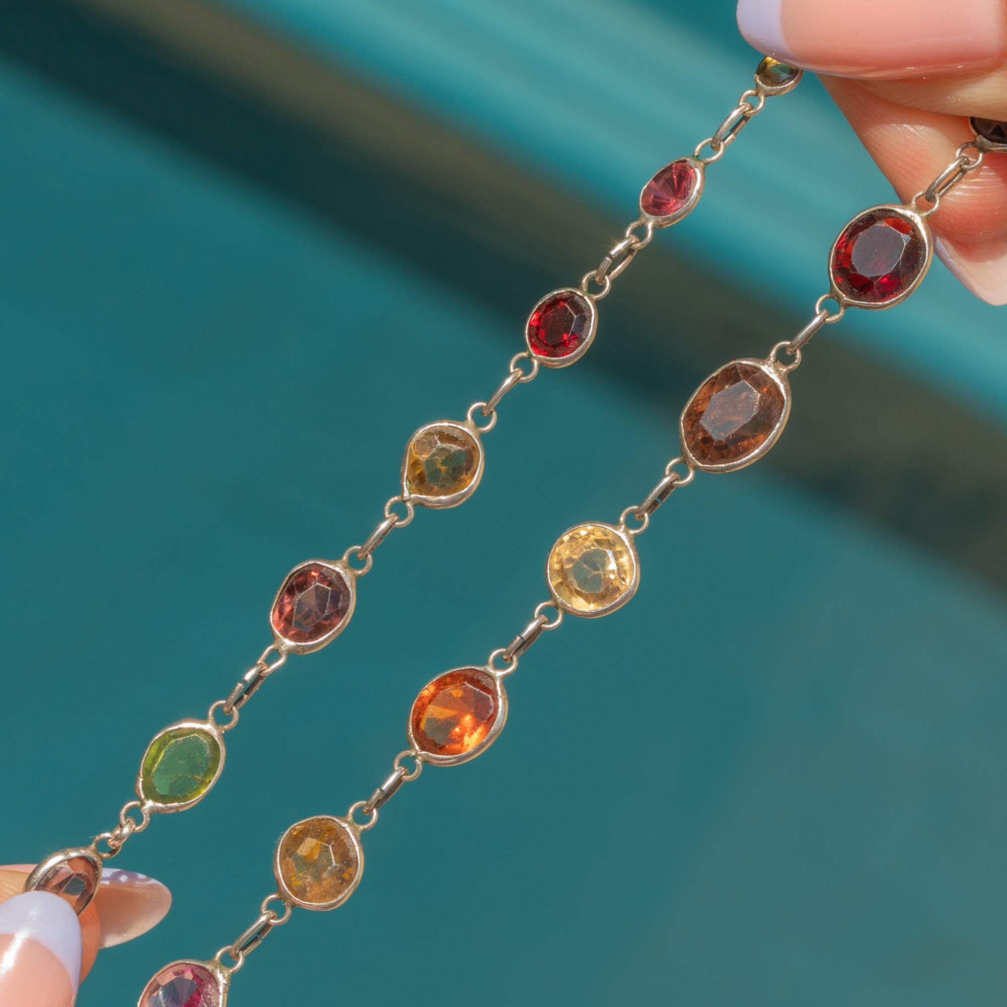 We simply adore this antique Silver Harlequin multi-gemstone bezel-set Riviere necklace! This gorgeous piece boasts an array of multicoloured gemstones, including maple-hued Madeira Citrine, sunny Yellow Garnets and dusty pink Tourmaline, to name a few!