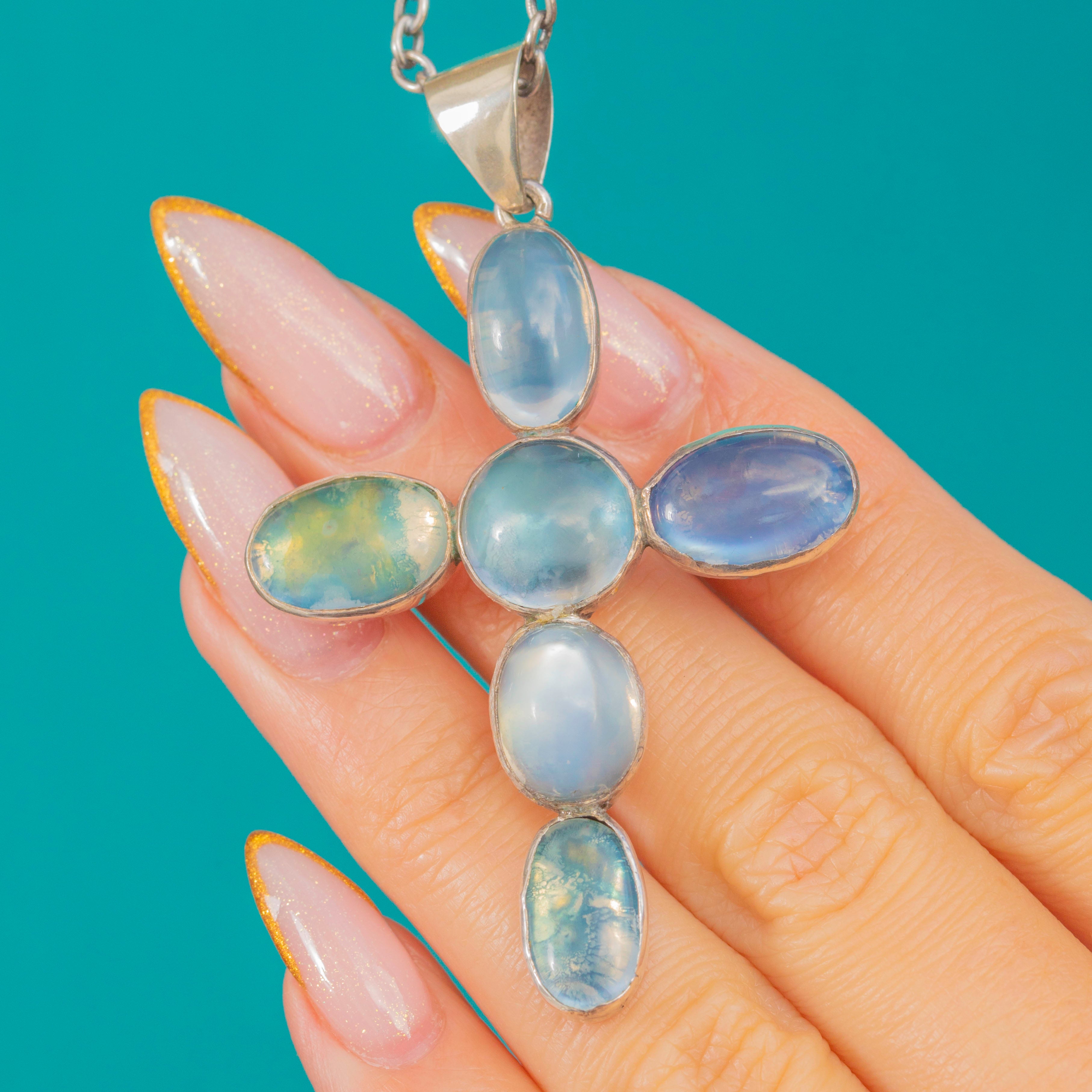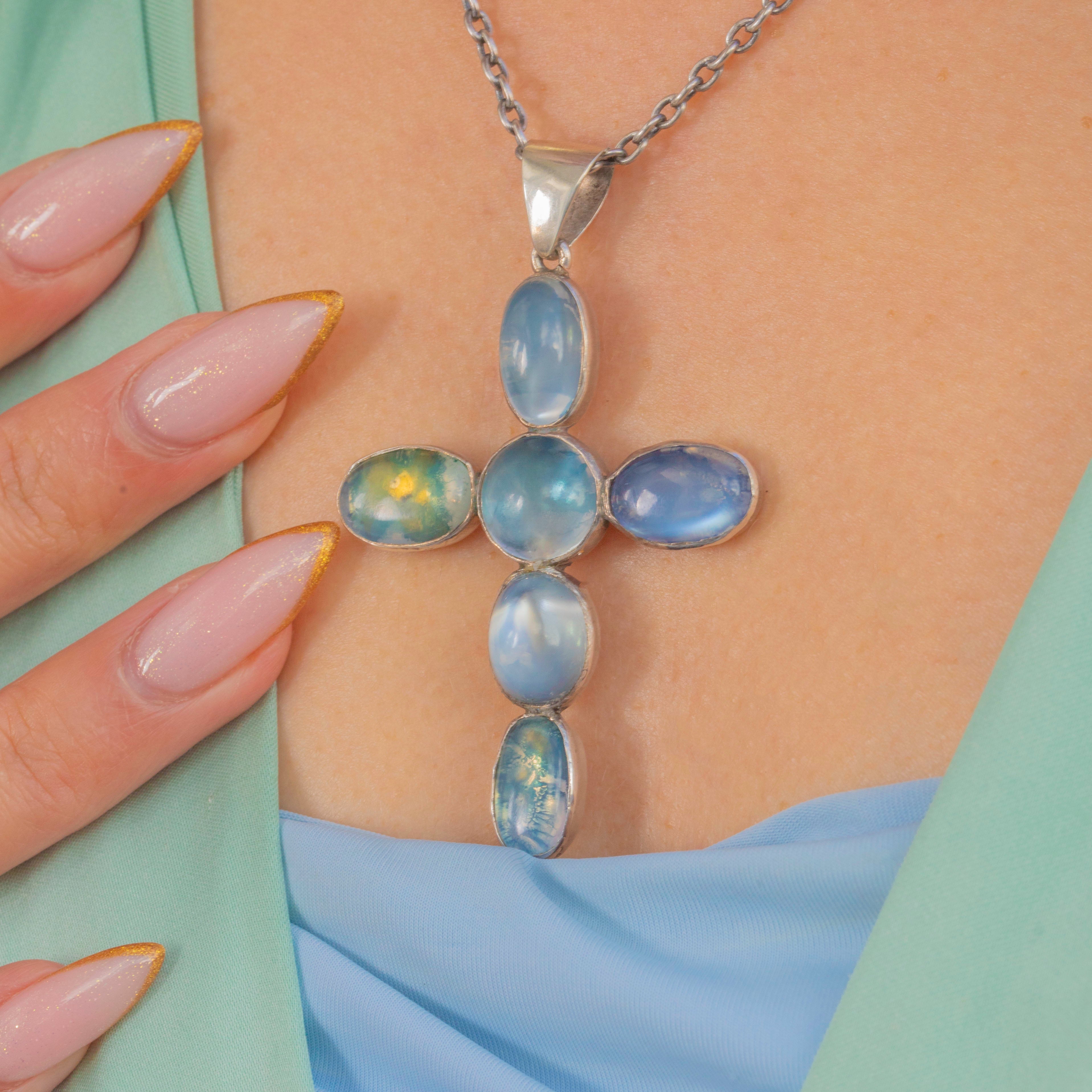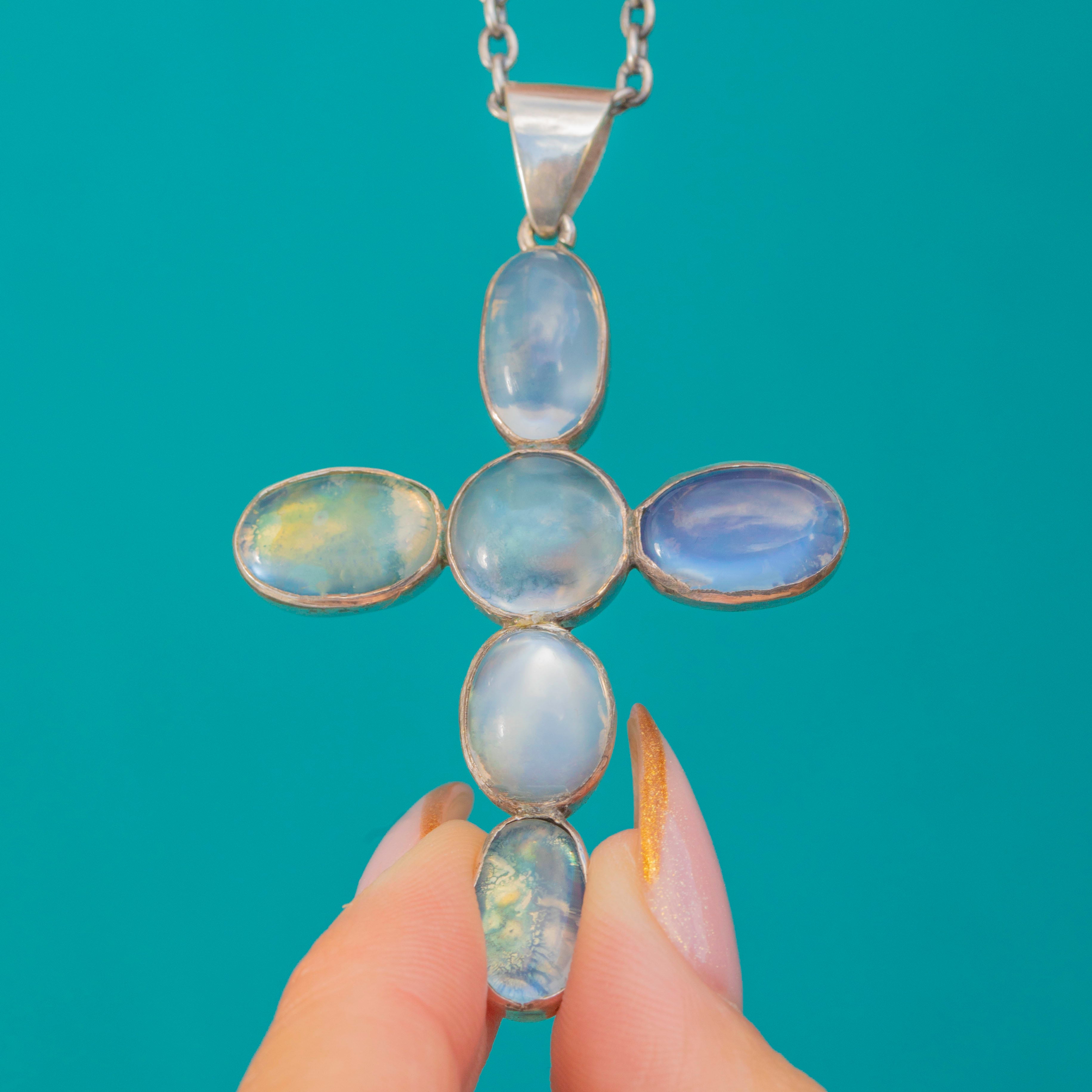 A striking Arts & Crafts Moonstone cross pendant crafted in Silver, complete with a long 30" chain for effortless, elegant wear. The cool glow of the Moonstones is beautifully showcased in this handmade design, with soft adularescence and organic charm characteristic of the Arts & Crafts movement.