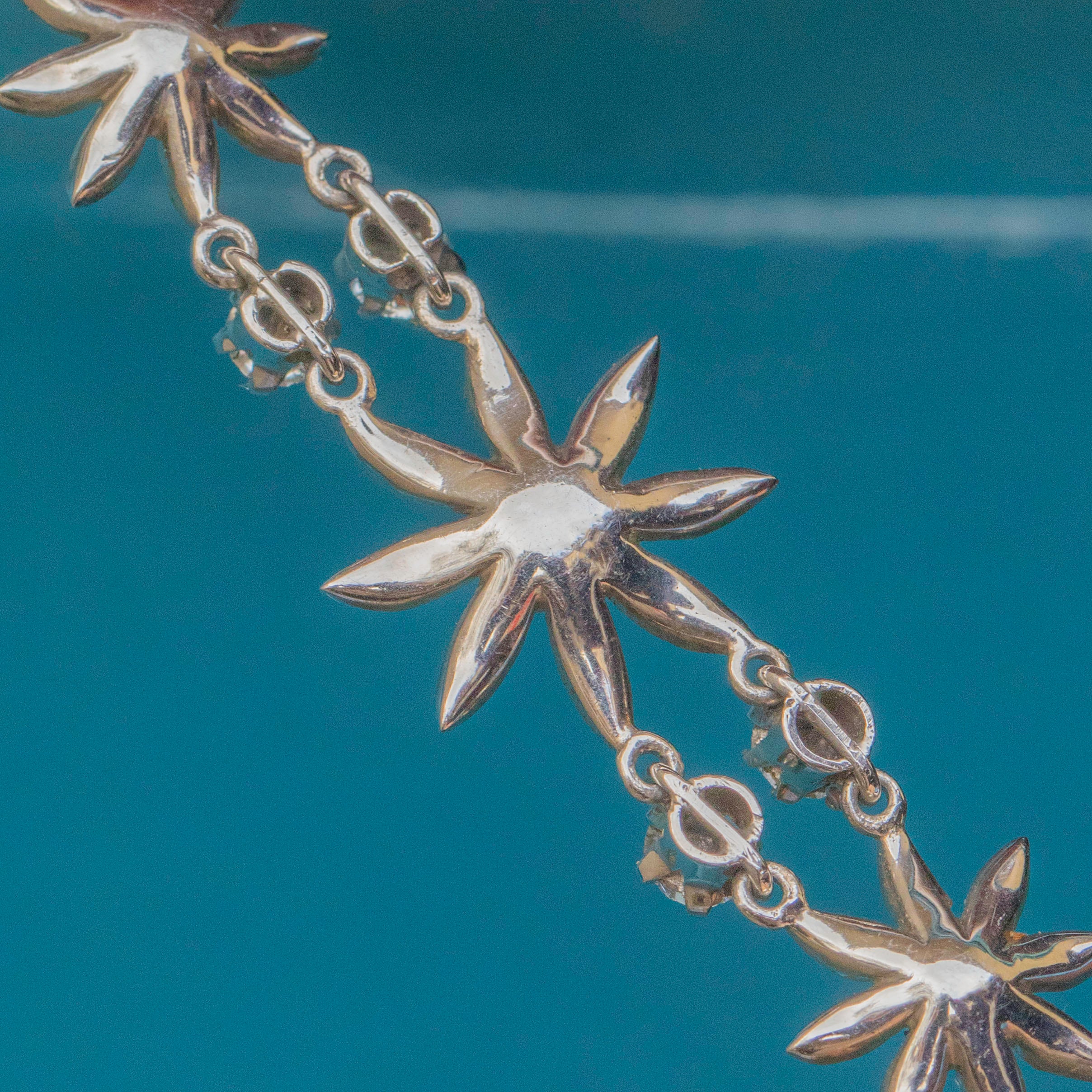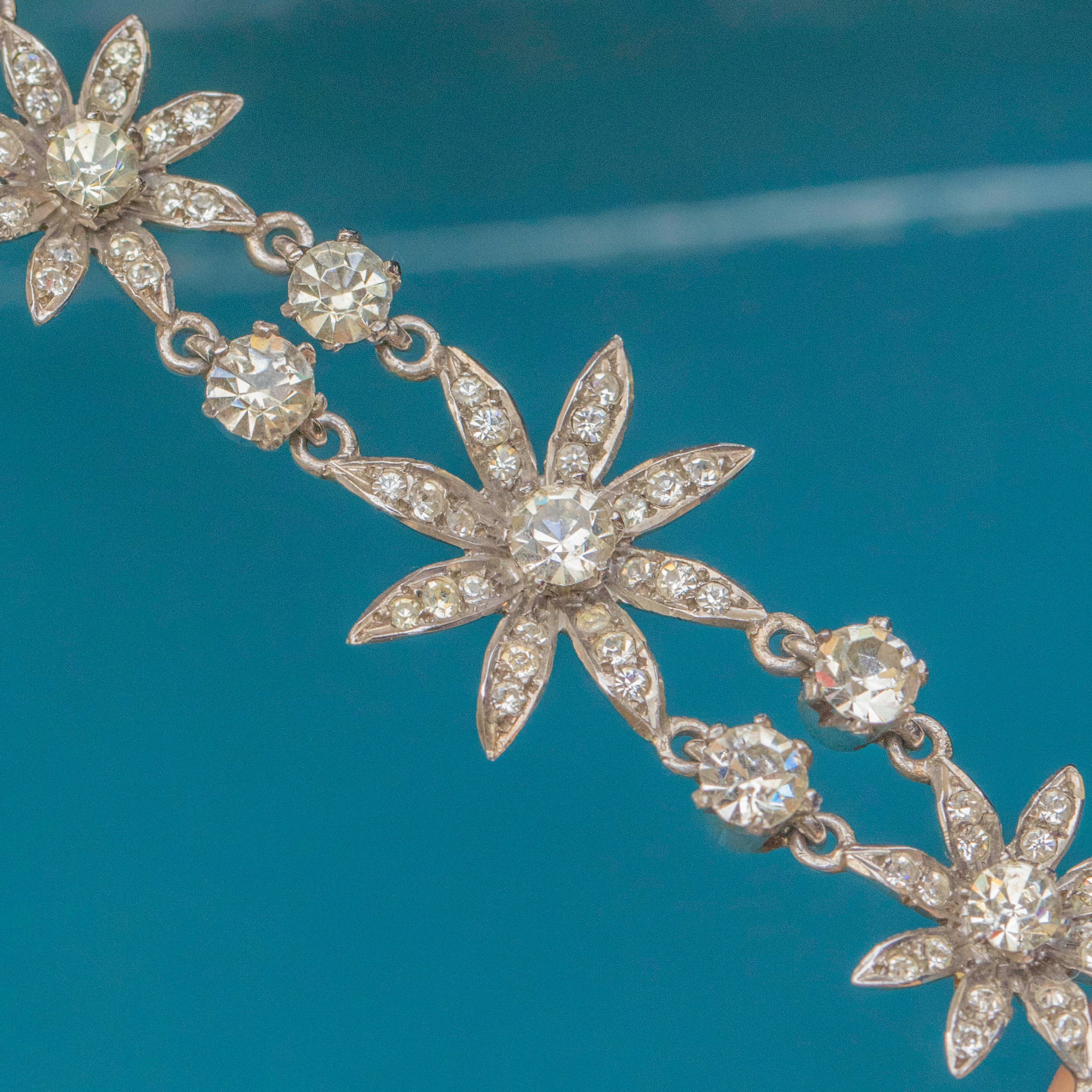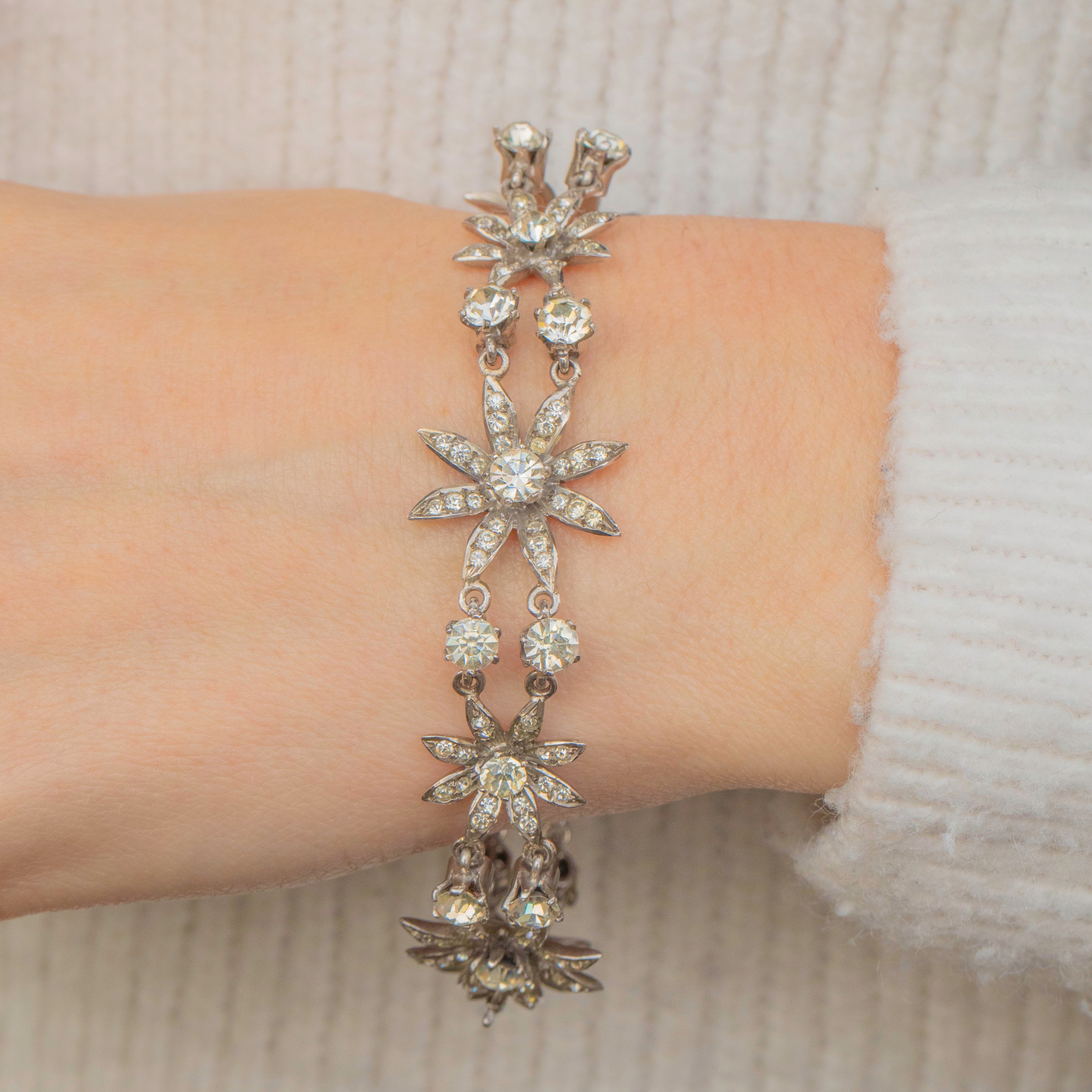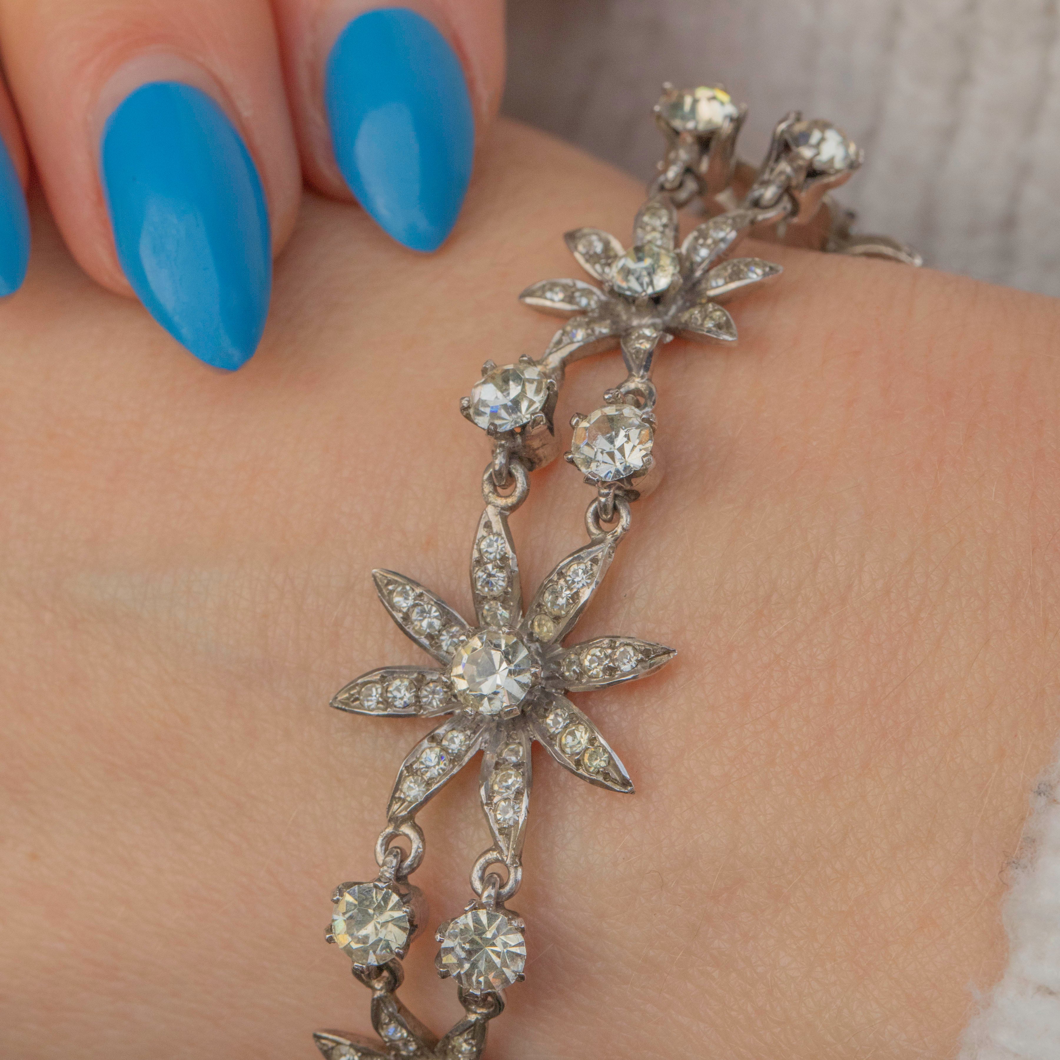 VERY GOOD This Antique Silver Paste Flower Bracelet is in very good antique condition. Her Paste gemstones flicker magnificently under light, with one tiny Paste gemstone missing and some gentle discolouration to a few of her Paste stones, which only adds to her unique character and story. She remains a stunning and wearable piece, ready to bring elegance to any occasion.