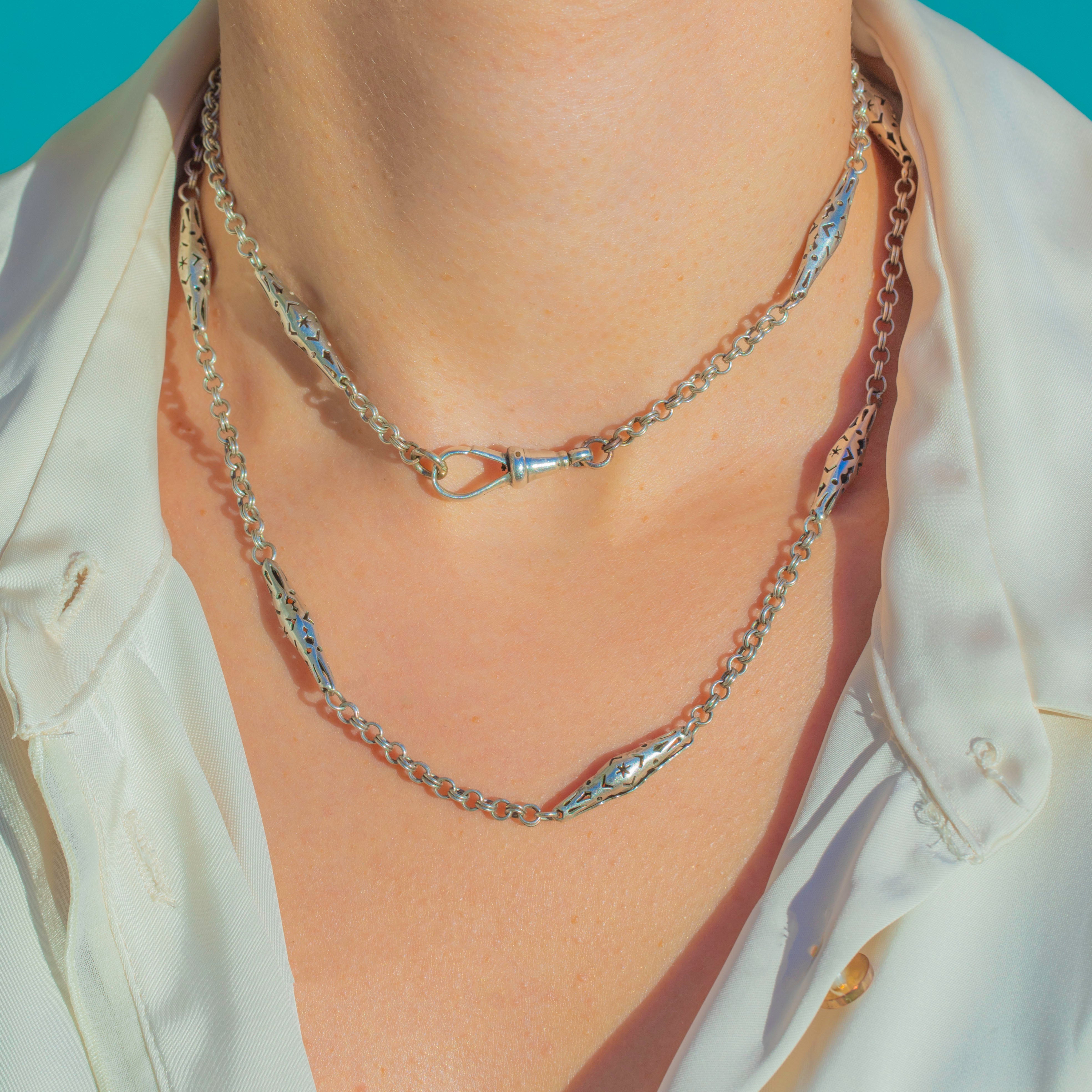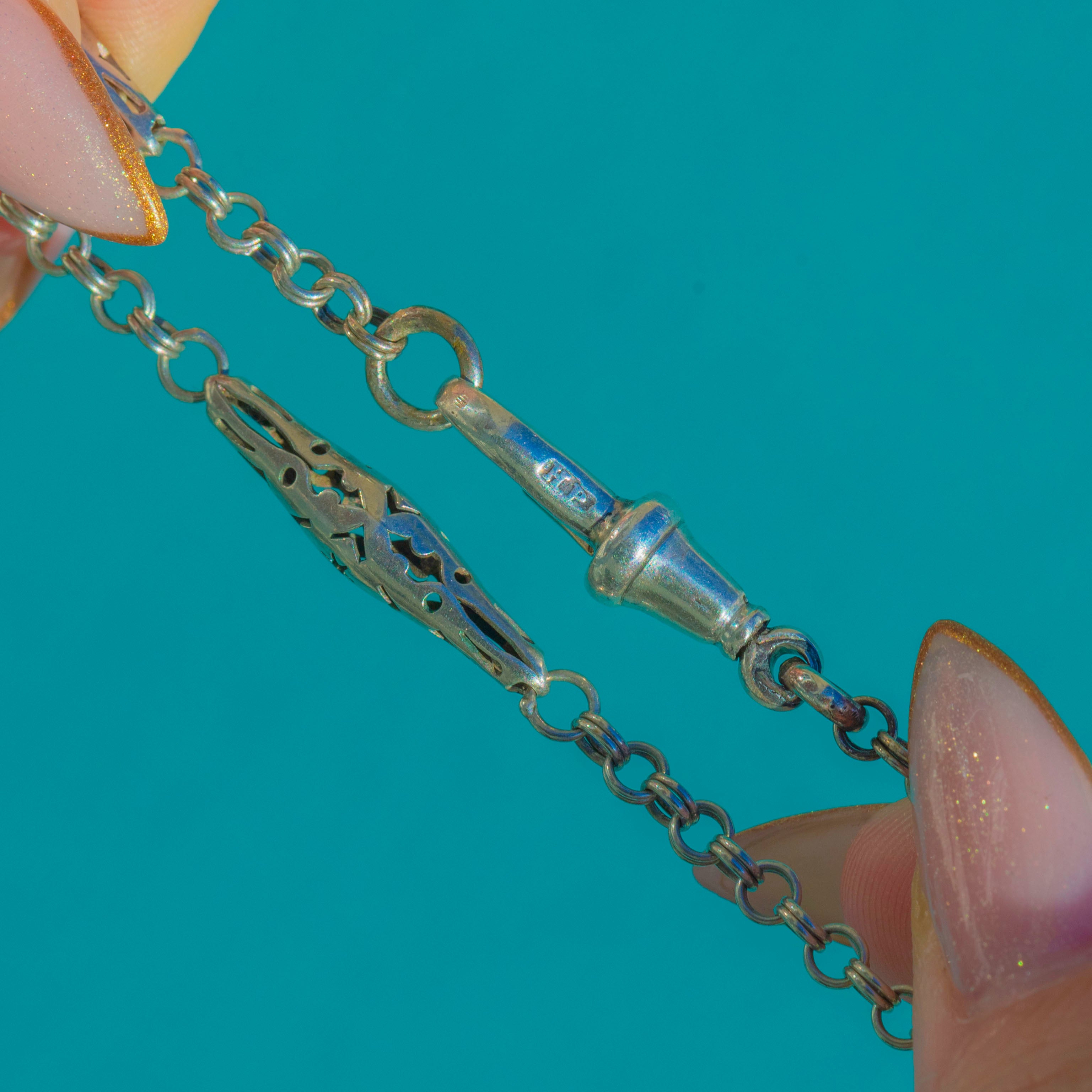 The chain is finished with a large, substantial Silver dog-clip clasp, perfect for attaching your favourite lockets, pendants or charms. At a generous 27" long, it can be worn as a single long chain, layered, or styled as a statement piece. A striking Victorian chain with lovely weight and detail.