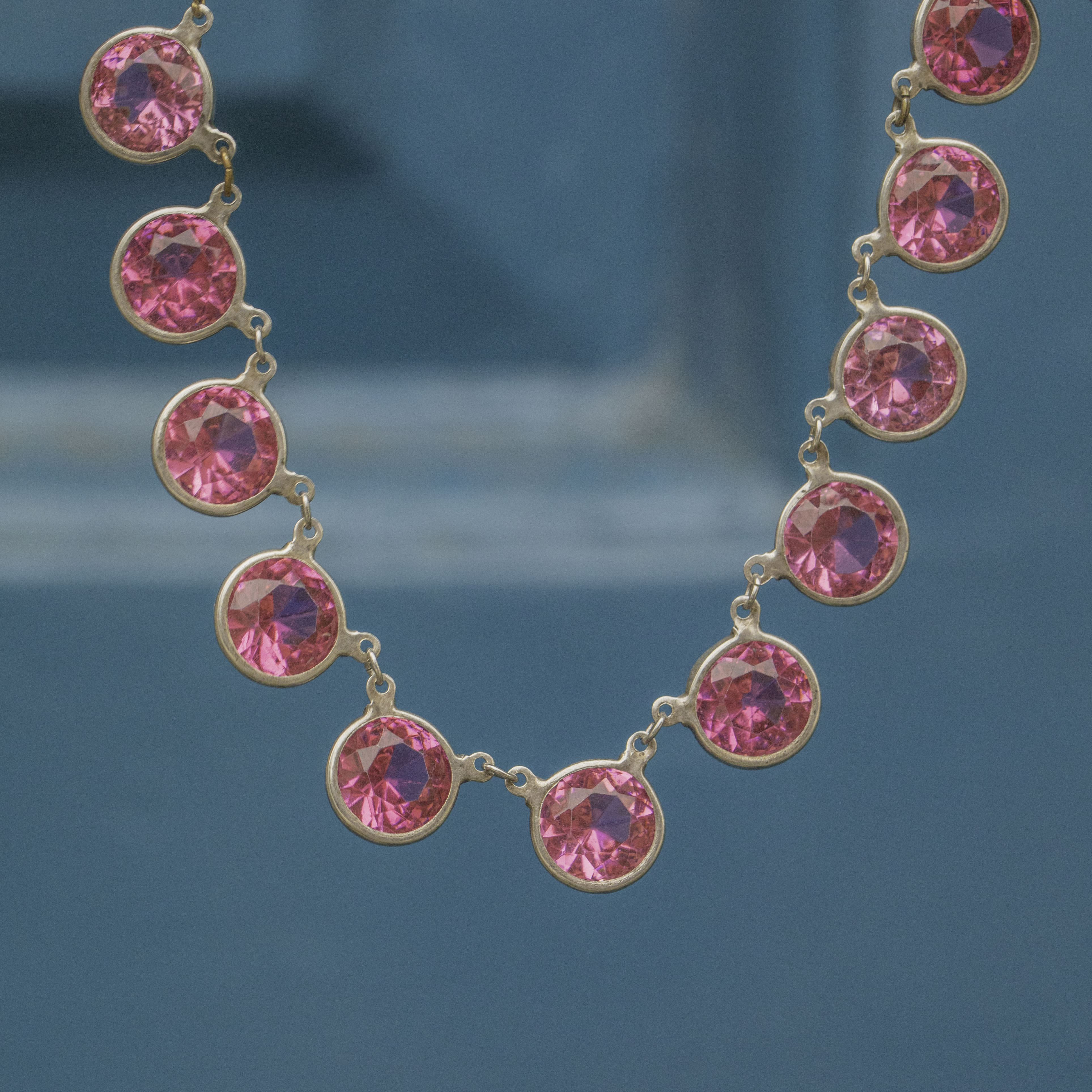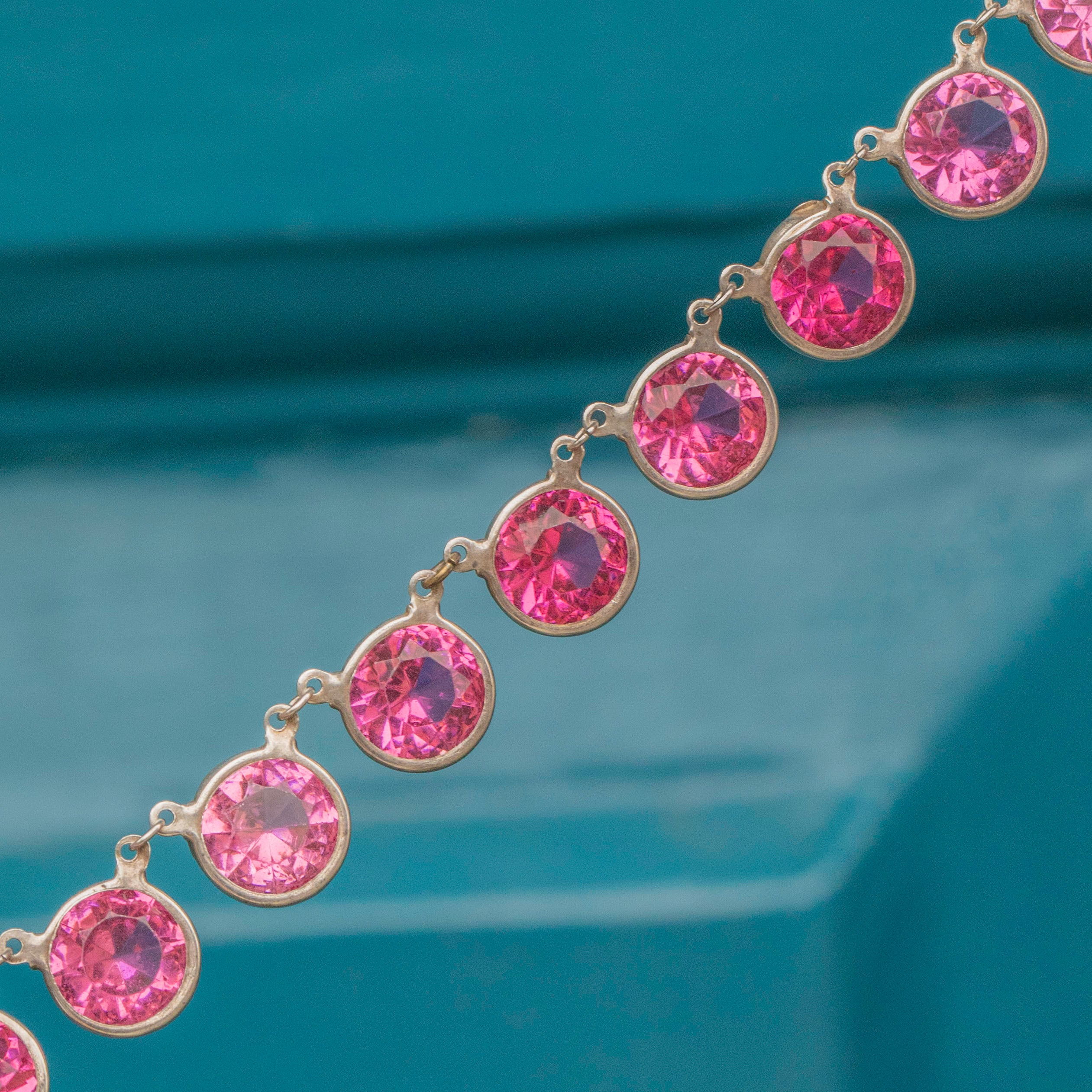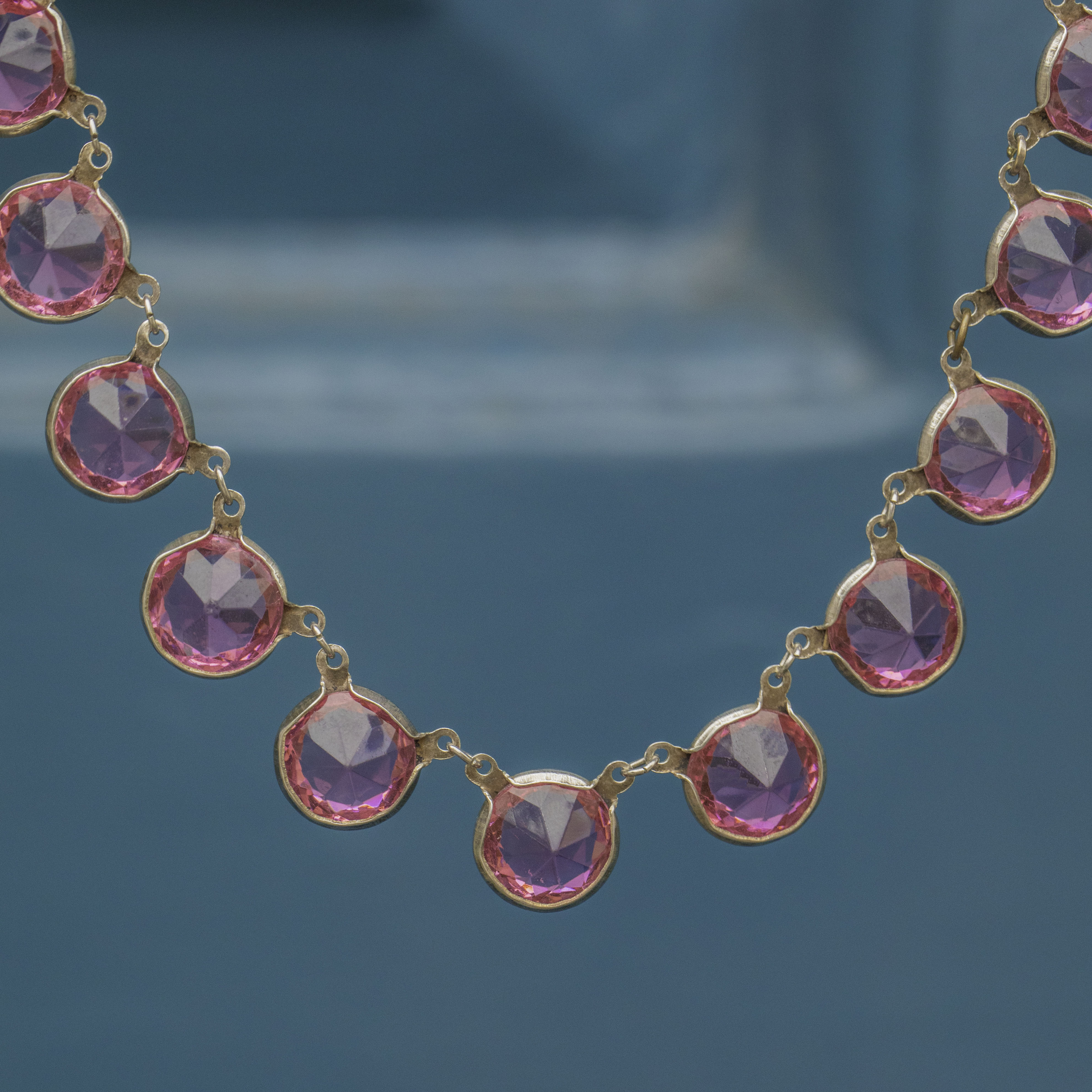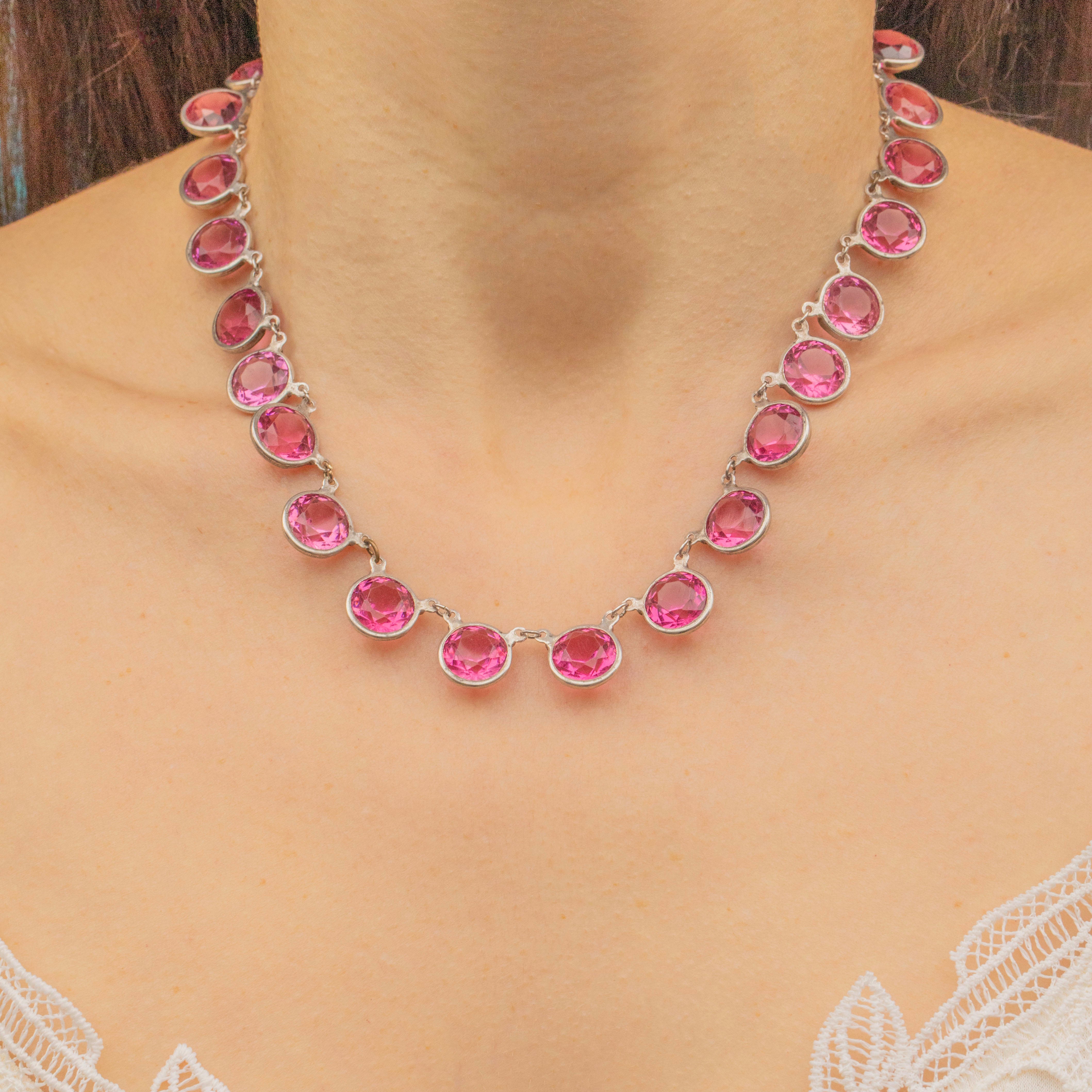 Crafted from Sterling Silver, this necklace boasts a riviere of twenty-six vibrant pink paste stones, with each capturing the light beautifully and radiating gorgeous fuchsia hues. Each faceted Paste stone rests delicately from her Silver chain and is secured with a large bolt ring, embodying fine antique craftsmanship.