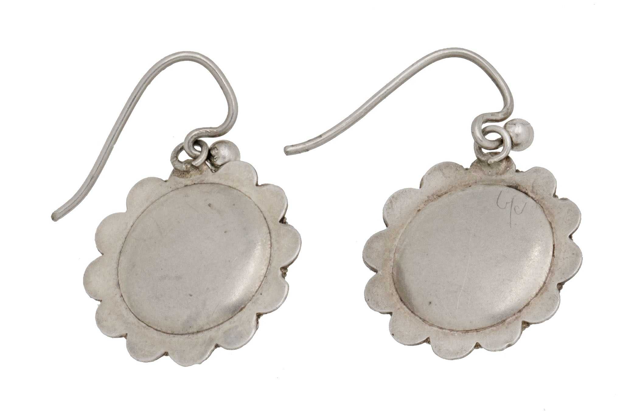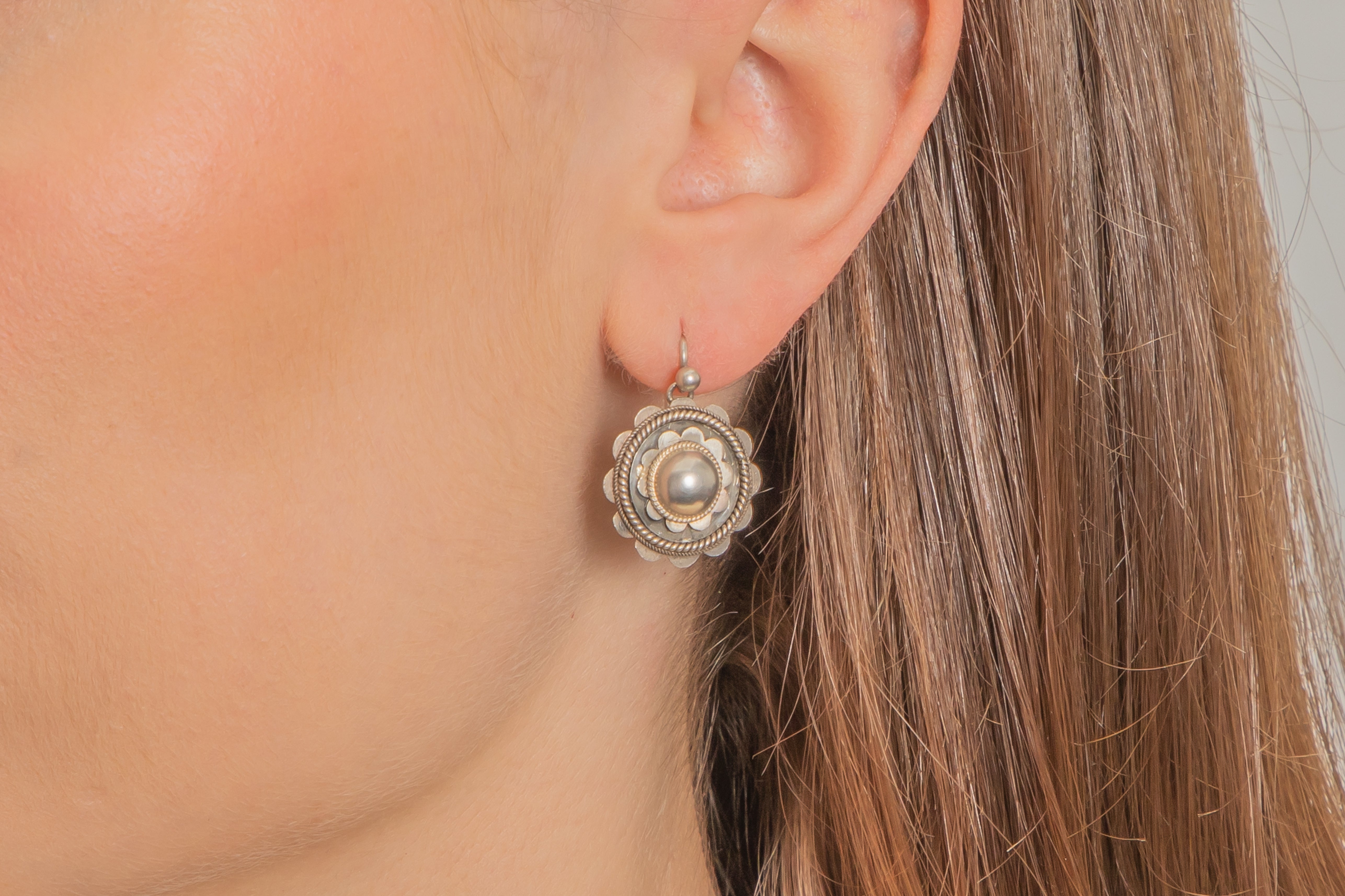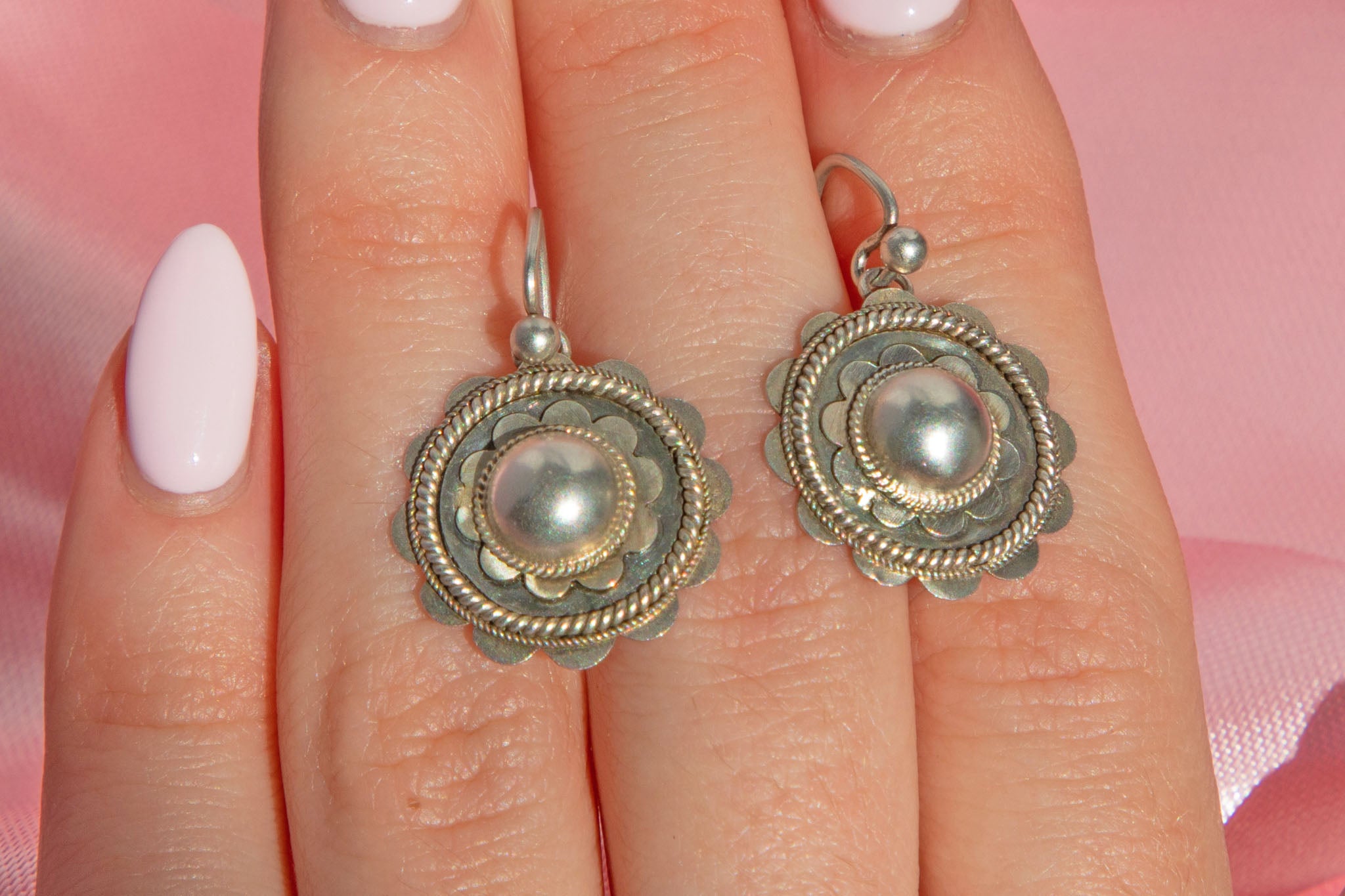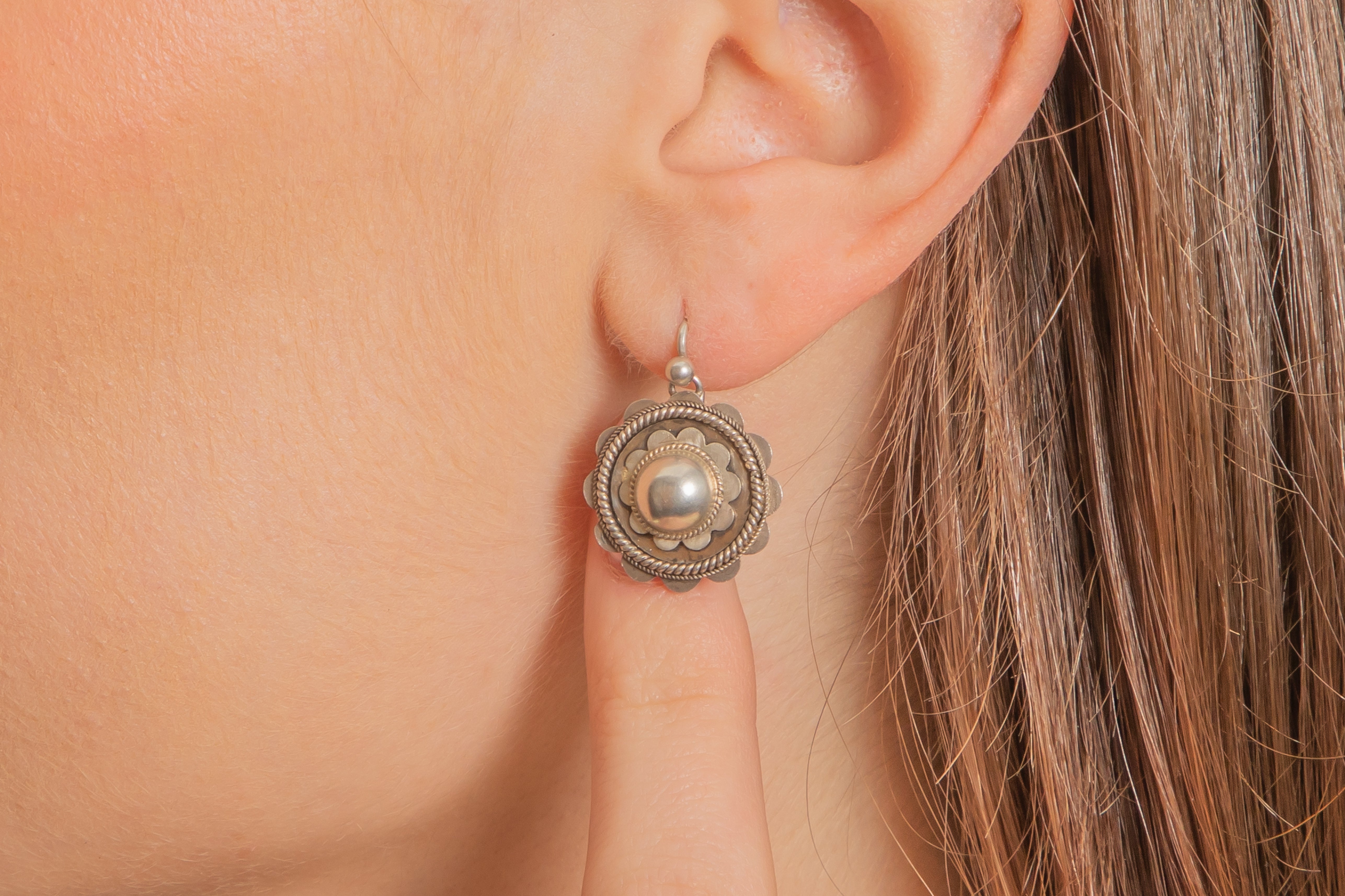 VERY GOOD. These antique Silver roundel flower earrings are in very good condition! The only thing stopping this pair from receiving an excellent rating is that there are a few scratches to the back of the earrings, however this will not be seen when you wear them. Aside from this, all of the components are securely affixed to one another and the Silver has accrued an admirable patina. Complete with Shepard's hooks, they can be worn with comfort and confidence!