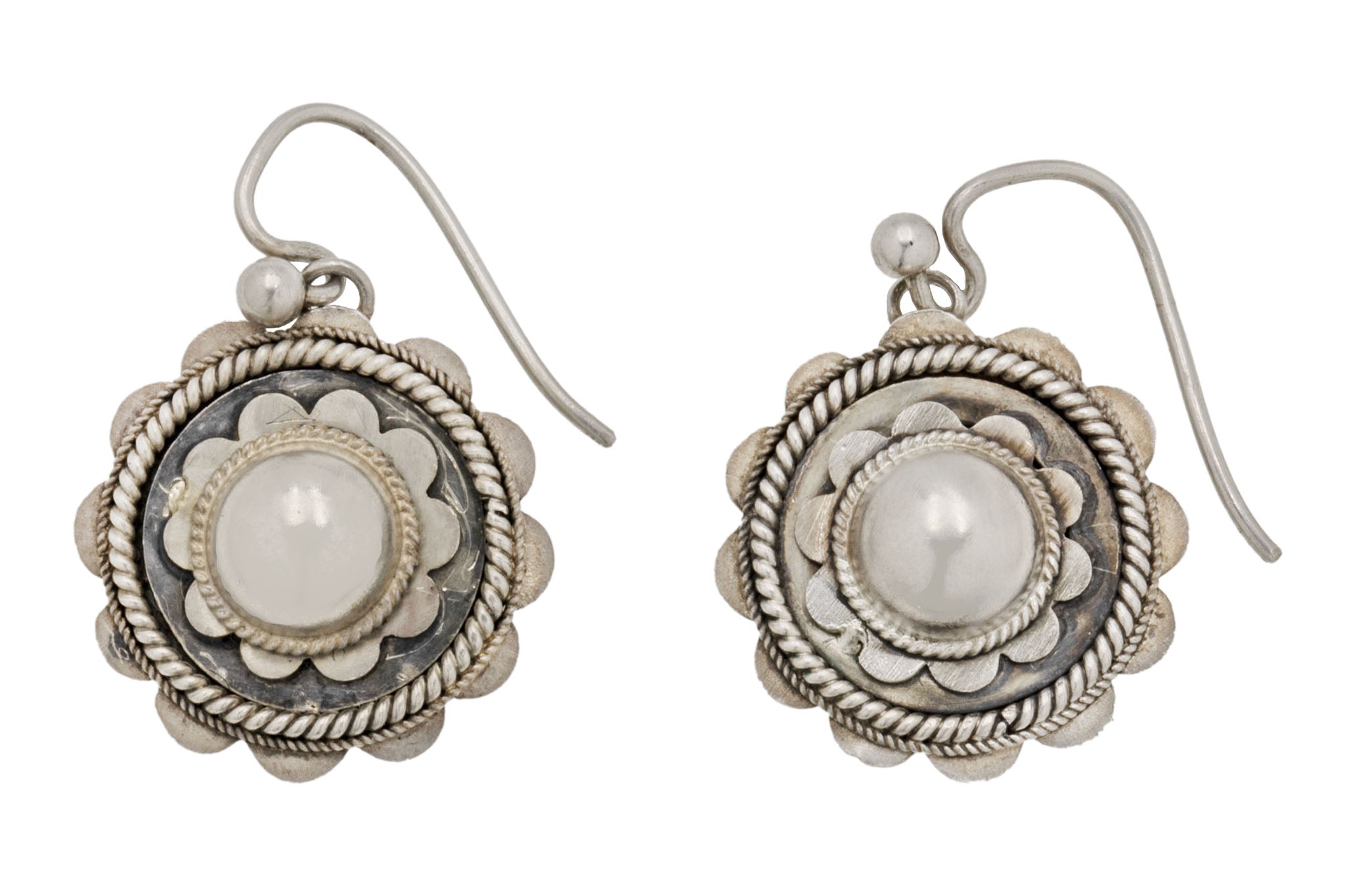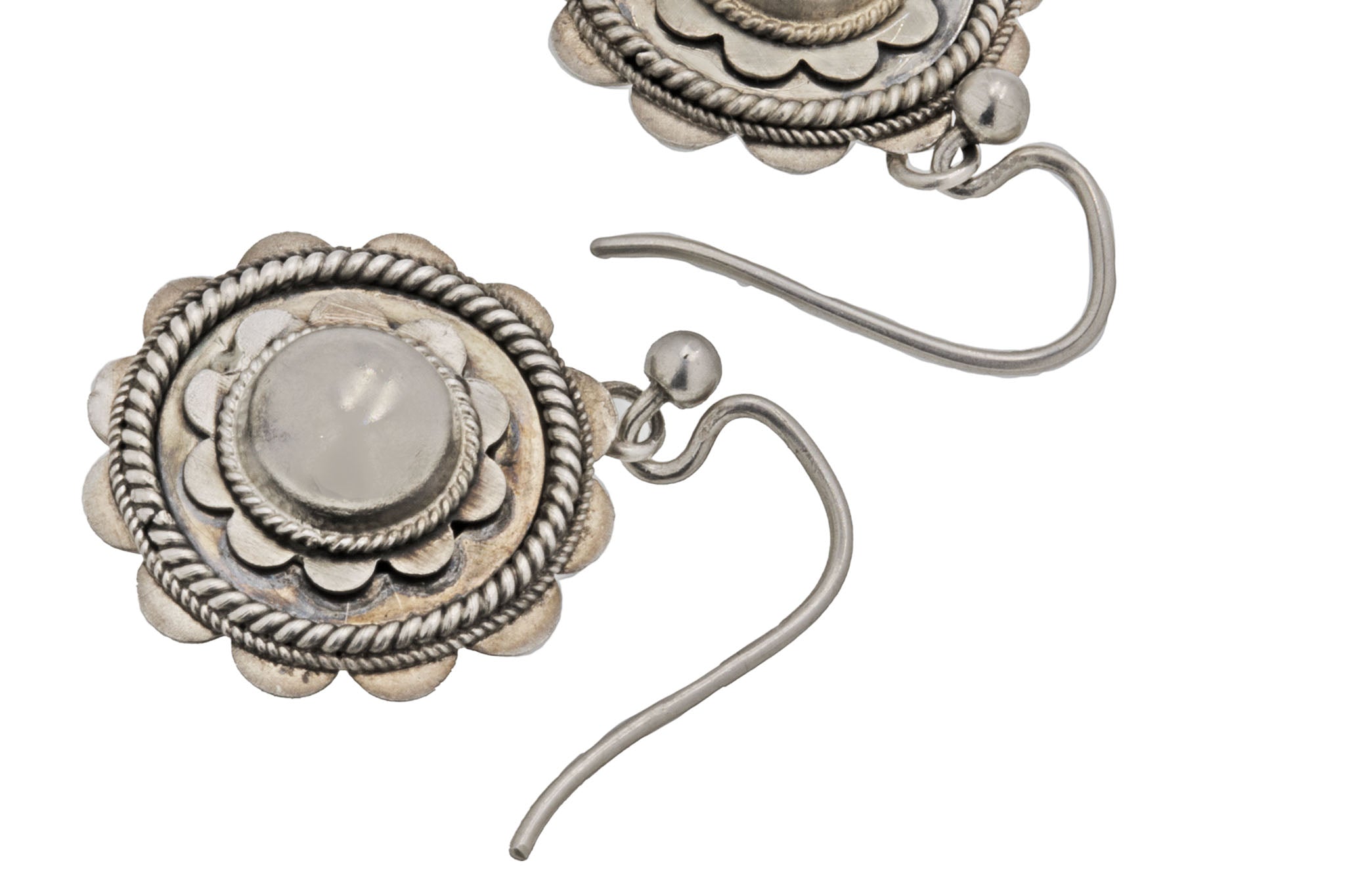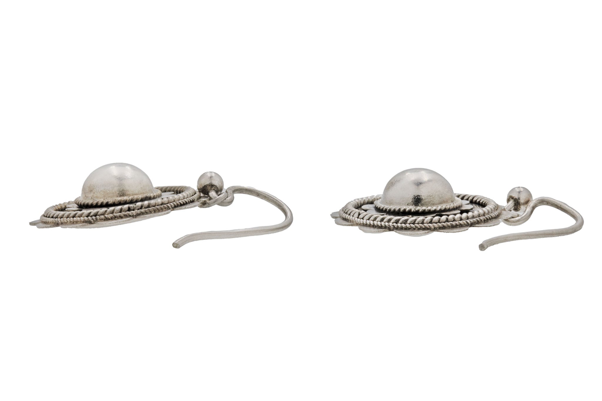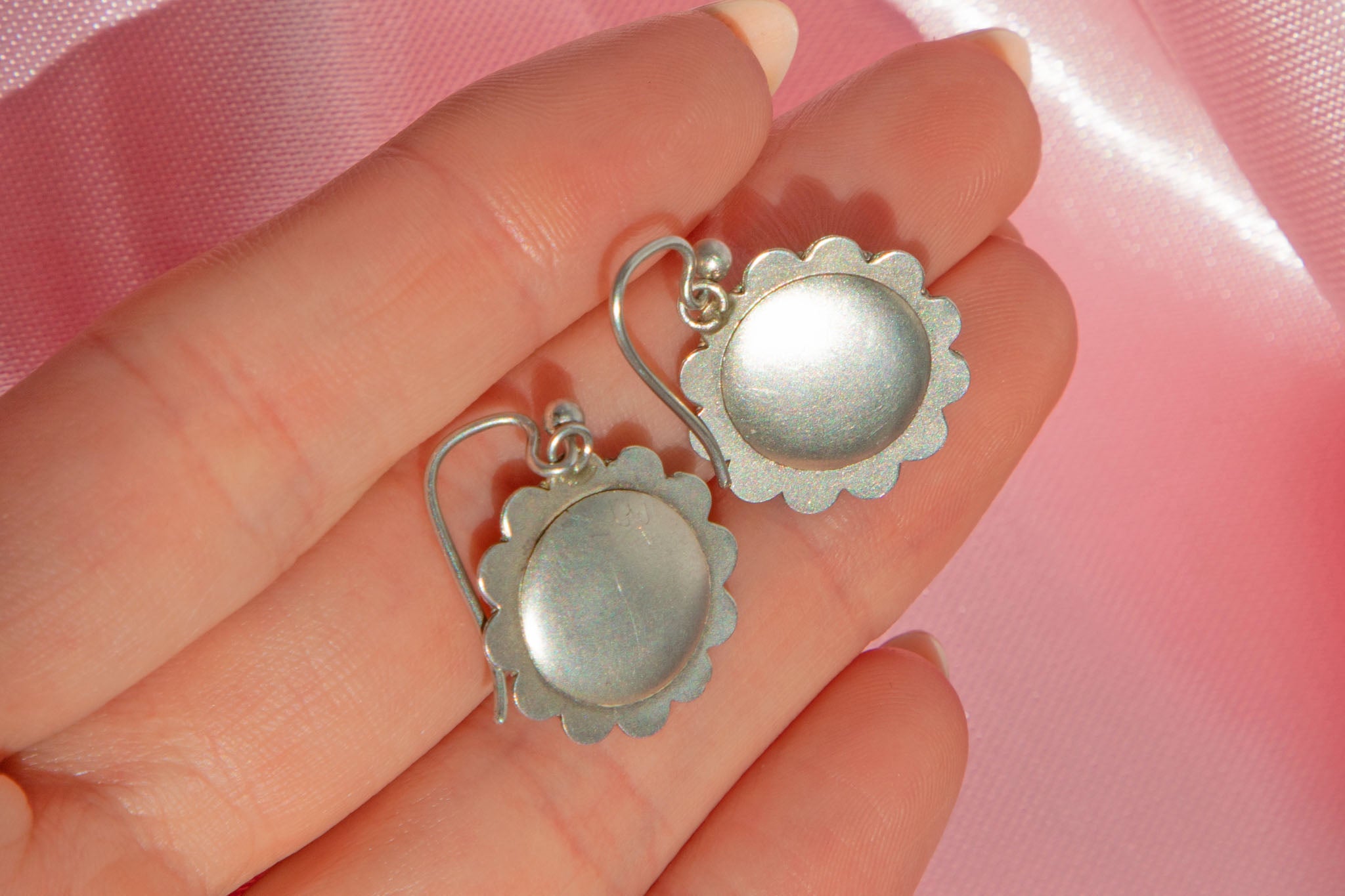 VERY GOOD. These antique Silver roundel flower earrings are in very good condition! The only thing stopping this pair from receiving an excellent rating is that there are a few scratches to the back of the earrings, however this will not be seen when you wear them. Aside from this, all of the components are securely affixed to one another and the Silver has accrued an admirable patina. Complete with Shepard's hooks, they can be worn with comfort and confidence!