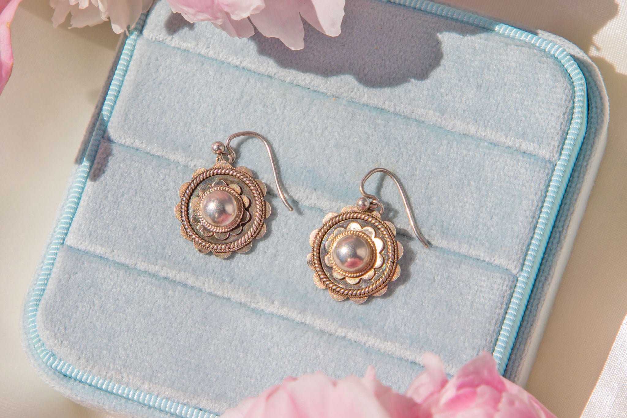 Bursting with charm from their every crevice, these antique Silver roundel flower earrings are simply heavenly! Layers of floral shapes form the drops of these Victorian earrings, with a domed centre adding a sense of depth.