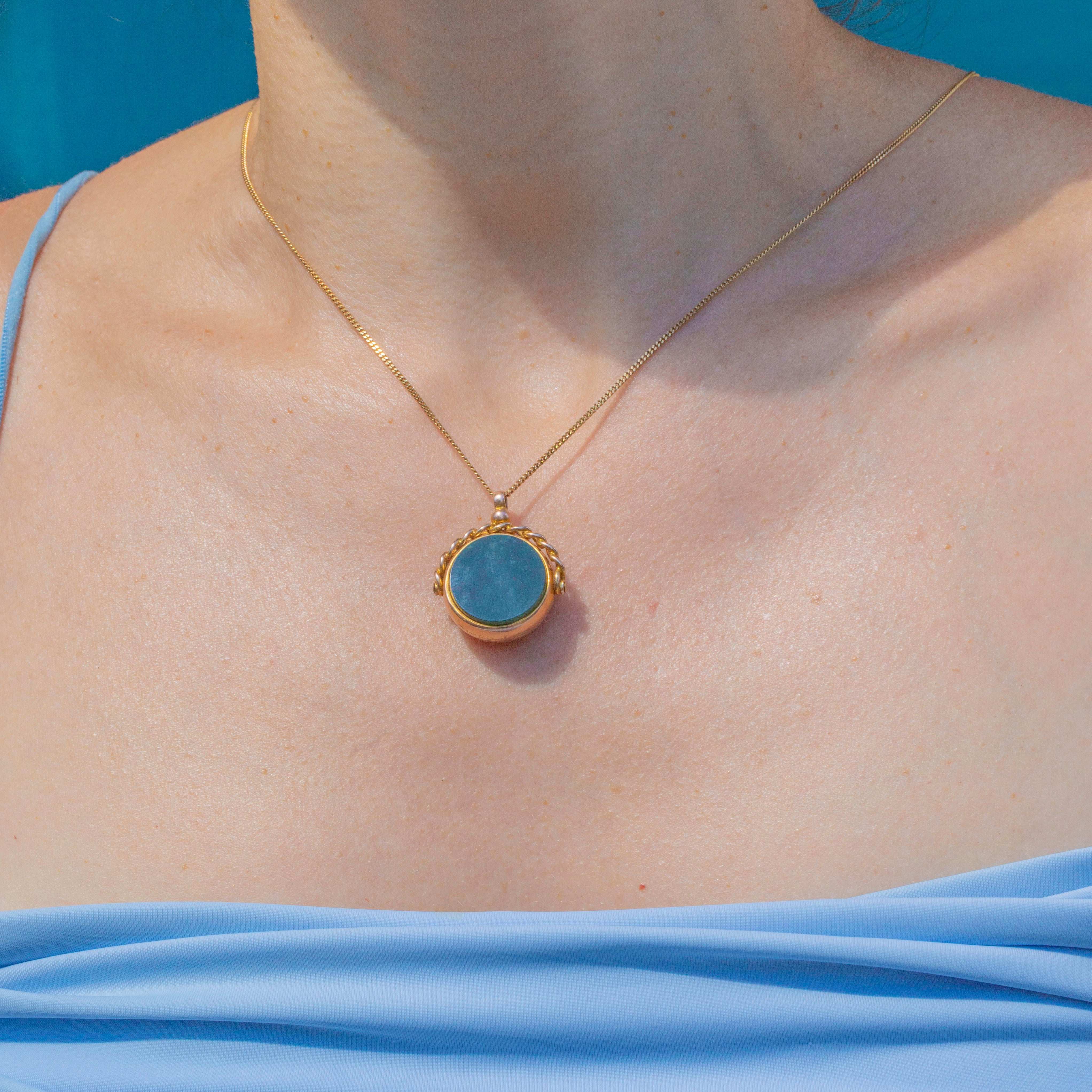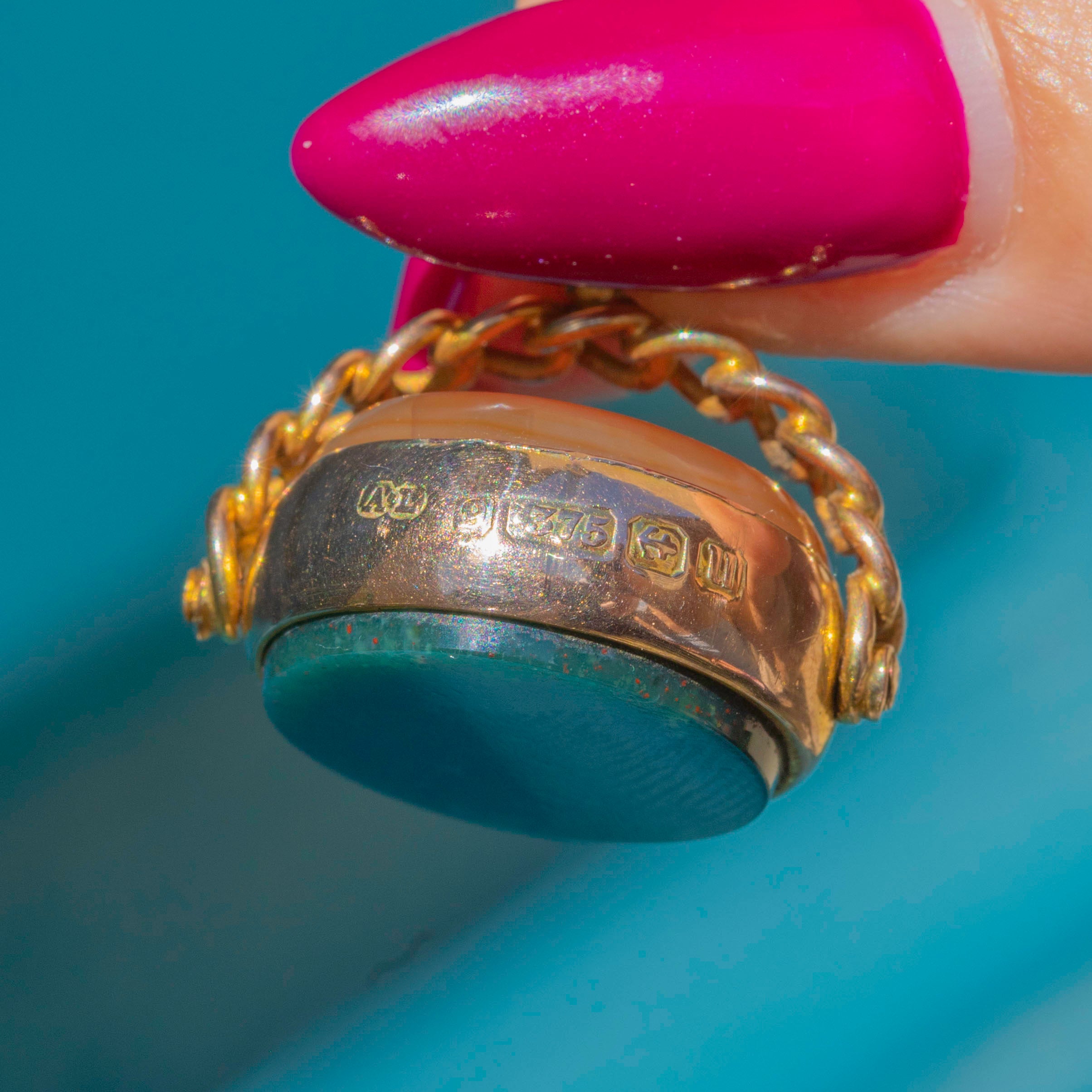 Inlaid with a smooth burnt orange Carnelian on one side and a contrasting forest green Bloodstone, this fully hallmarked spinner fob pendant (dated to 1919) radiates antique charm from every angle.