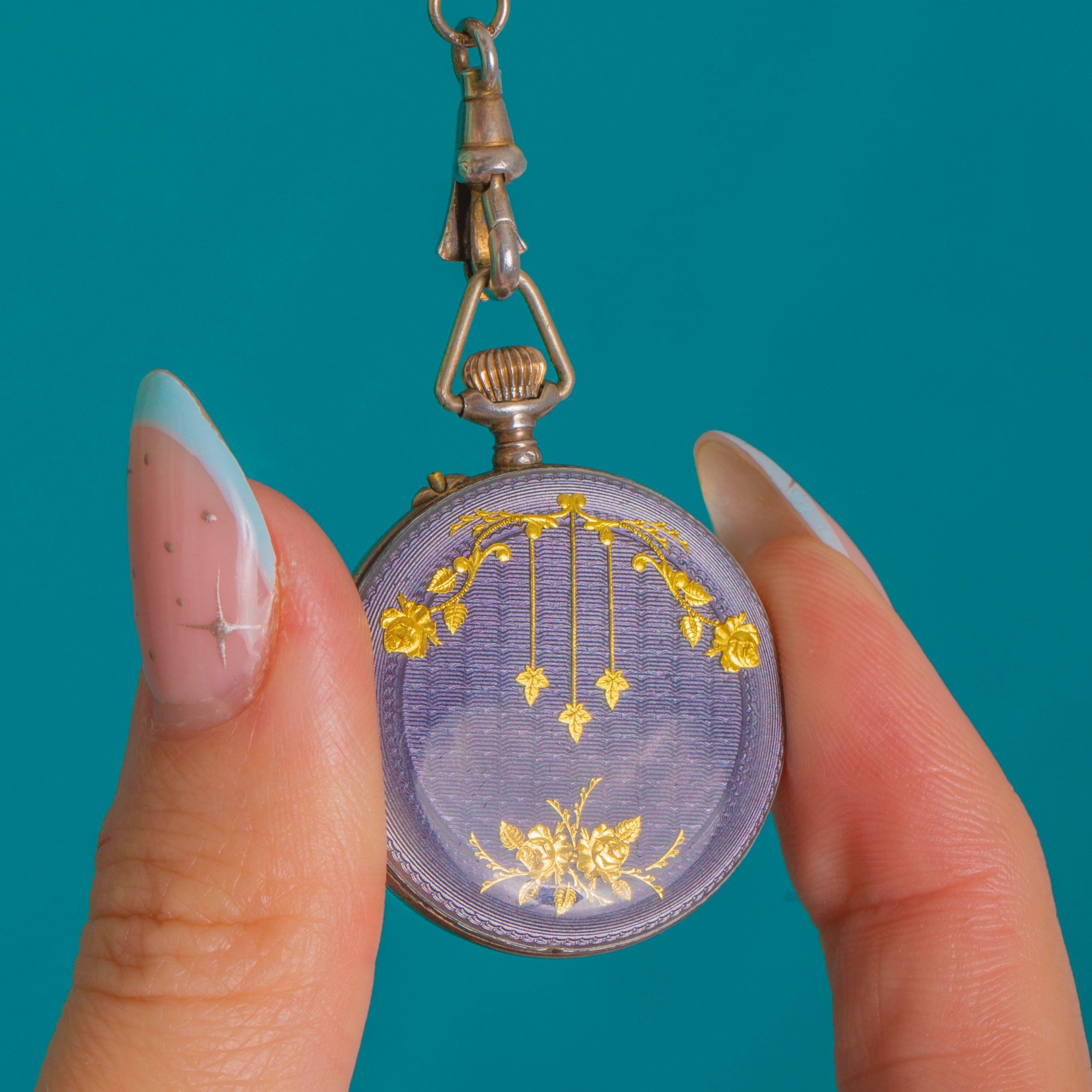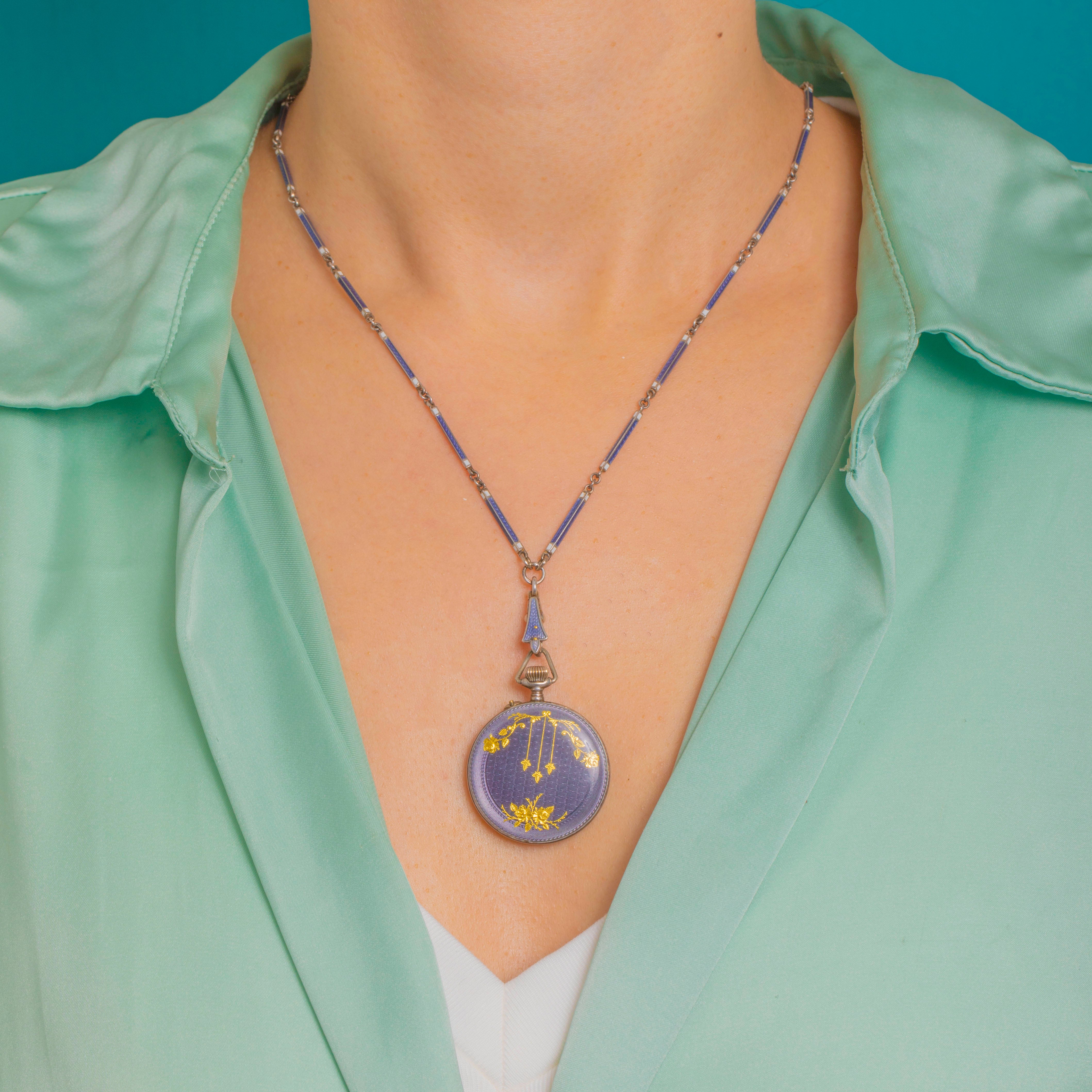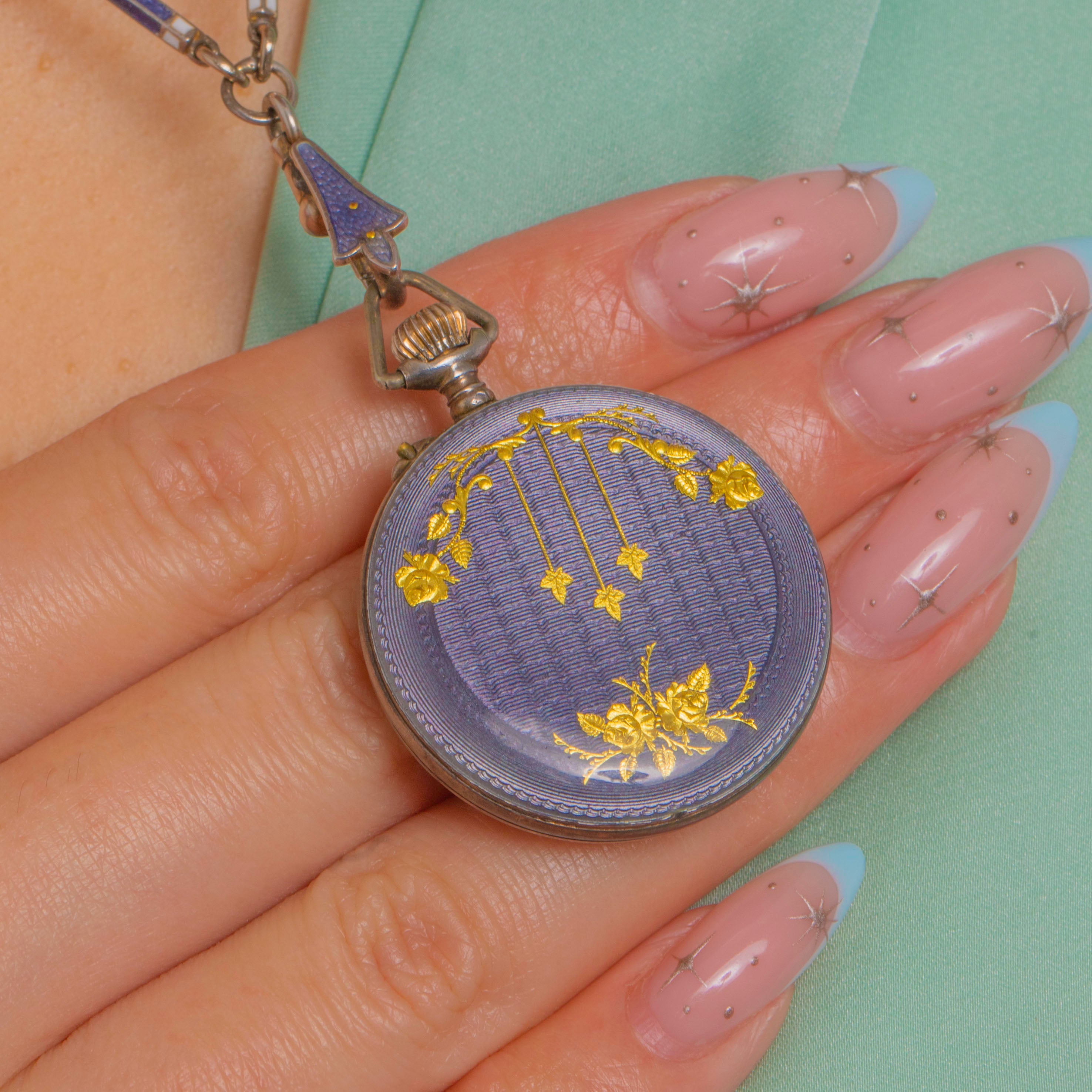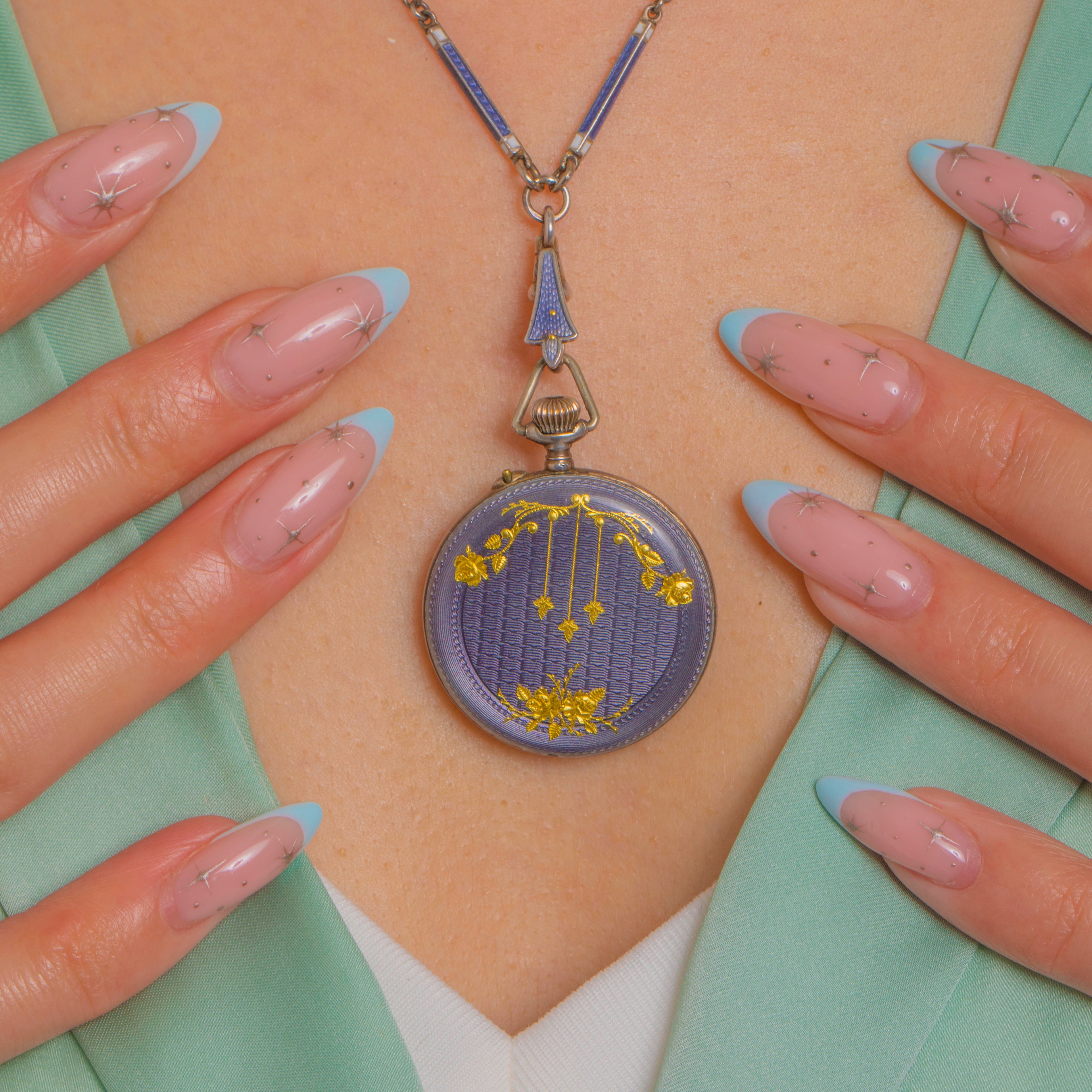 A refined antique Swiss pendant watch and matching bar-link chain, bathed in translucent mauve-blue guilloché Enamel and decorated with delicate Gold garlands, tiny stars and a floral bouquet. The circular case is crowned with a fluted winder and triangular bow, while the dial presents black Arabic numerals framed by a coordinating blue Enamel bezel for a beautifully cohesive look. An Enamelled arrow-link connector and the elegant blue guilloché bar-link chain complete the ensemble with effortless Victorian poise.