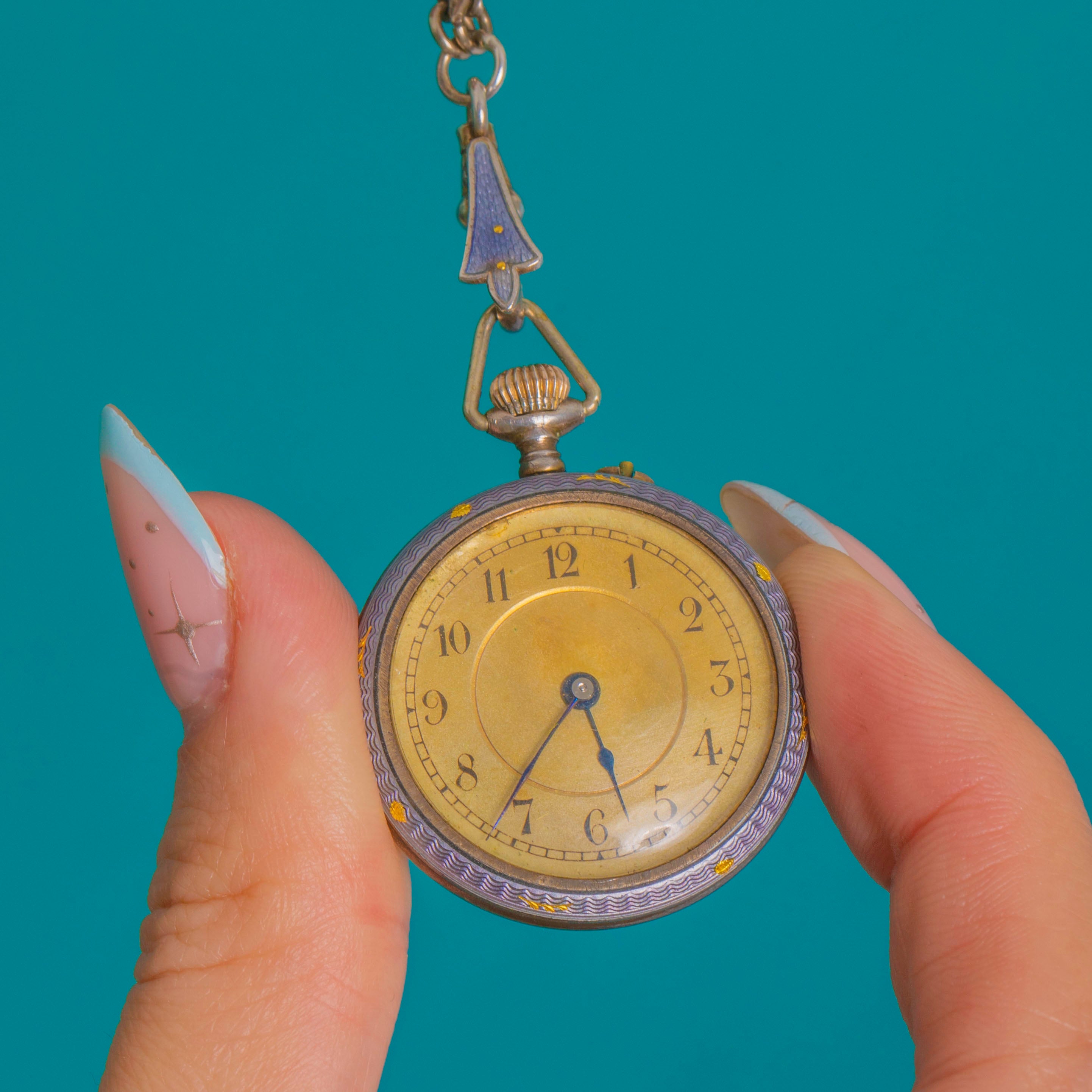 GOOD: The Enamel presents beautifully and, to our eye, appears perfect with no chips or losses. The Silver case and Enamelled chain show gentle age-related surface wear and patina; the crystal has scratches and the dial shows light marks. The movement is not ticking and only one blued hand is present.