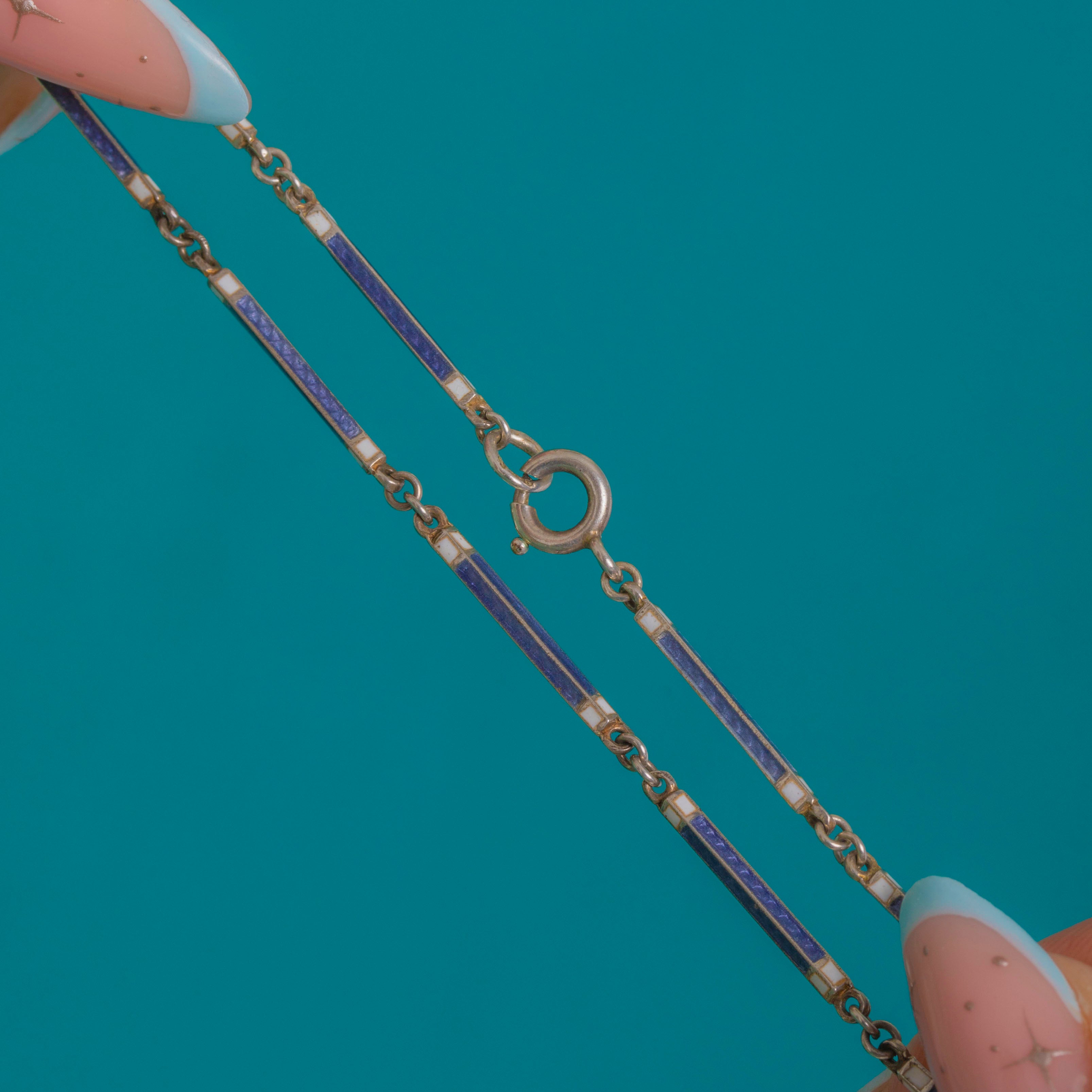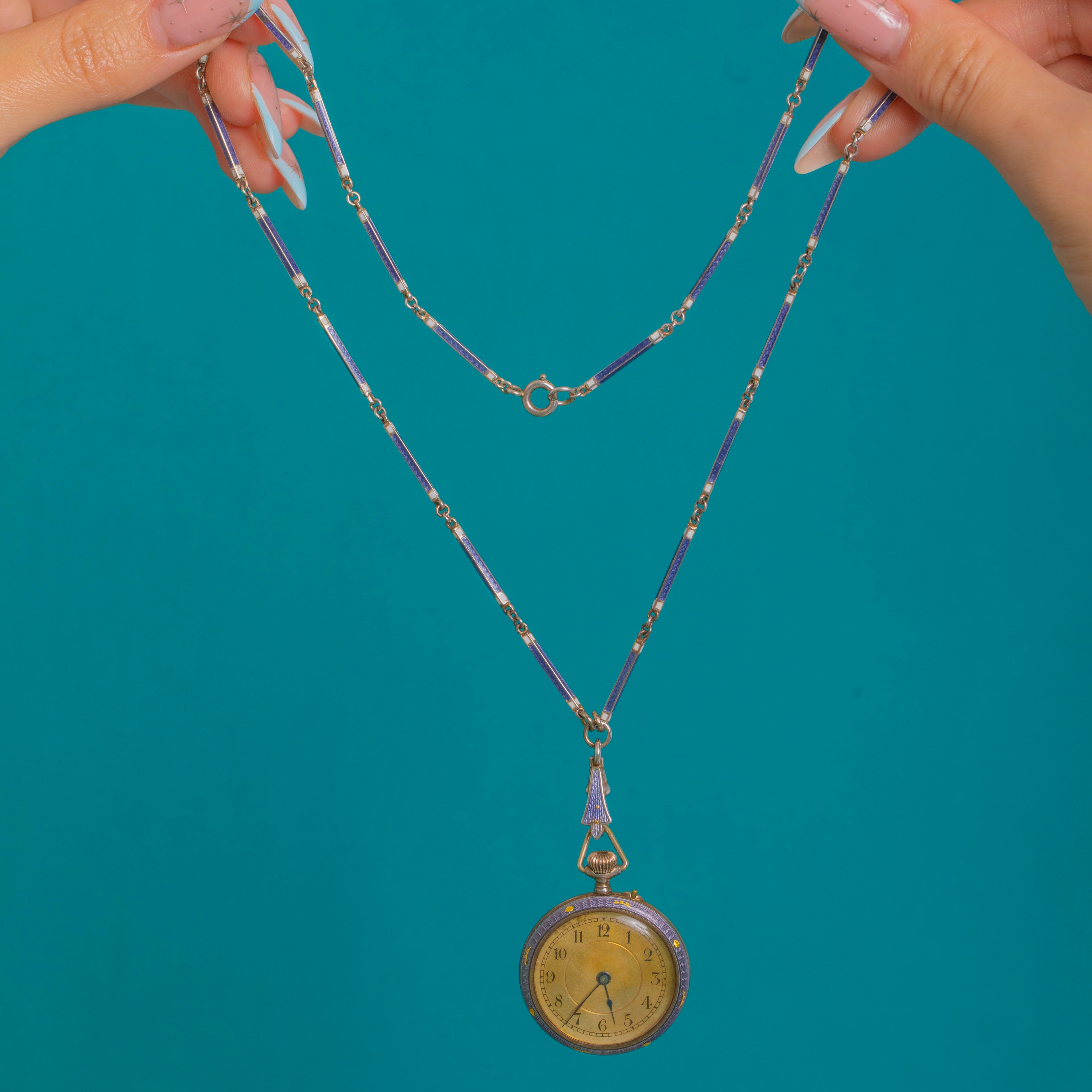 Crafted in Silver with richly glossy Enamel, this coordinated watch-and-chain set epitomises late 19th-century neoclassical taste. The chain closes with a spring ring and bears a Swiss bear stamp on the jump ring, underscoring its Swiss origin. A poetic jewel, whether worn as a pendant or collected as an objet de vertu; please note the movement is not currently running.