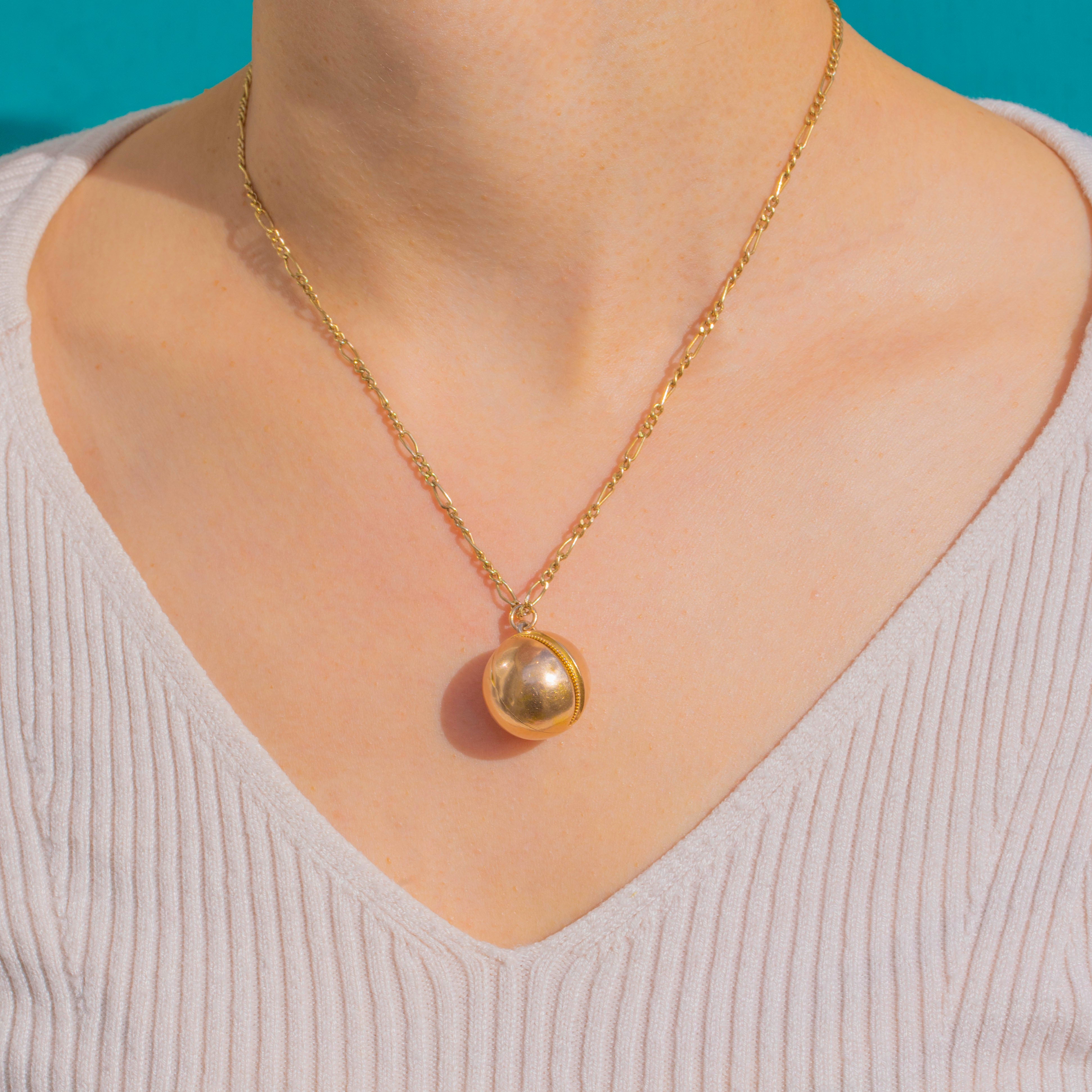 A charming Victorian 15ct Gold orb trinket pendant with timeless, sculptural simplicity. The smooth, high-domed sphere is encircled by a fine beaded milgrain band at the equator, adding delicate texture and definition to the glossy Gold surface.