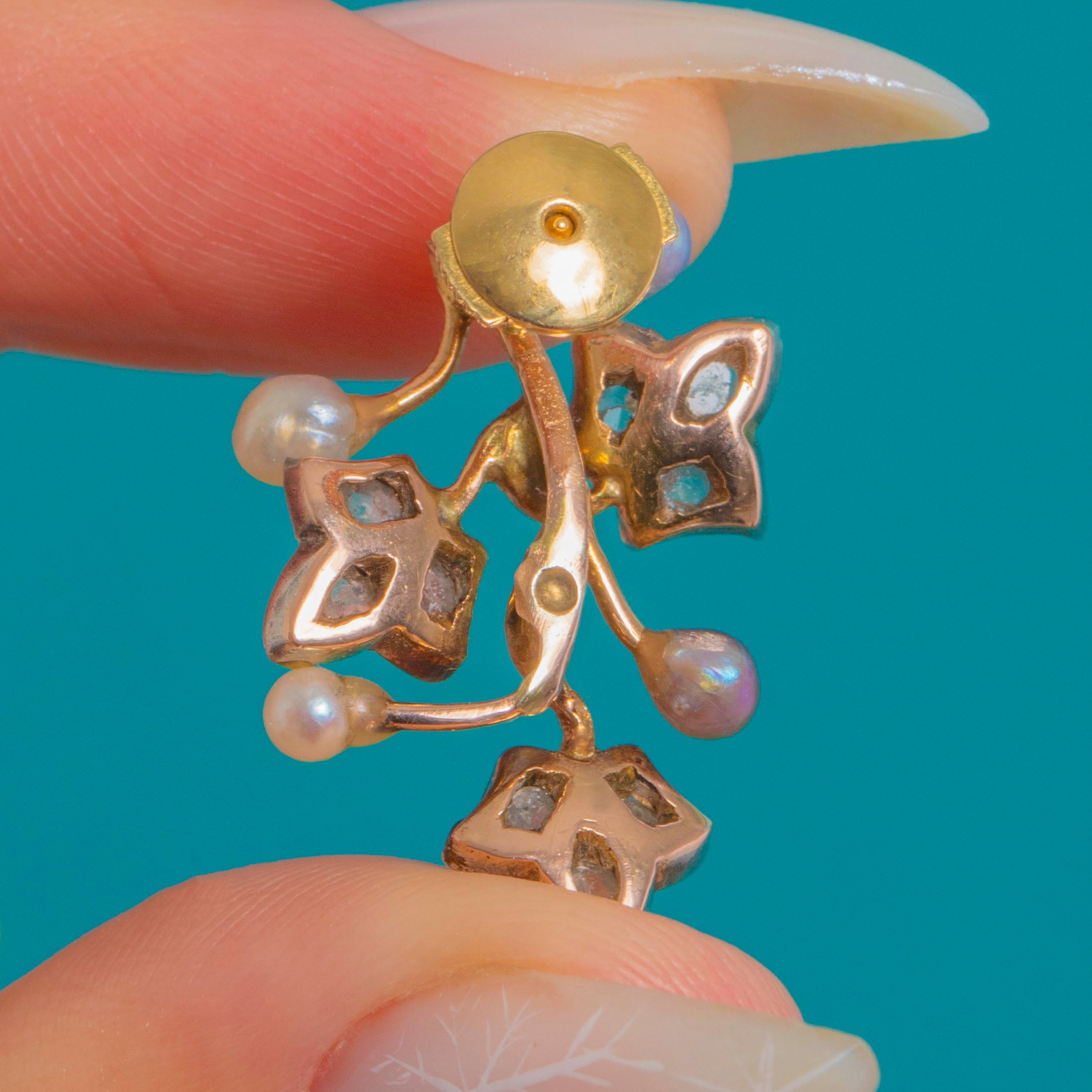Antique Victorian 18ct Gold Natural Pearl Diamond Leaf Earrings