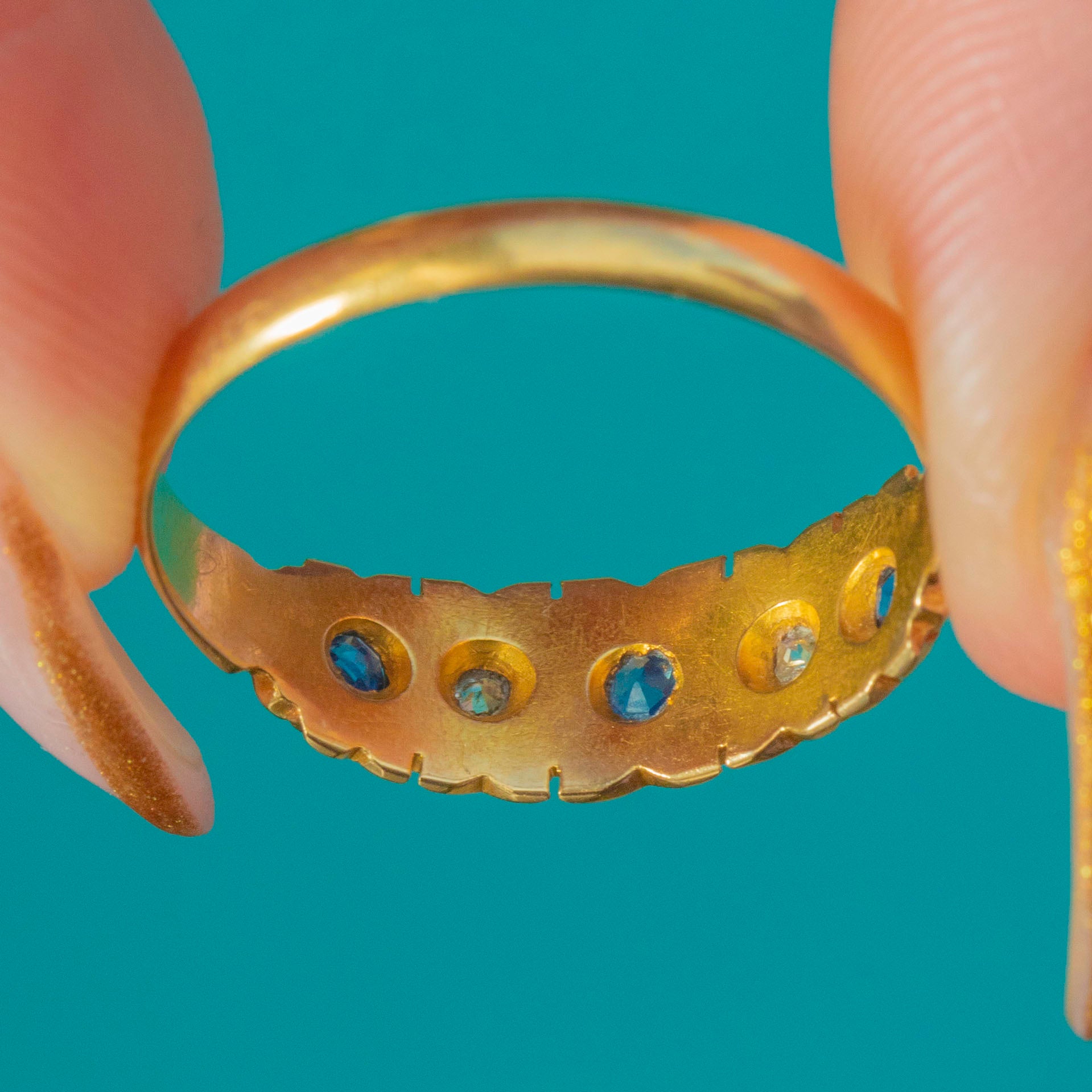 The three Sapphires offer a rich blue glow, complemented by two bright antique Diamonds that bring lively sparkle to the hand. Beautifully crafted and wonderfully preserved, it’s a classic gypsy ring with all the character and craftsmanship of the late 19th century.