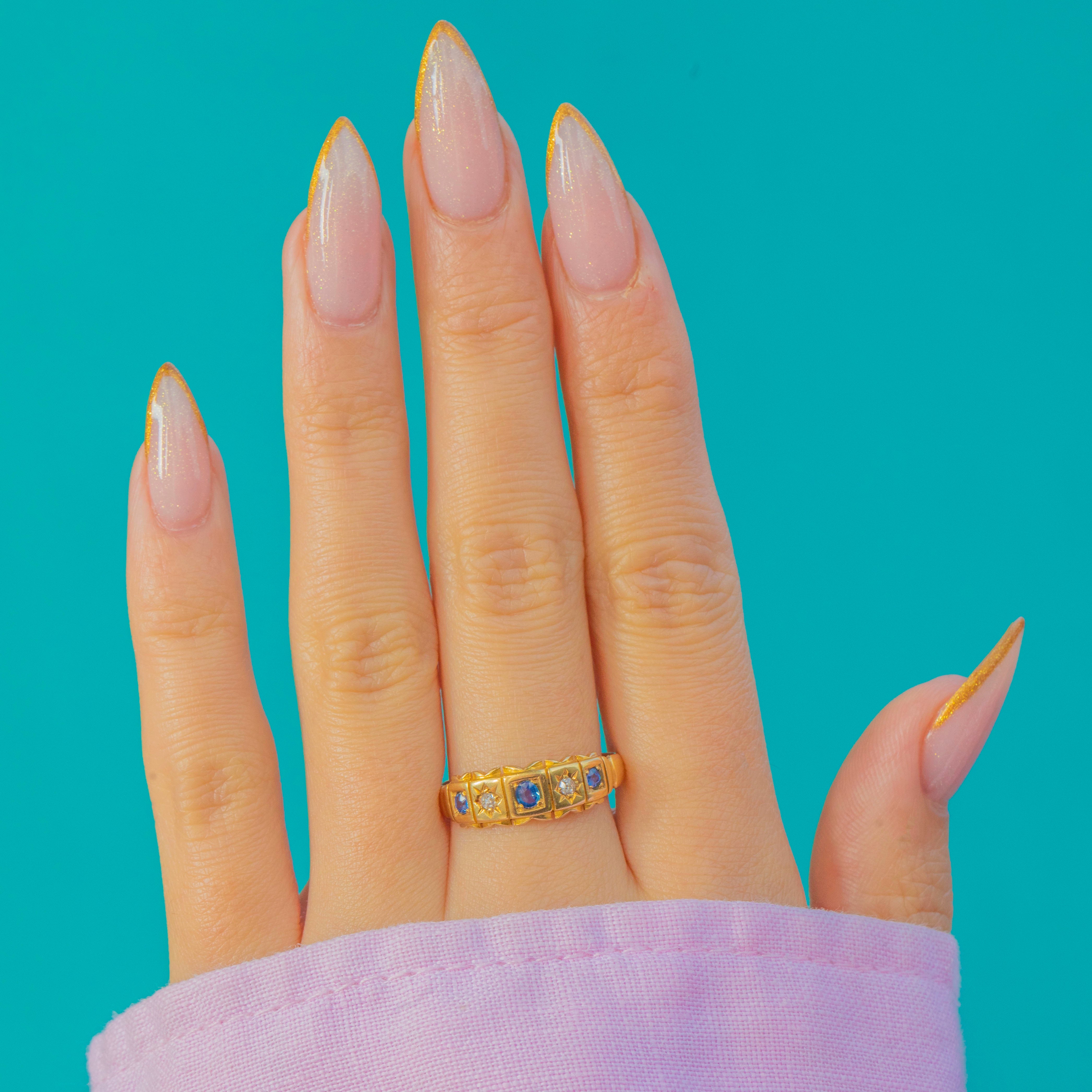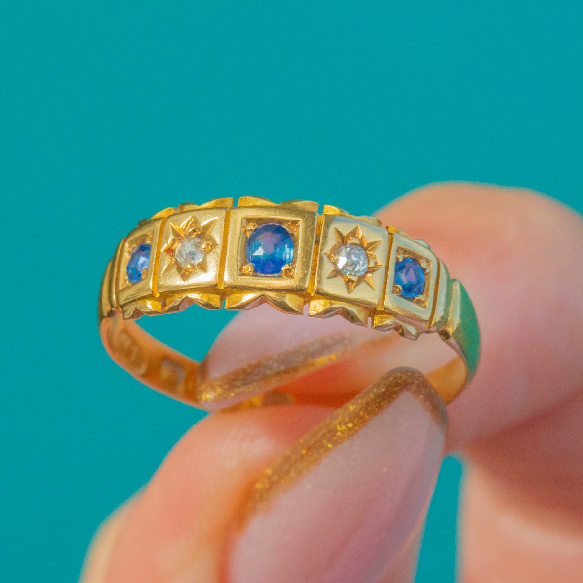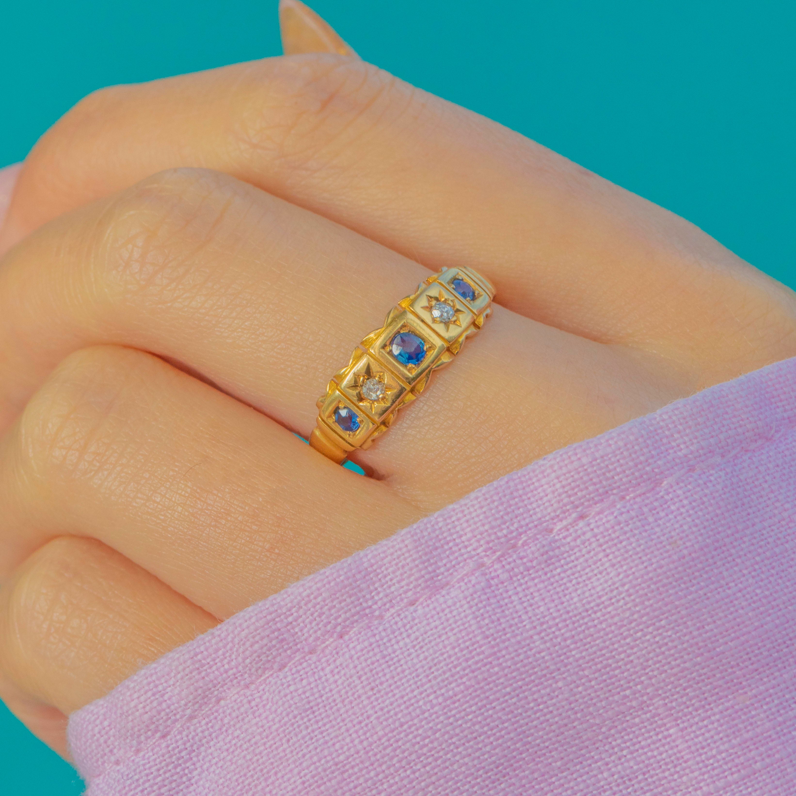 A wonderful late Victorian 18ct Gold gypsy ring set with natural Blue Sapphires and sparkling old mine cut Diamonds, fully hallmarked for Chester, 1899. The ring features alternating square and star-shaped settings, each gemstone framed in crisp, deeply engraved details—an iconic Victorian design that is both charming and effortlessly wearable.