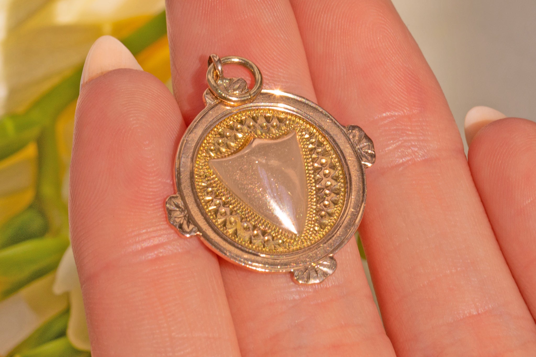 A splendid Art Deco 9ct Gold medal fob pendant for your collection! This piece has a blank shield on its front, which could be personalised with an engraving of an initial as a birthday gift to someone special.