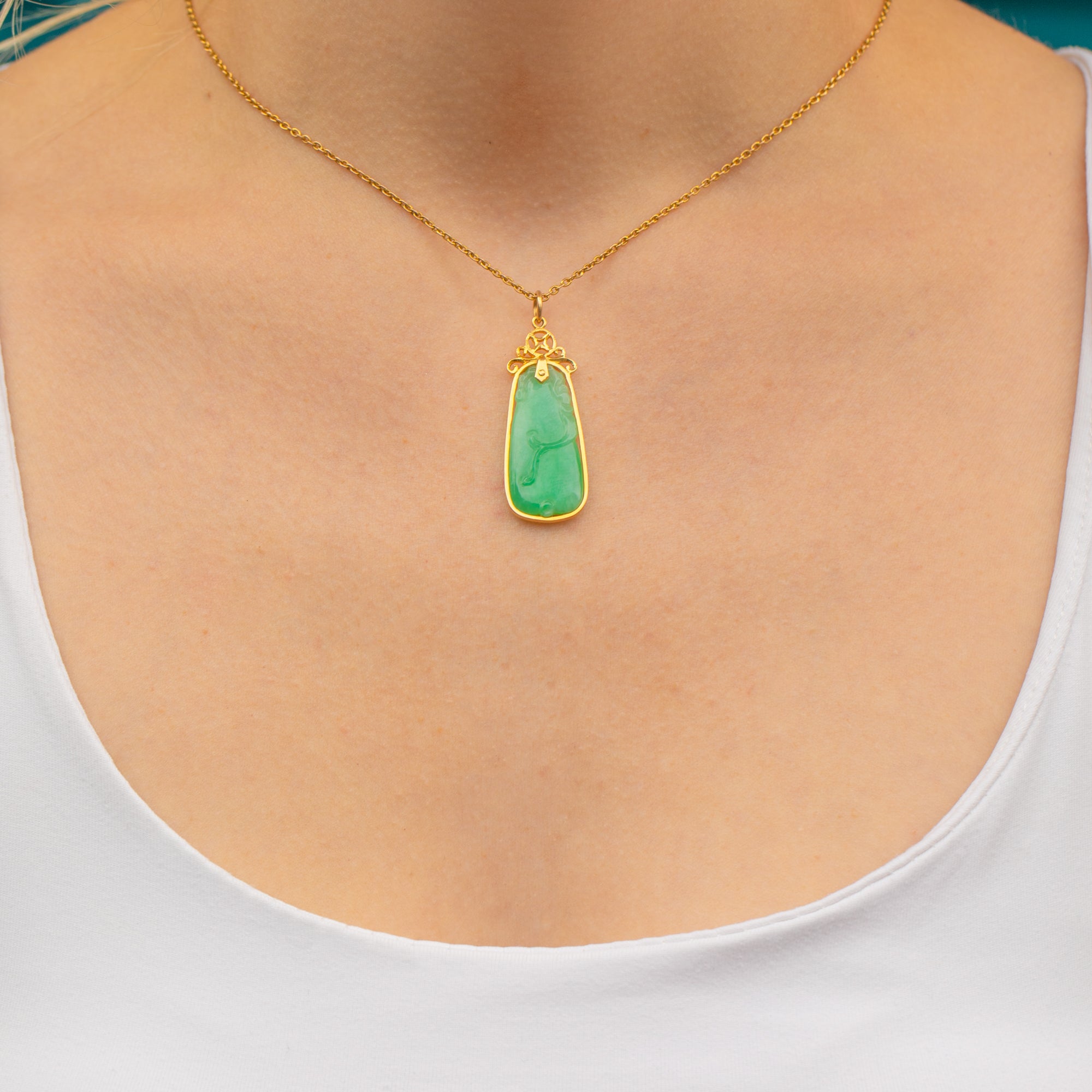 Feast your eyes on this 14ct Gold carved Jade pendant! This piece has an earthy feel, and we adore the detailing of this lovely Jade pendant with the fancy top to the Art Deco pendant being the cherry on top of the cake!