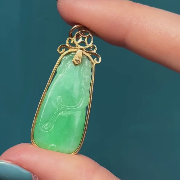 EXCELLENT. This 14ct Gold carved Jade pendant is in wonderful condition, the Jade is chip free and is held securely in her 14ct Gold settings! Enjoy wearing her and suspend her from a chain of your choice!