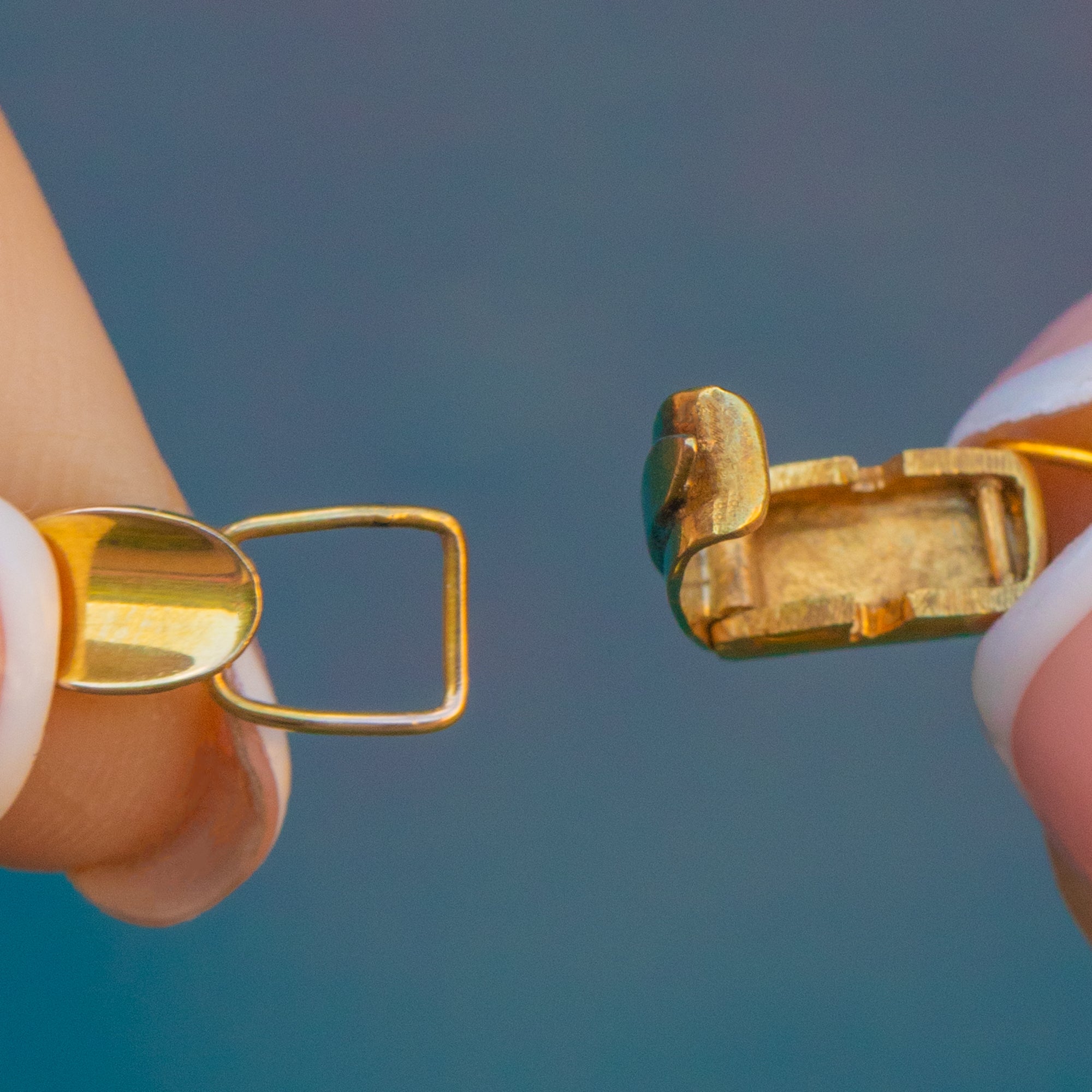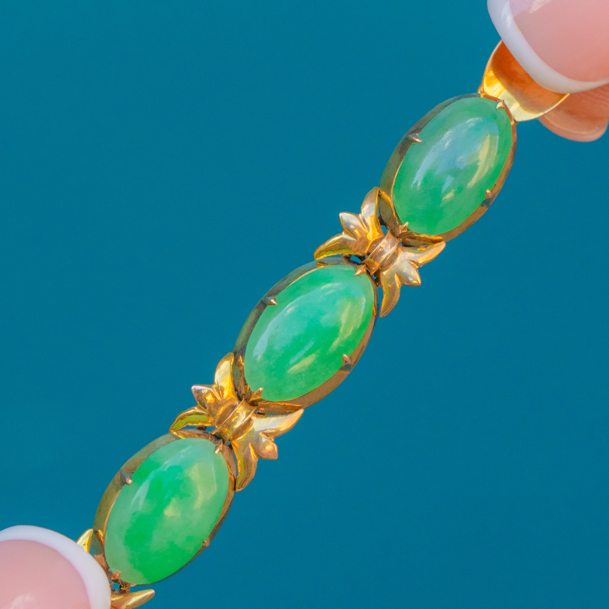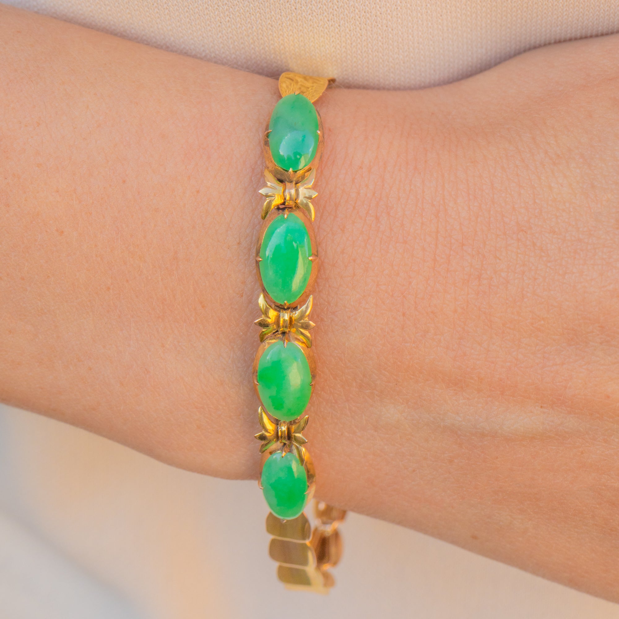 EXCELLENT. We are pleased to present this Art Deco 15ct Gold Jade bracelet in excellent condition. Each Jade cabochon is perfectly smooth and securely held within its claw settings. The bracelet itself has a wonderfully bright lustre and sits comfortably against your wrist, there is not a scratch to note and the 15ct Gold is brightly saturated. The unique clasp is in perfect working condition allowing you to wear this phenomenal antique Jade bracelet with utmost confidence!