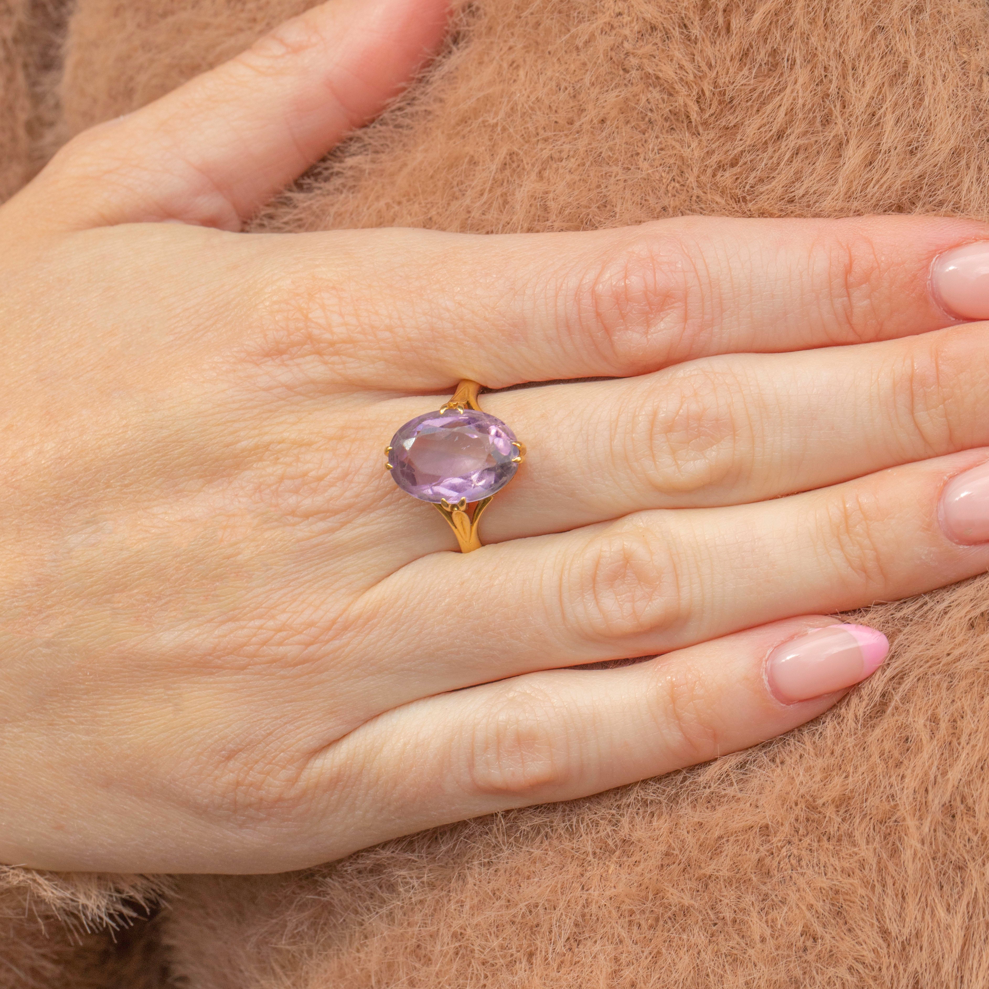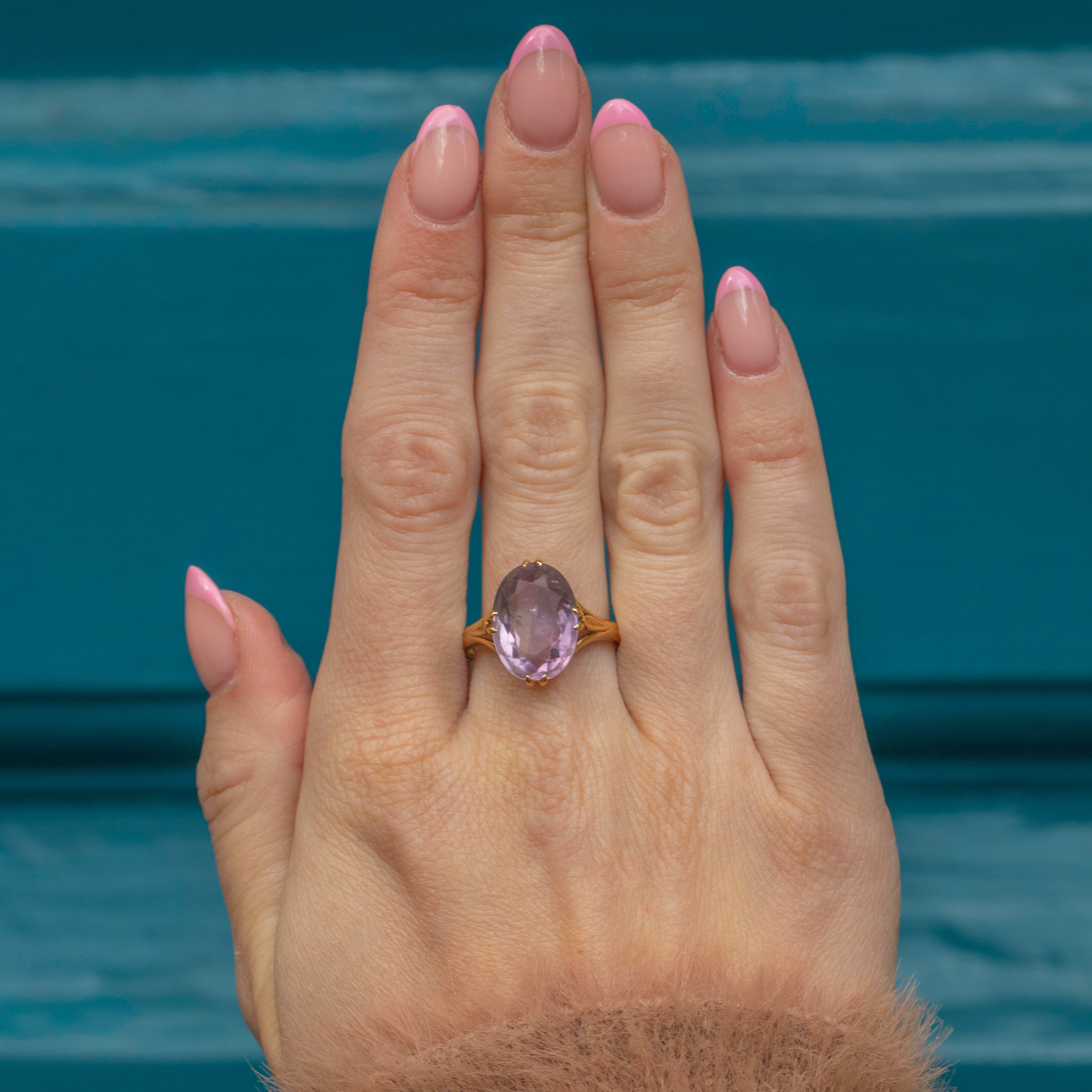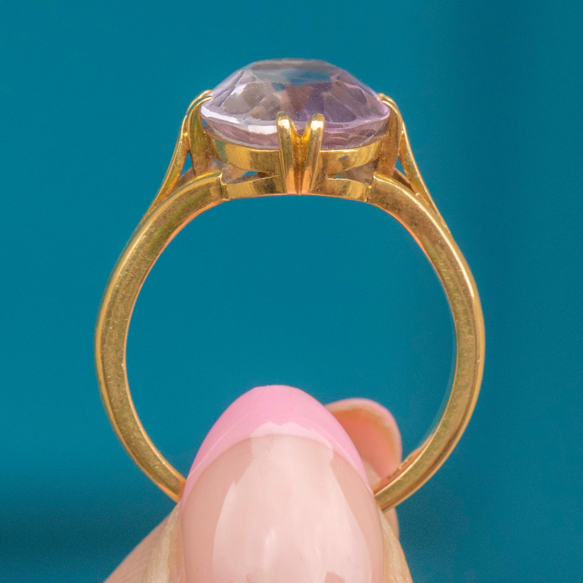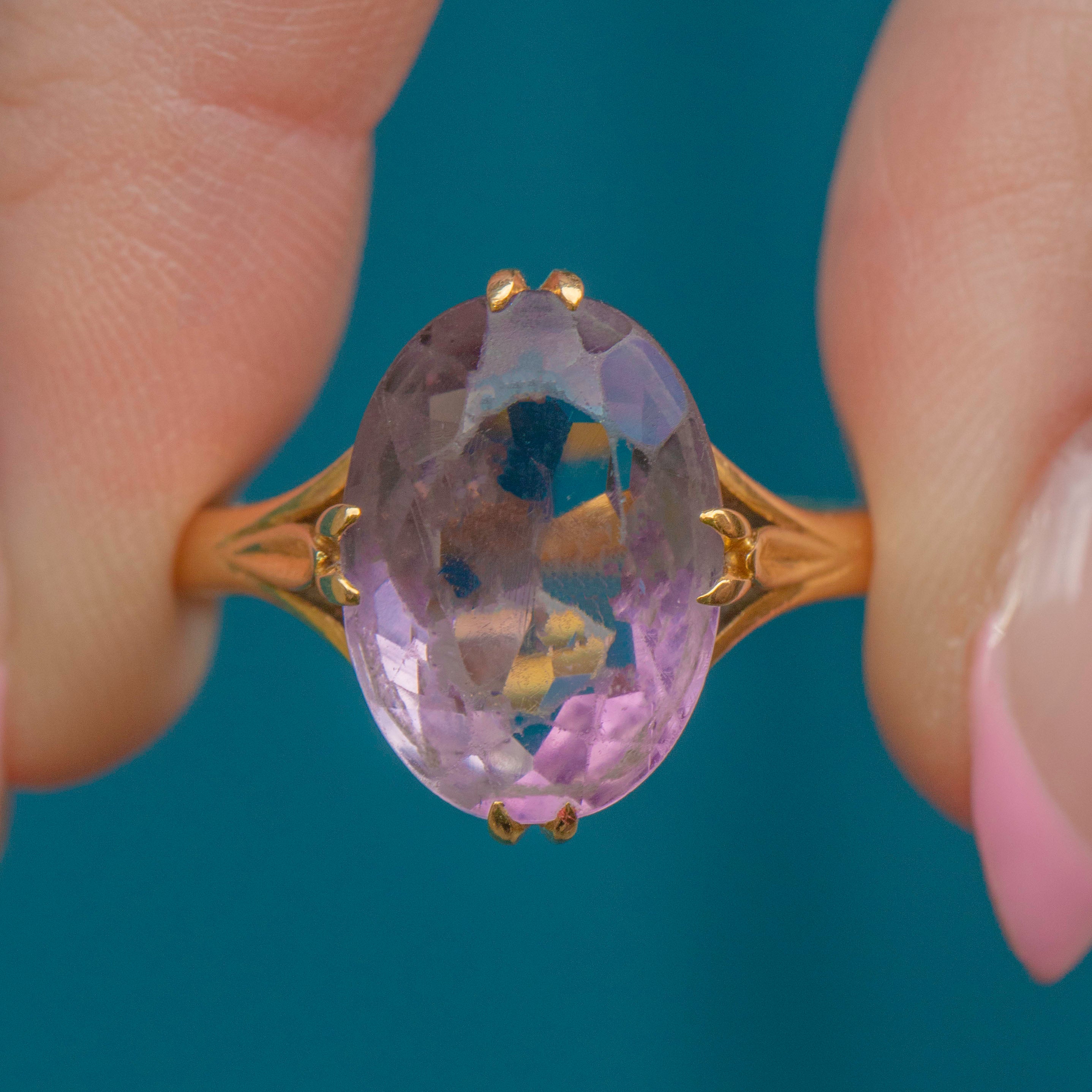 VERY GOOD. This Art Deco 18ct Gold Amethyst ring is in very good condition. The Amethyst sits securely within the claw settings, with fabulous facets coming to life under the light. When held up to the light you can admire the natural inclusion in the Amethyst, adding to her antique charm. The Gold is rich and buttery throughout, there is a previous resize mark on the back of the band and some discolouration from this, but this is not noticeable while the ring is worn. All in all, this Art Deco Amethyst ring will make a stunning addition to your collection!