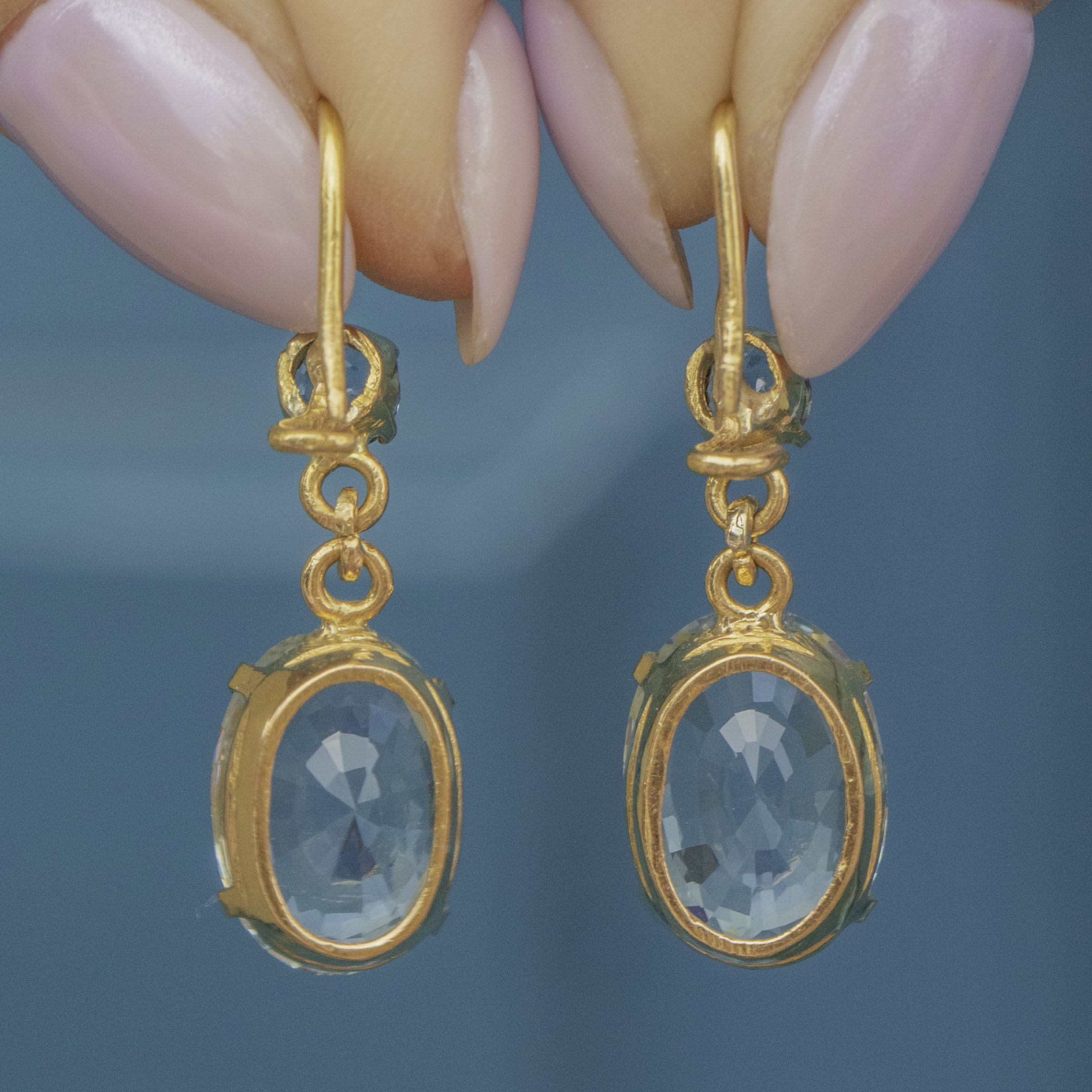 VERY GOOD. These Art Deco 18ct Gold Aquamarine drop earrings are in very good overall condition. The earrings are each set with two Aquamarines, the bottom ones a plump oval, together totalling 5.80ct. The earring hooks go into the lobe with ease and can be worn comfortably all day long, hooking into a c-clasp back for added security.