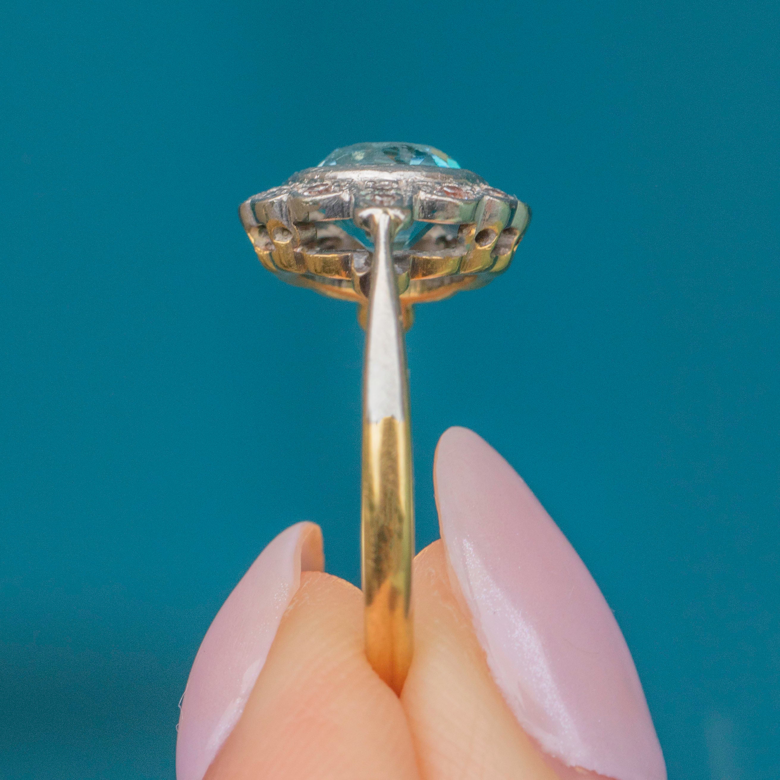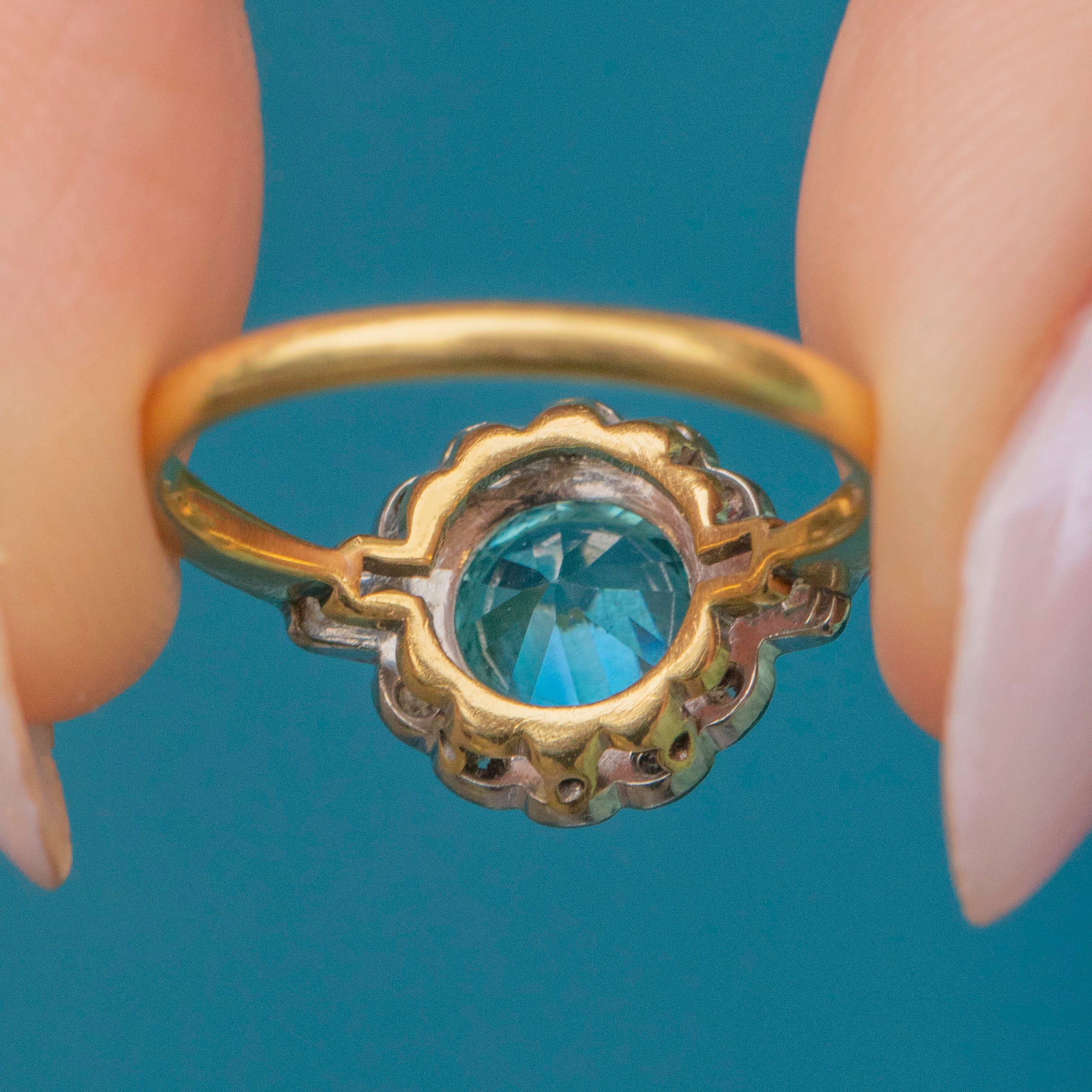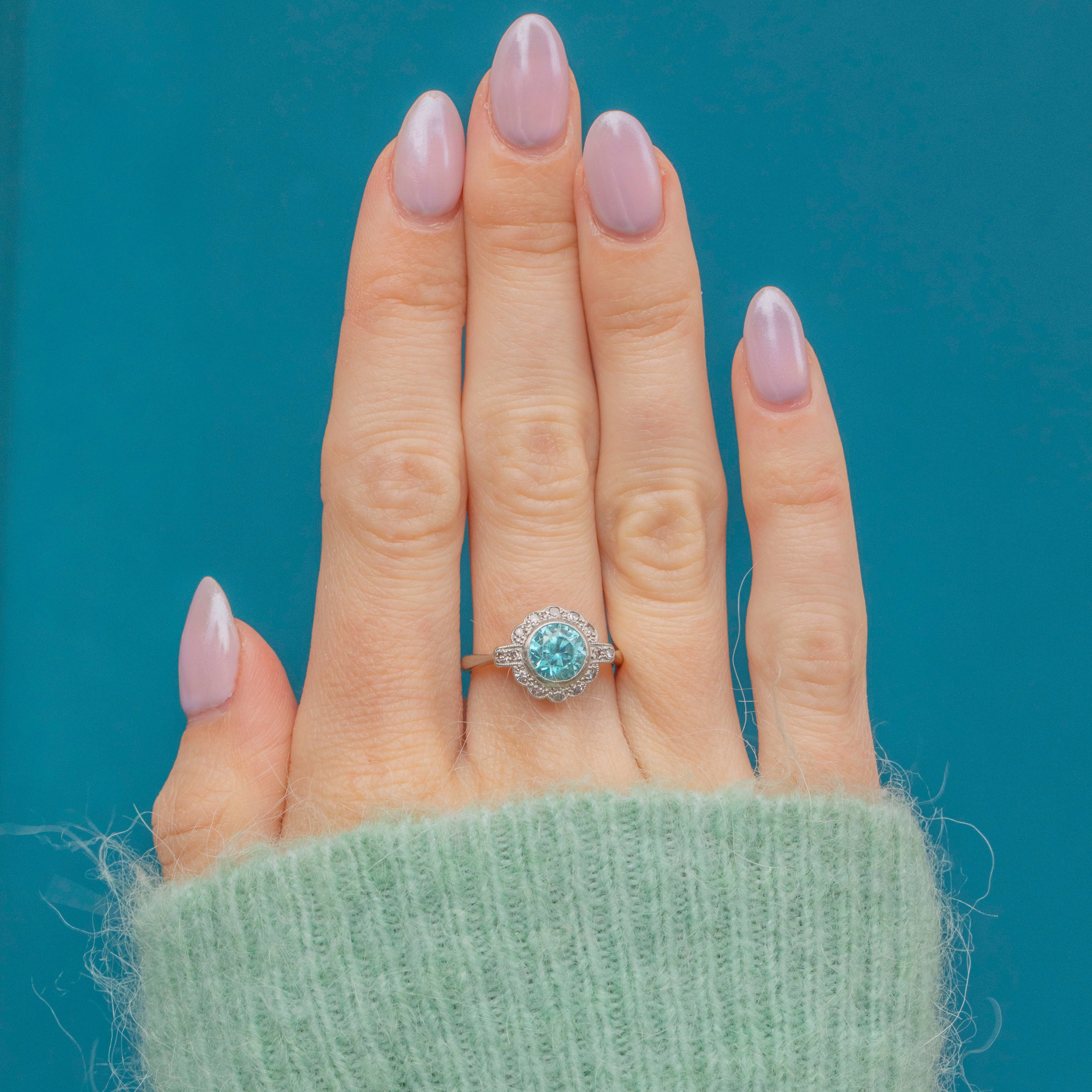This Art Deco 18ct Gold blue Zircon Diamond cluster ring is simply breathtaking! A crisp 2.15ct blue Zircon takes centre stage, offering a myriad of glacial sparkles, complimented effortlessly by a halo of scintillating Diamonds.