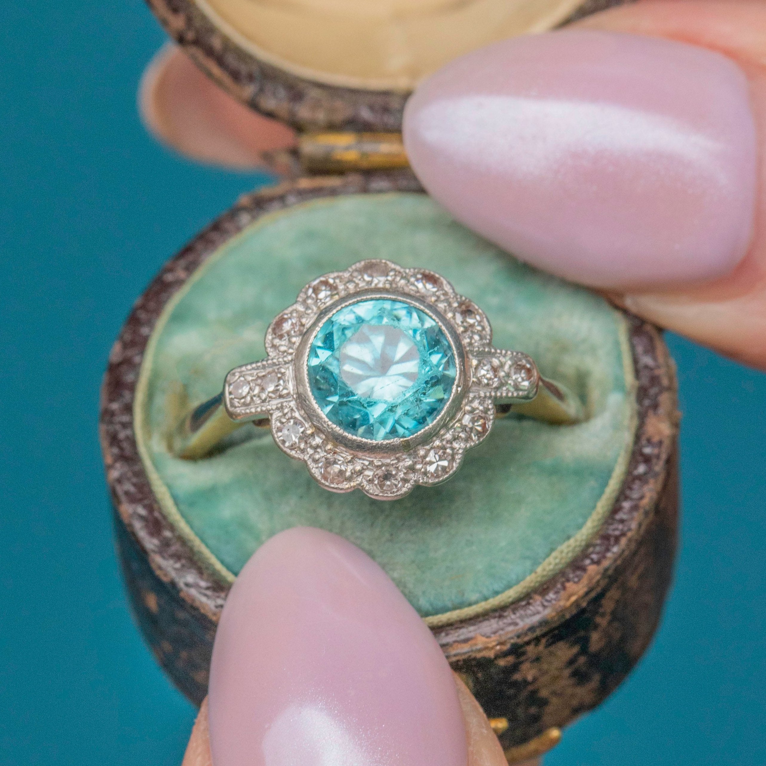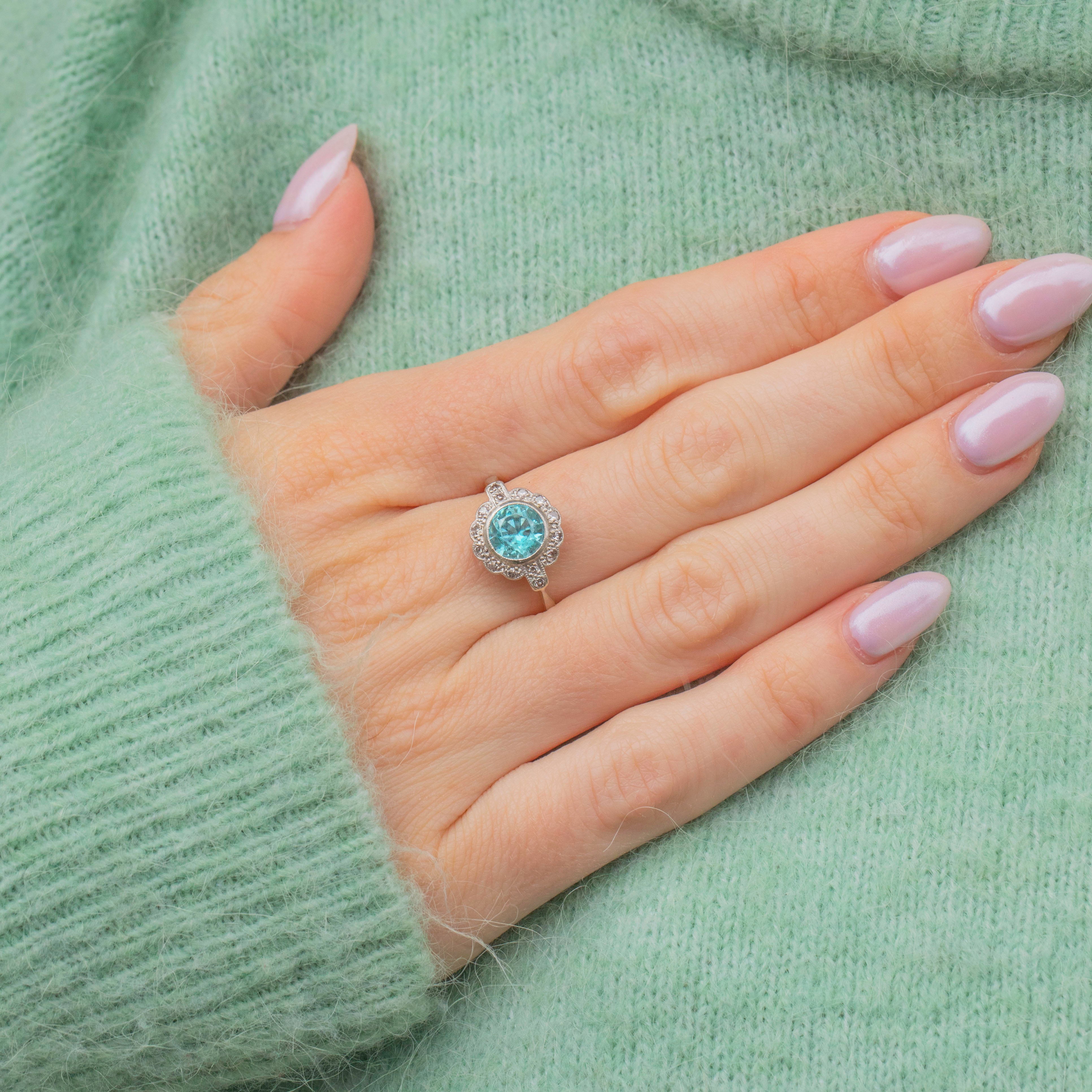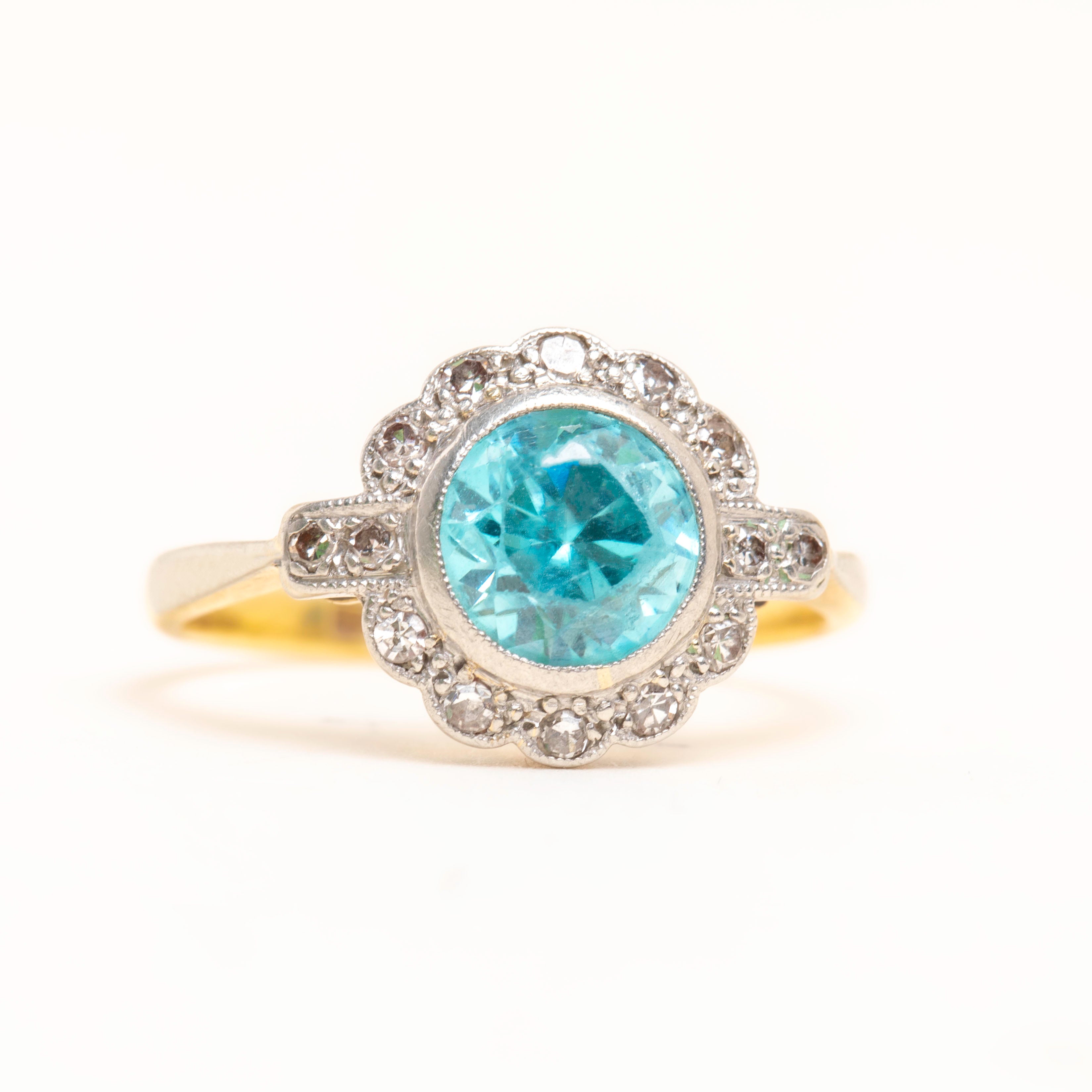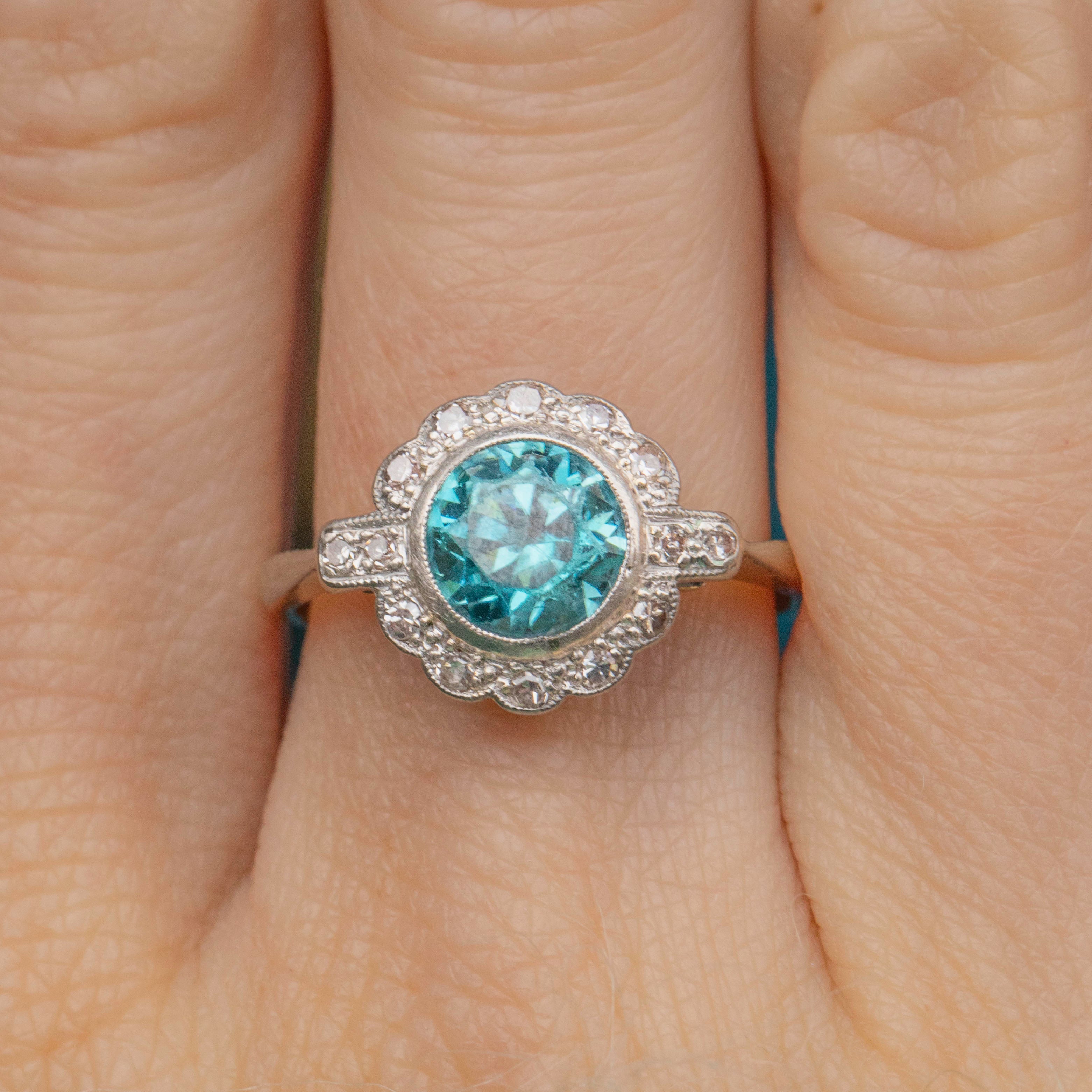 This Art Deco 18ct Gold blue Zircon Diamond cluster ring is simply breathtaking! A crisp 2.15ct blue Zircon takes centre stage, offering a myriad of glacial sparkles, complimented effortlessly by a halo of scintillating Diamonds.
