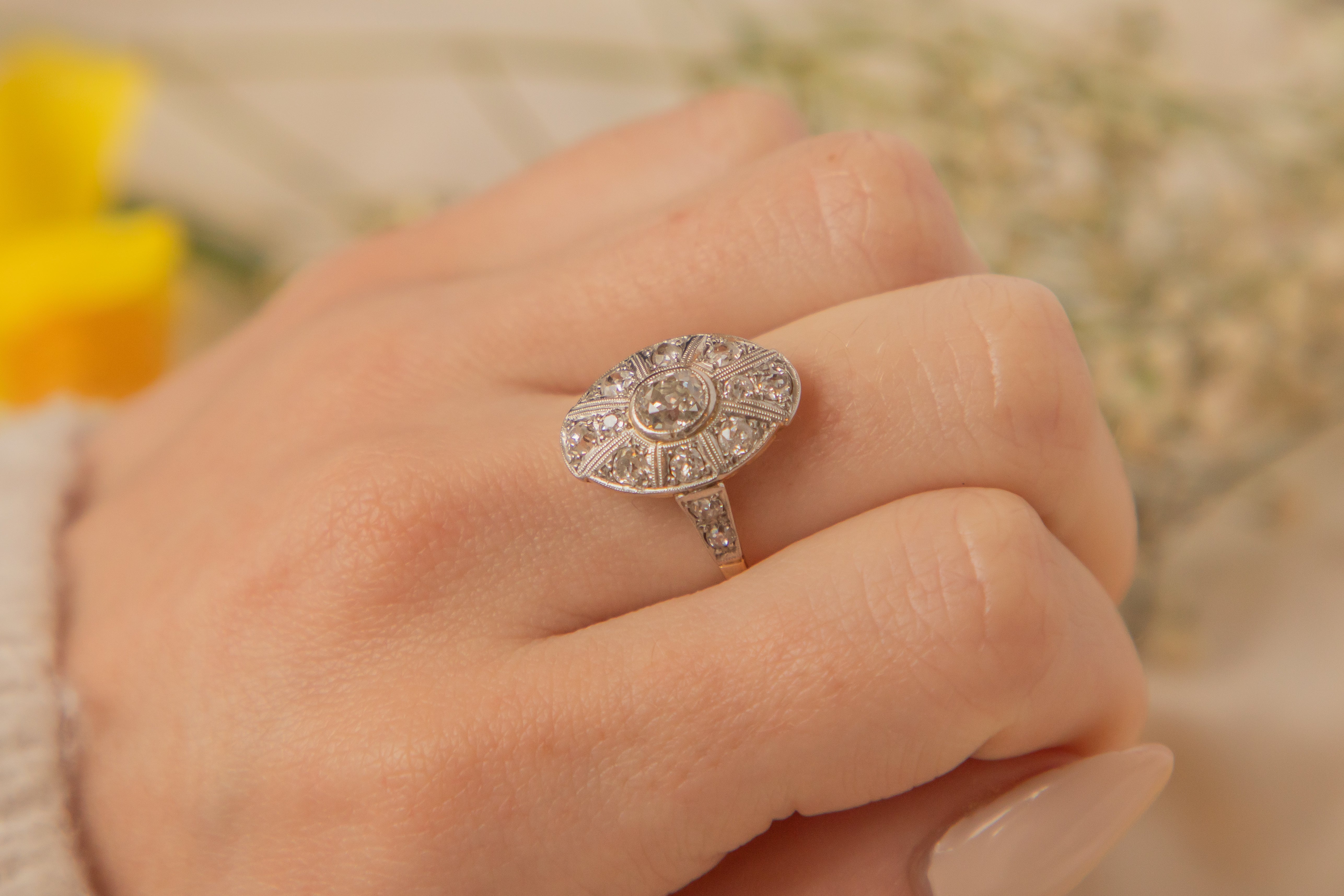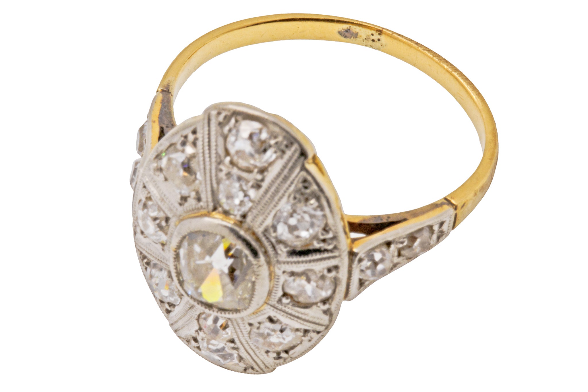 VERY GOOD. This is a lovely Art Deco 18ct Gold Diamond cluster ring in very good condition. The Diamonds are all securely set and have the most gorgeous bright sparkle. The ring only has one resize mark on the back of the band, which is only really visible on the inside of the piece. The central Old Mine Cut Diamond is I-J colour and Si-i clarity, and only one carbon spot inclusion is noticeable up close. The ring has a classic Art Deco feel, and you cannot escape her sparkle!