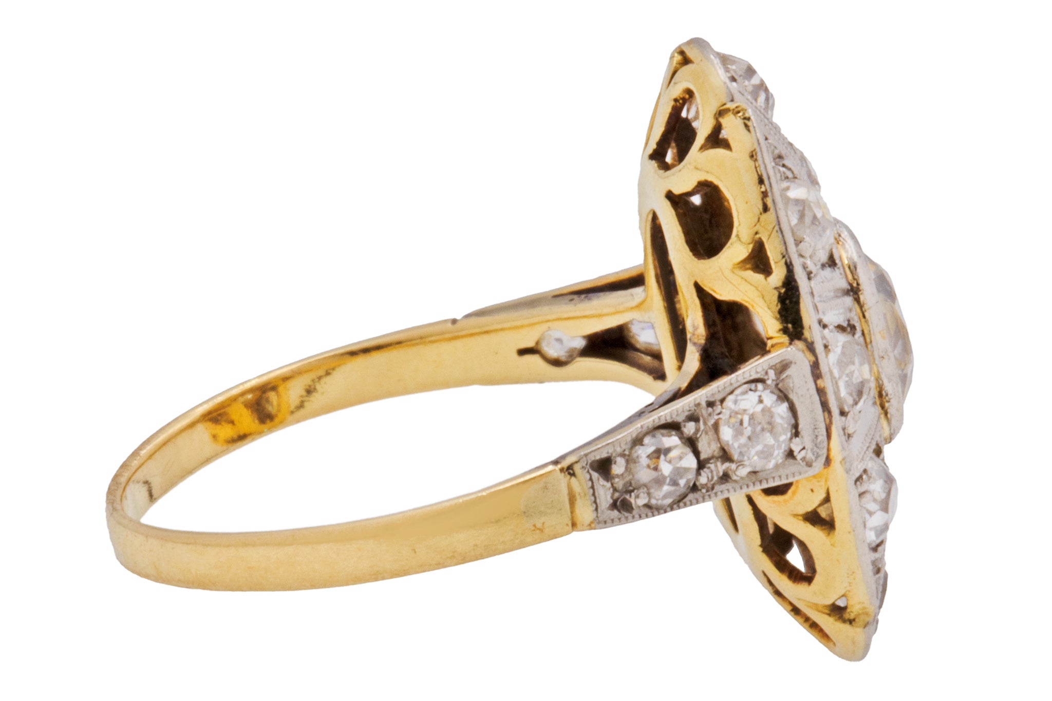 MATERIALS: Tests as 18ct Yellow Gold shank, Platinum settings, Diamonds (I-J colour, Si-i clarity).