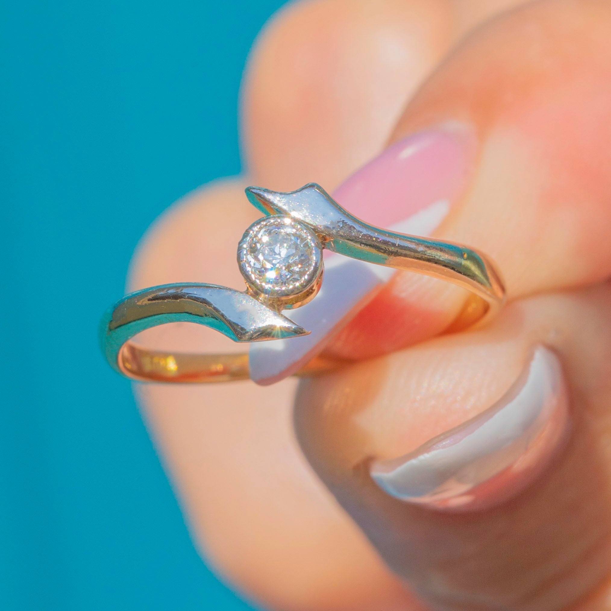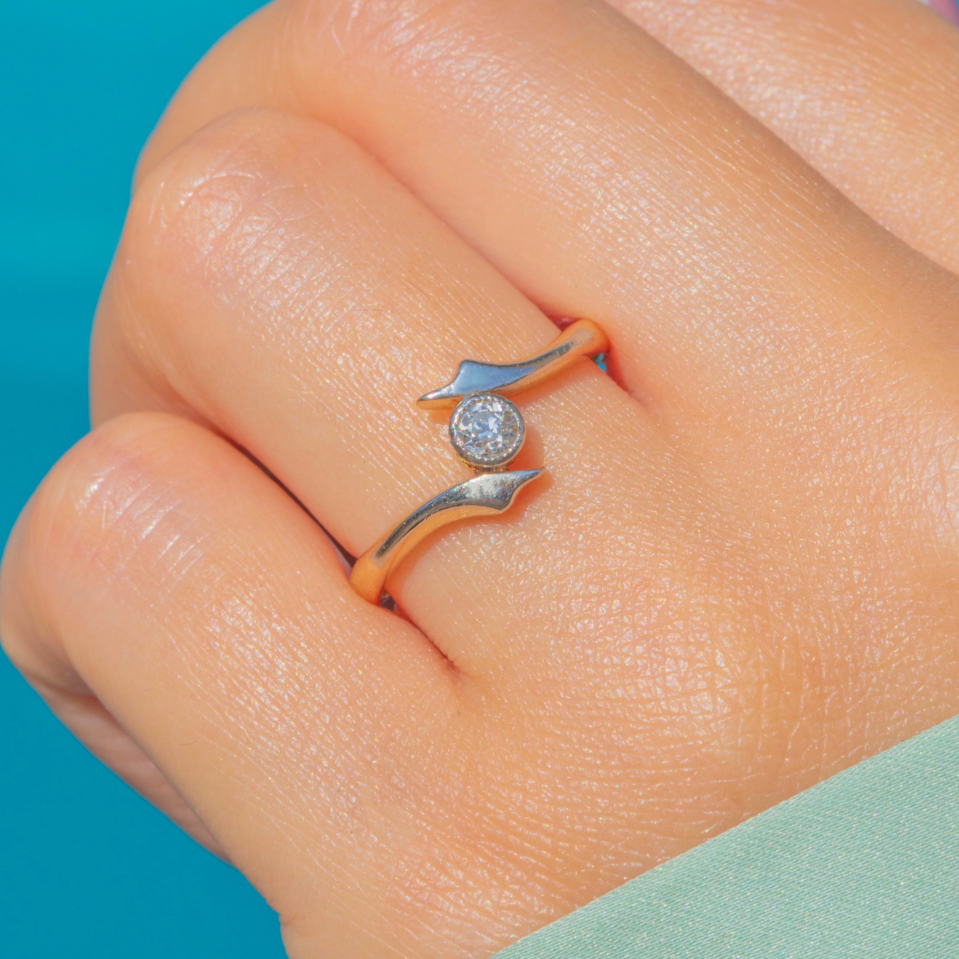 This Art Deco Diamond 'Twist' Solitaire Ring features a sparkling Diamond set in 18ct Gold with Platinum shoulders.