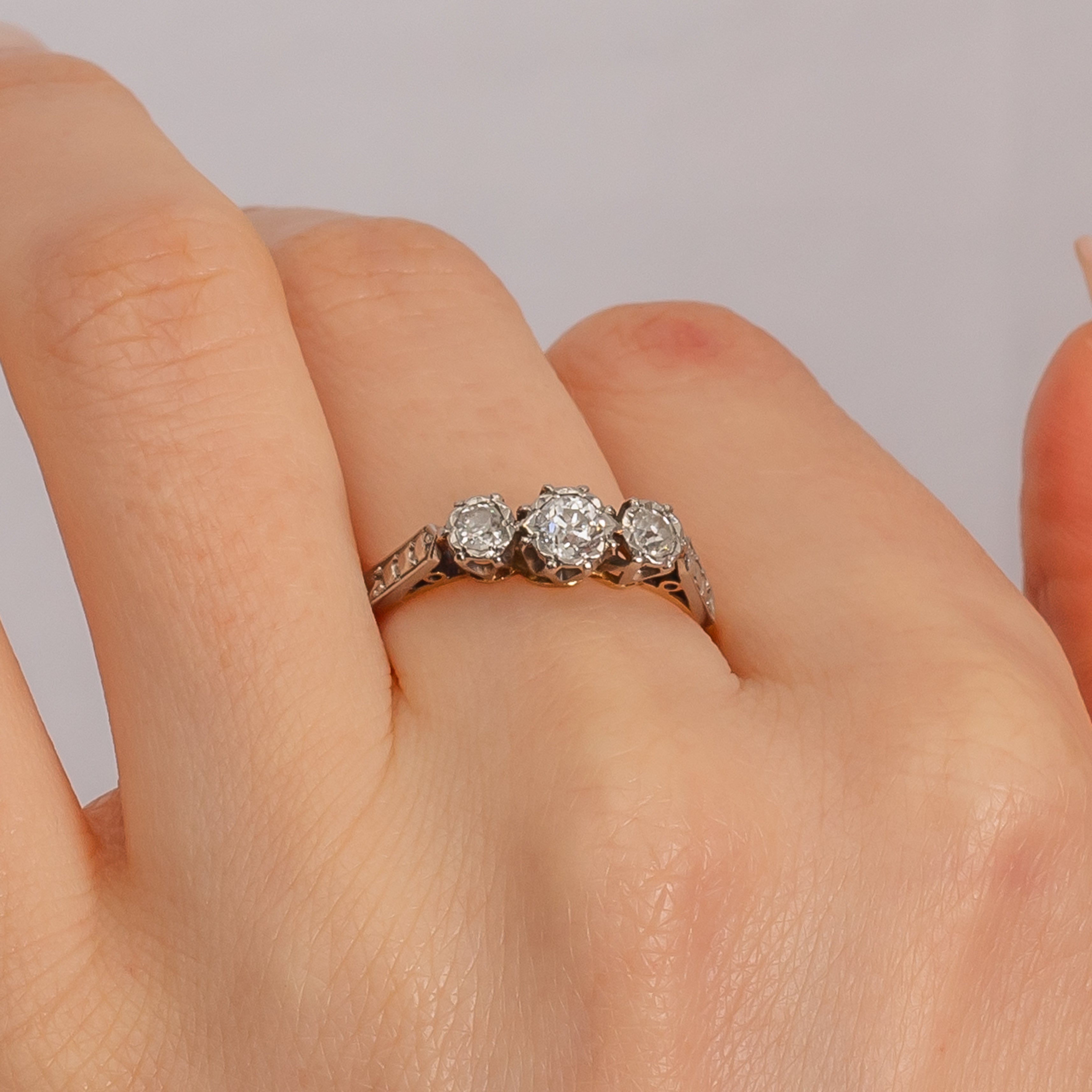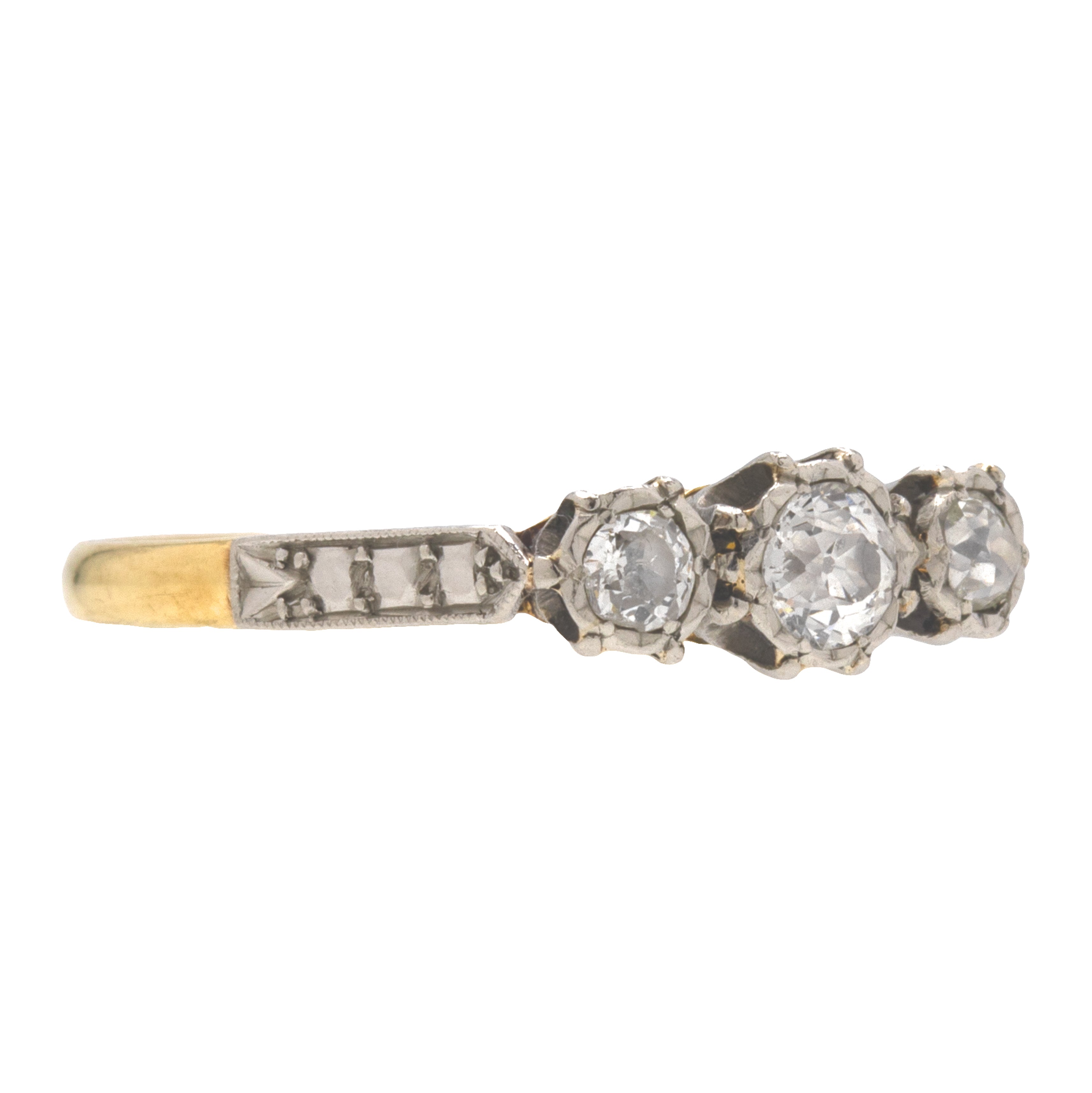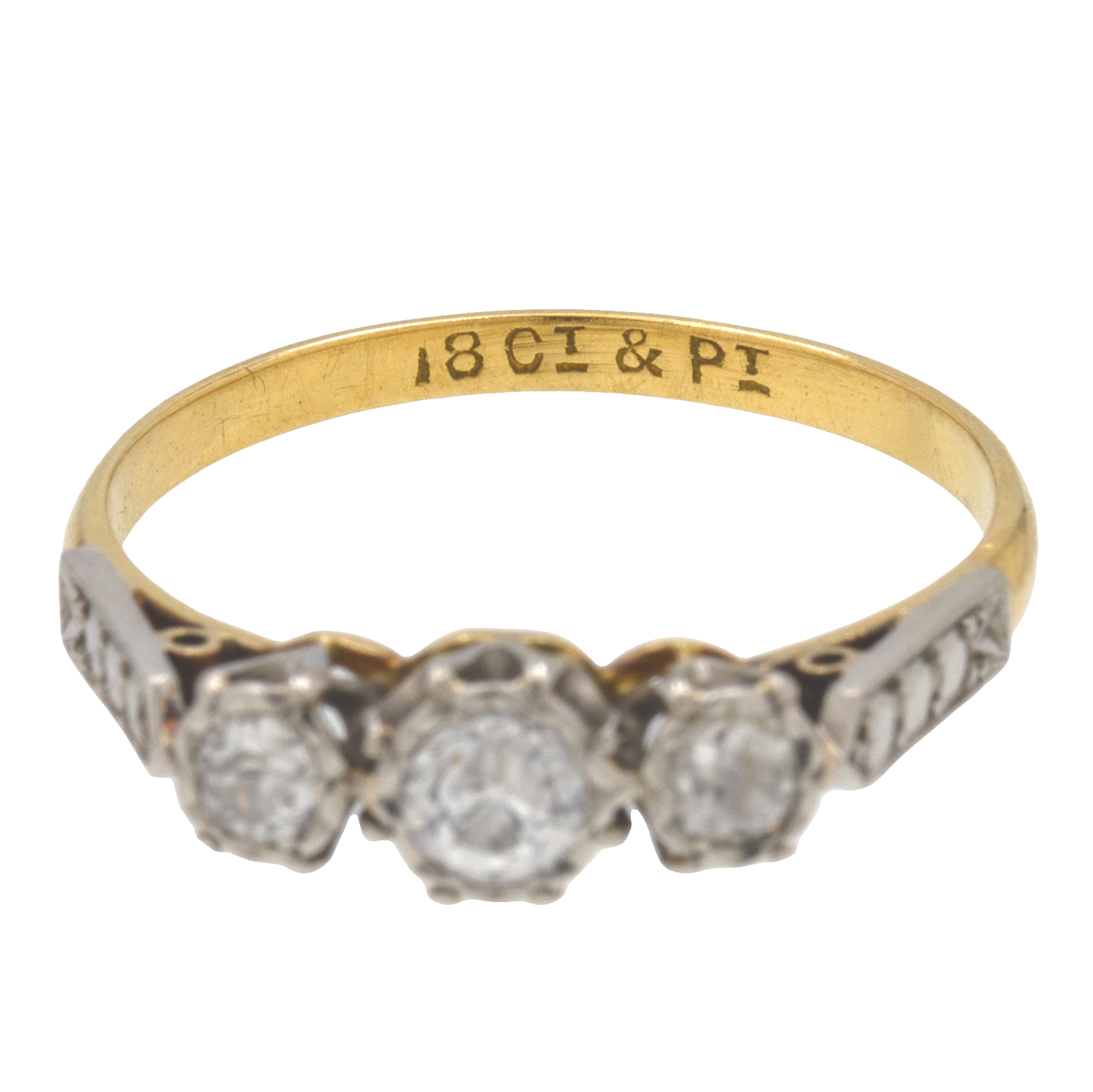 EXCELLENT. A sublime 18ct Gold Diamond trilogy ring is in excellent condition. Each of the dazzling Diamonds is secure within its Platinum setting and free from any chips or fleabites. There are clear stamps authenticating that this Deco delight is made of both 18ct Gold and Platinum. Her strong 18ct Gold band makes her suitable for daily wear and a perfect choice for an engagement ring.