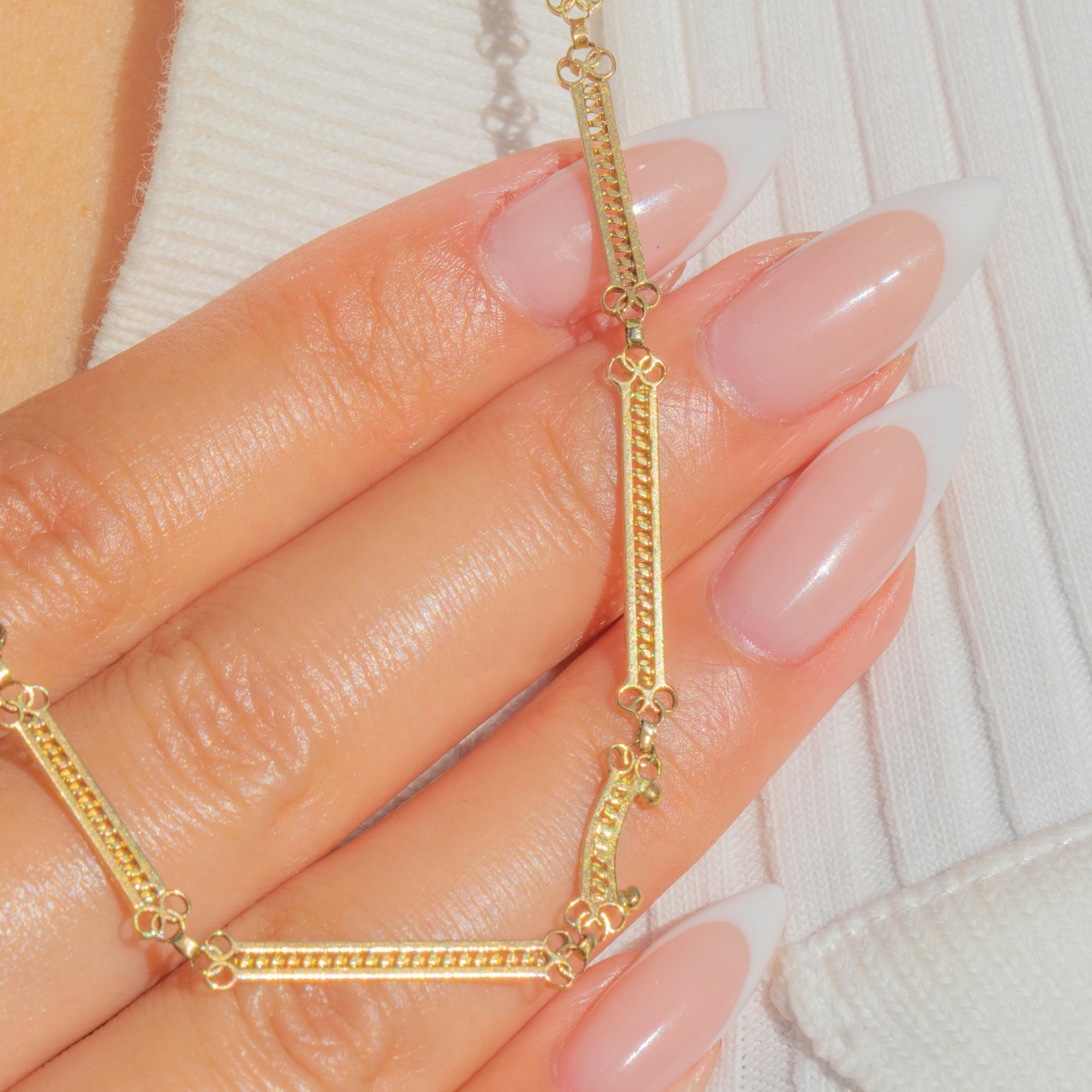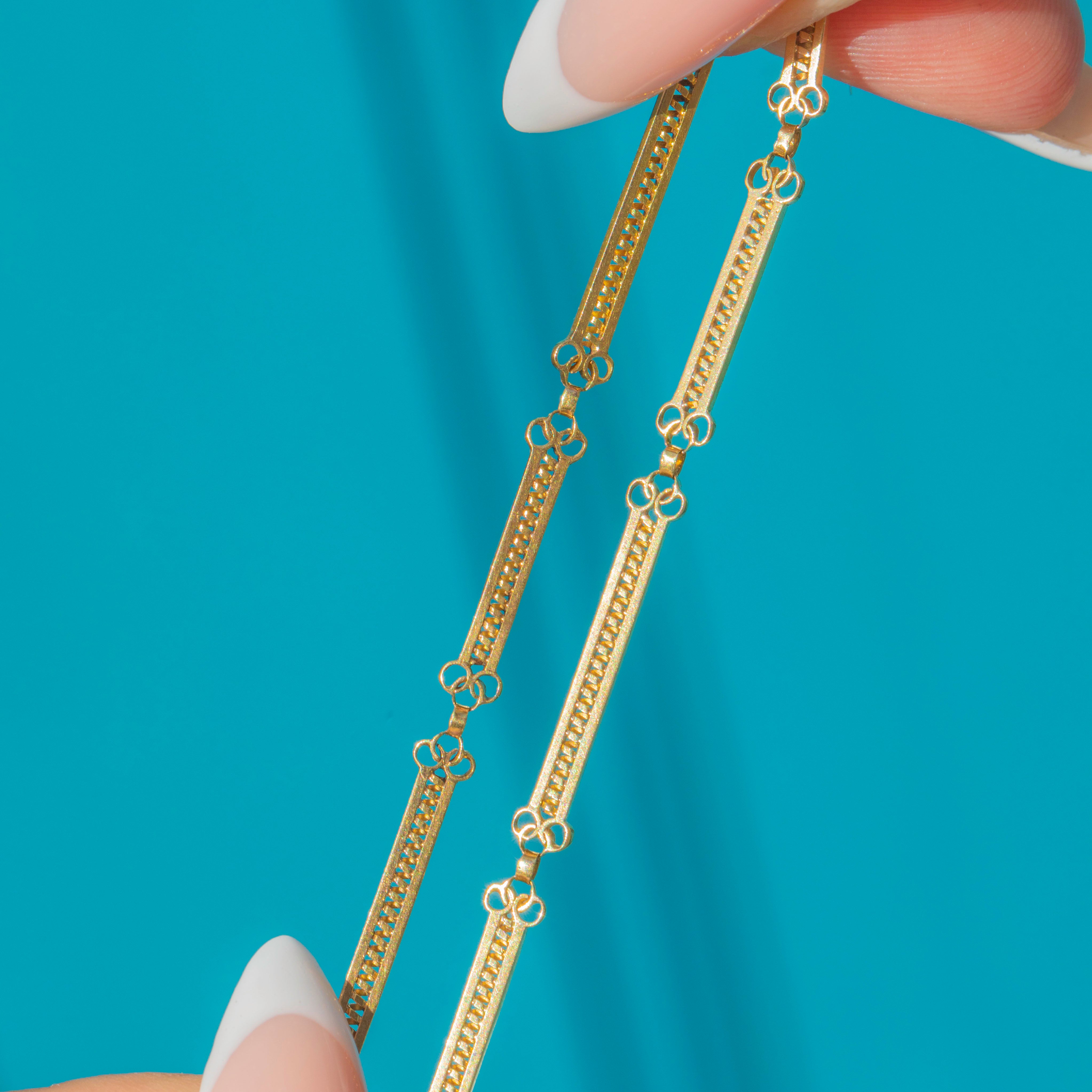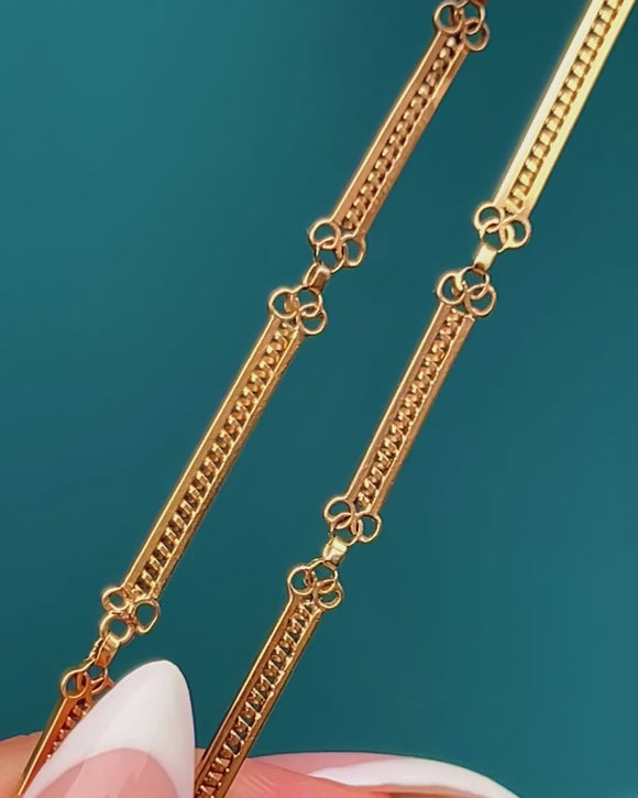 A stylish Art Deco chain necklace crafted in rich 18ct Gold, featuring fancy bar links with delicate beaded detailing. The design alternates long rectangular bars with round connecting links, creating a striking linear effect that embodies the sleek elegance of the 1920s and 1930s.