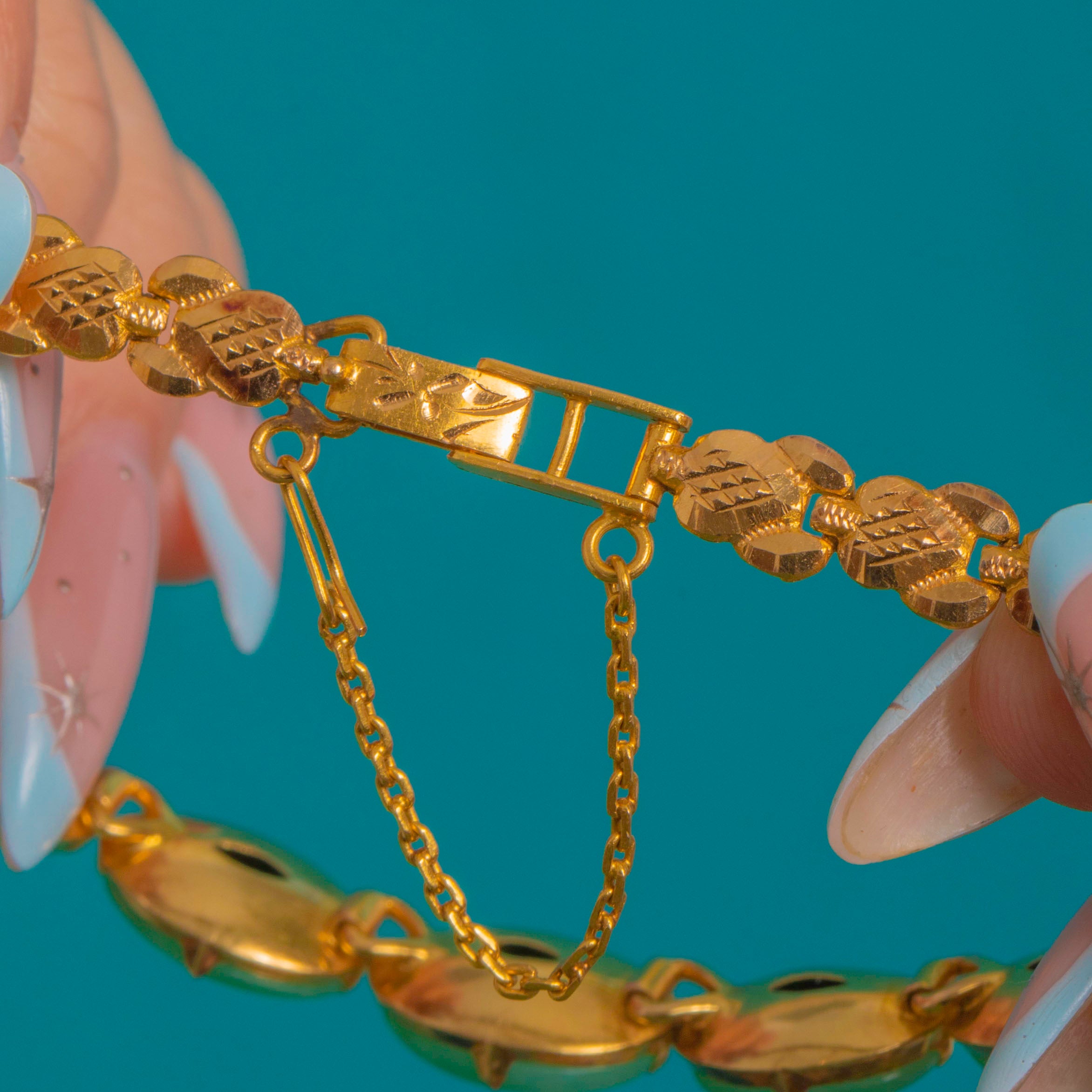The heart of the bracelet is Art Deco, with its refined, stone-led silhouette and gentle graduation through the centre, while later 18ct Gold link work with crisp machine-engraving and a secure box clasp brings the piece together for everyday wearability. Finished with a safety chain for peace of mind, it’s a timeless marriage of clean geometry and sumptuous colour.